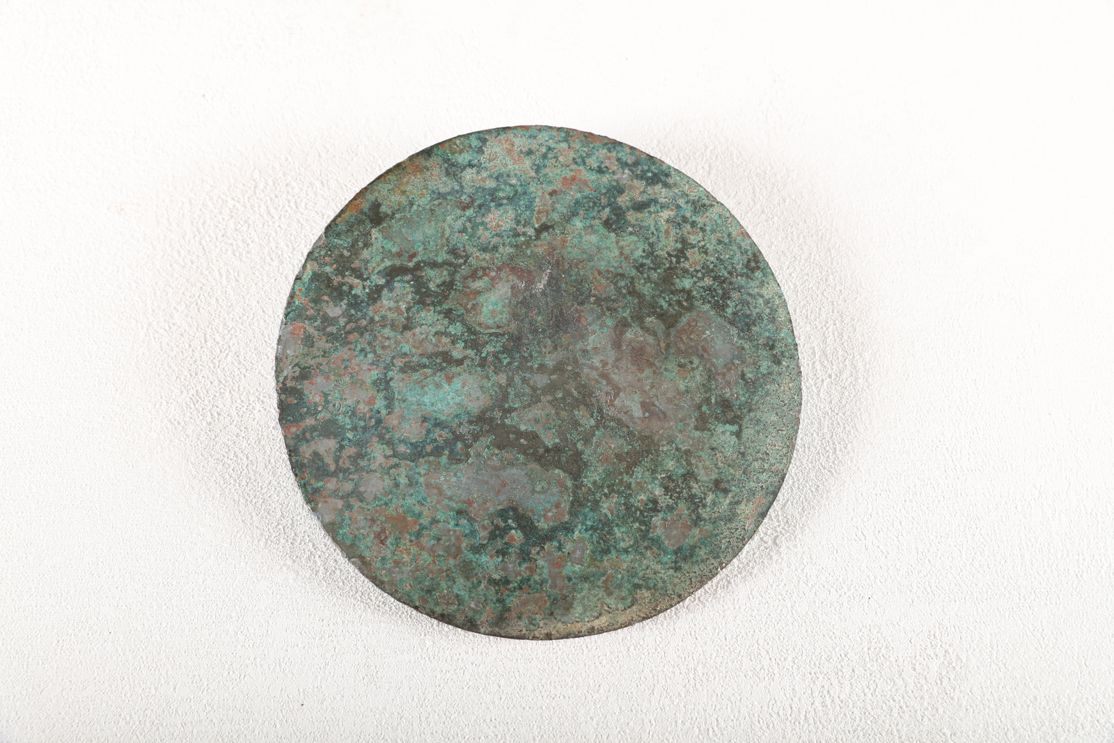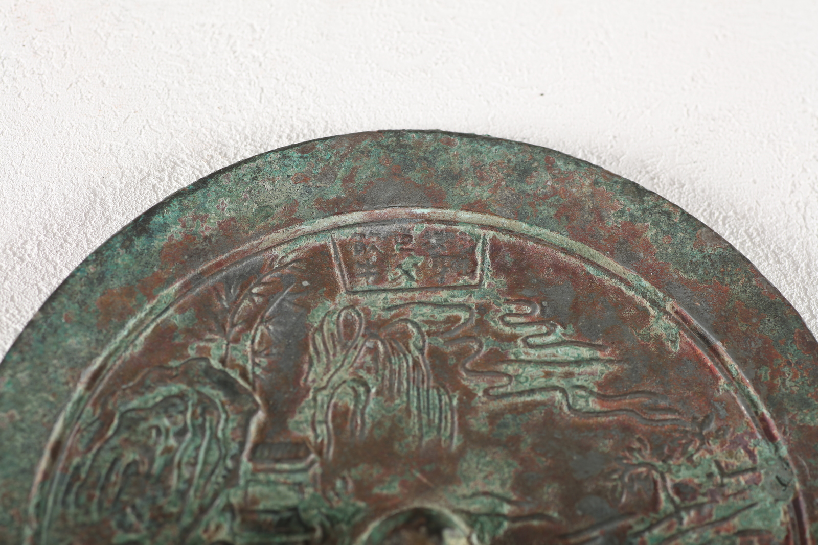 Arte Cinese A round mirror with a couple and an animal wandering in a pluvial landscape and bearing an iscription within a cartouche in the upper side China, Song dynasty. . Cm 13,00.