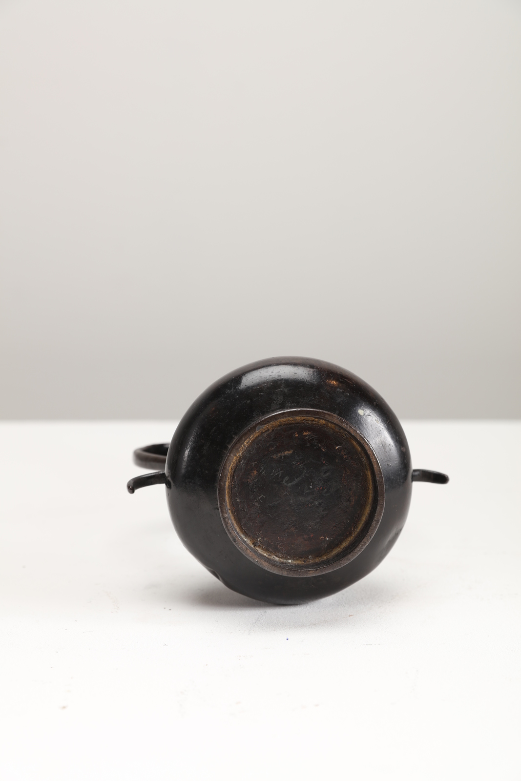 Arte Cinese Vaso in bronzo a patina scura con manici a forma di chilong Cina, dinastia Qing, XIX secolo. . Cm 25,50. Vaso poggiante su disco inciso con onde, presenta corpo globulare schiacciato ed alto collo leggermente svasato all'estremità che si raccorda con il corpo tramite fascia incisa con spirali squadrate.