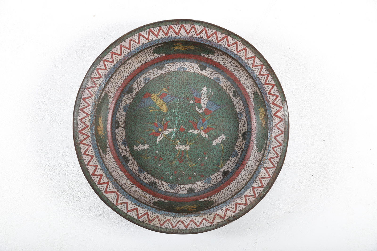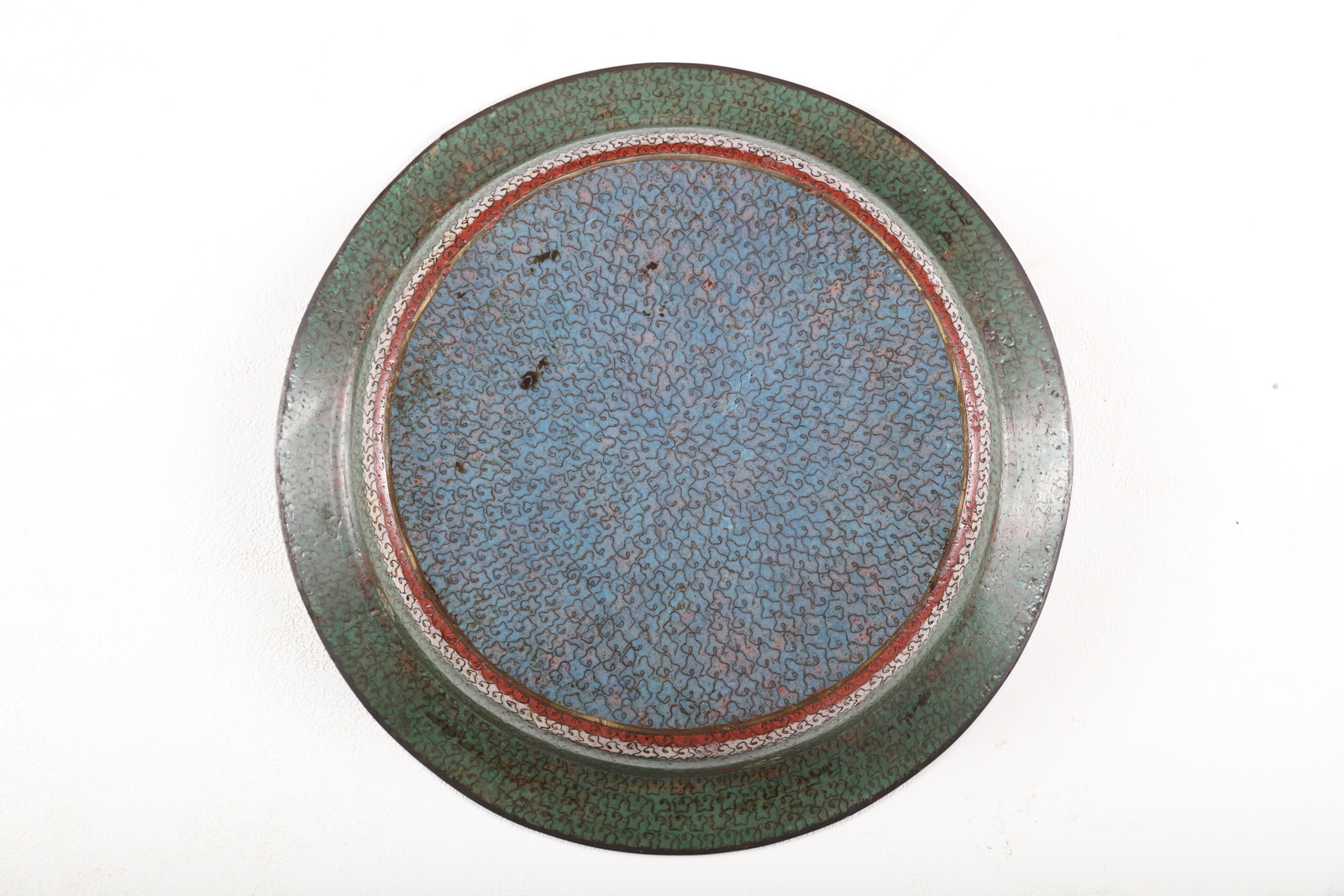 Arte Cinese Grande vassoio in metallo cloisonné decorato con fiori ed uccelli nel tondo centrale e quadrupedi entro riserve lobate nel cavetto