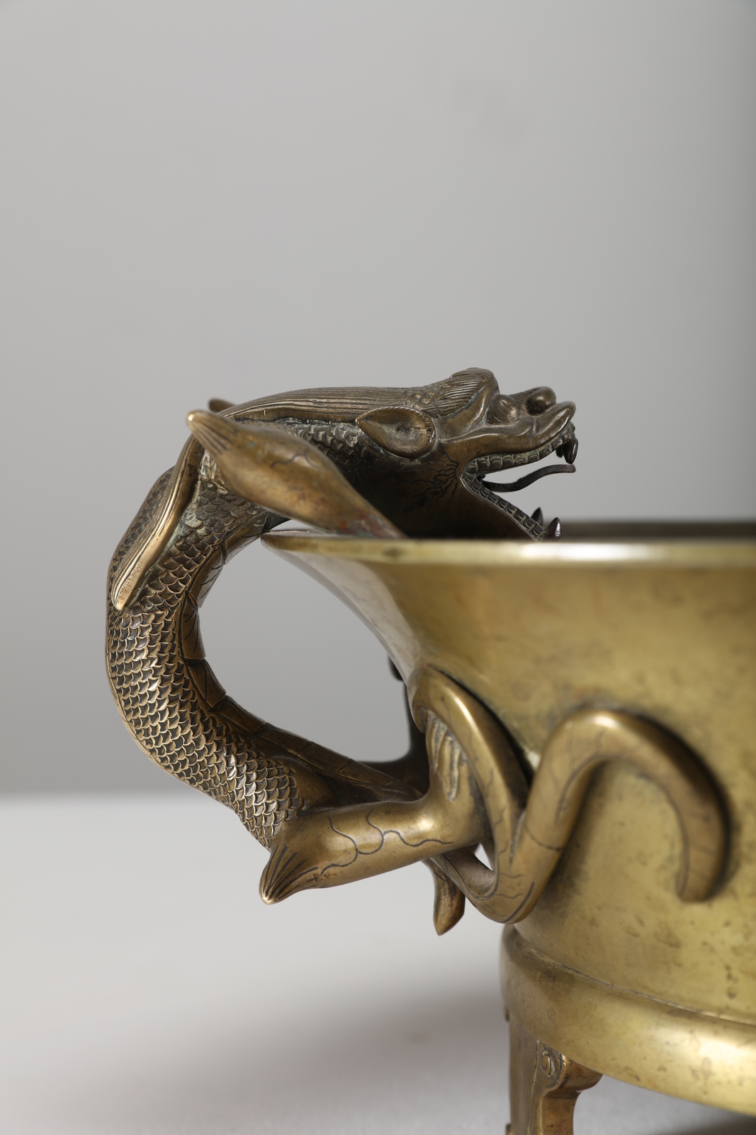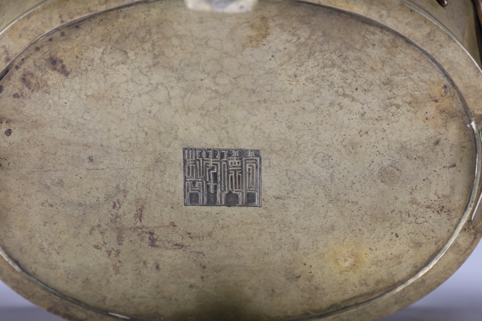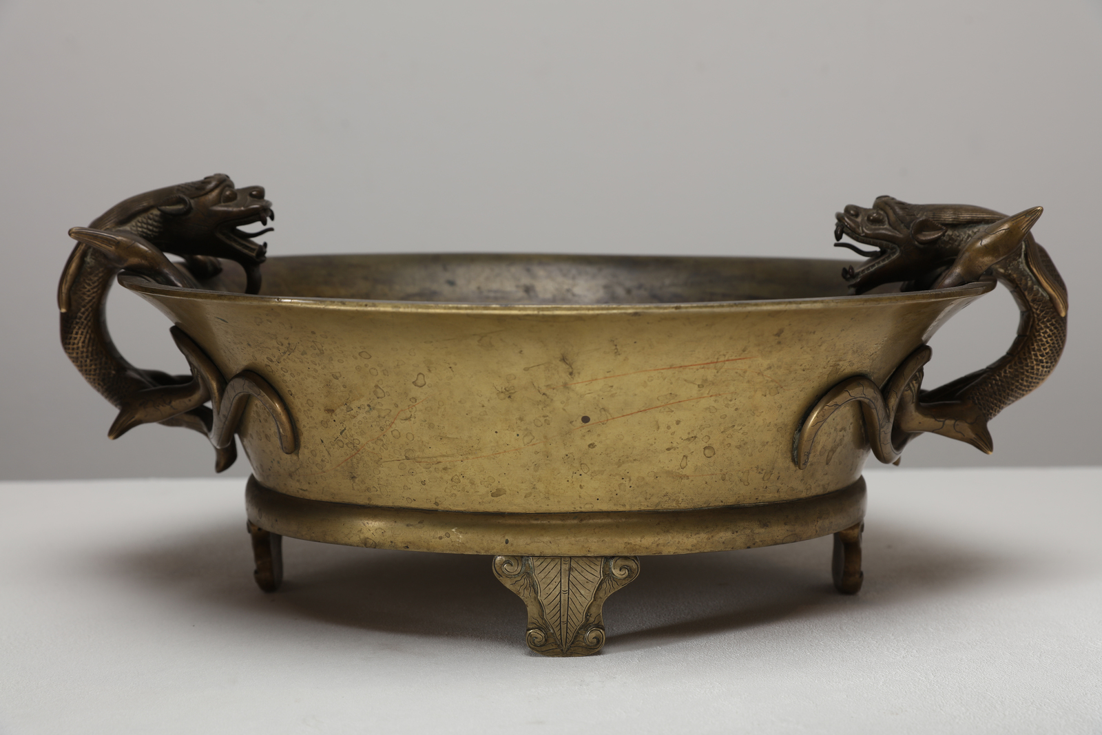 Cina, dinastia Qing, XIX secolo . . Cm 44,00 x 17,00. Fusione di forma ovale, poggiante su quattro piedini ed arricchita dai due manici sagomati in forma di chilong resi in maniera naturalistica.