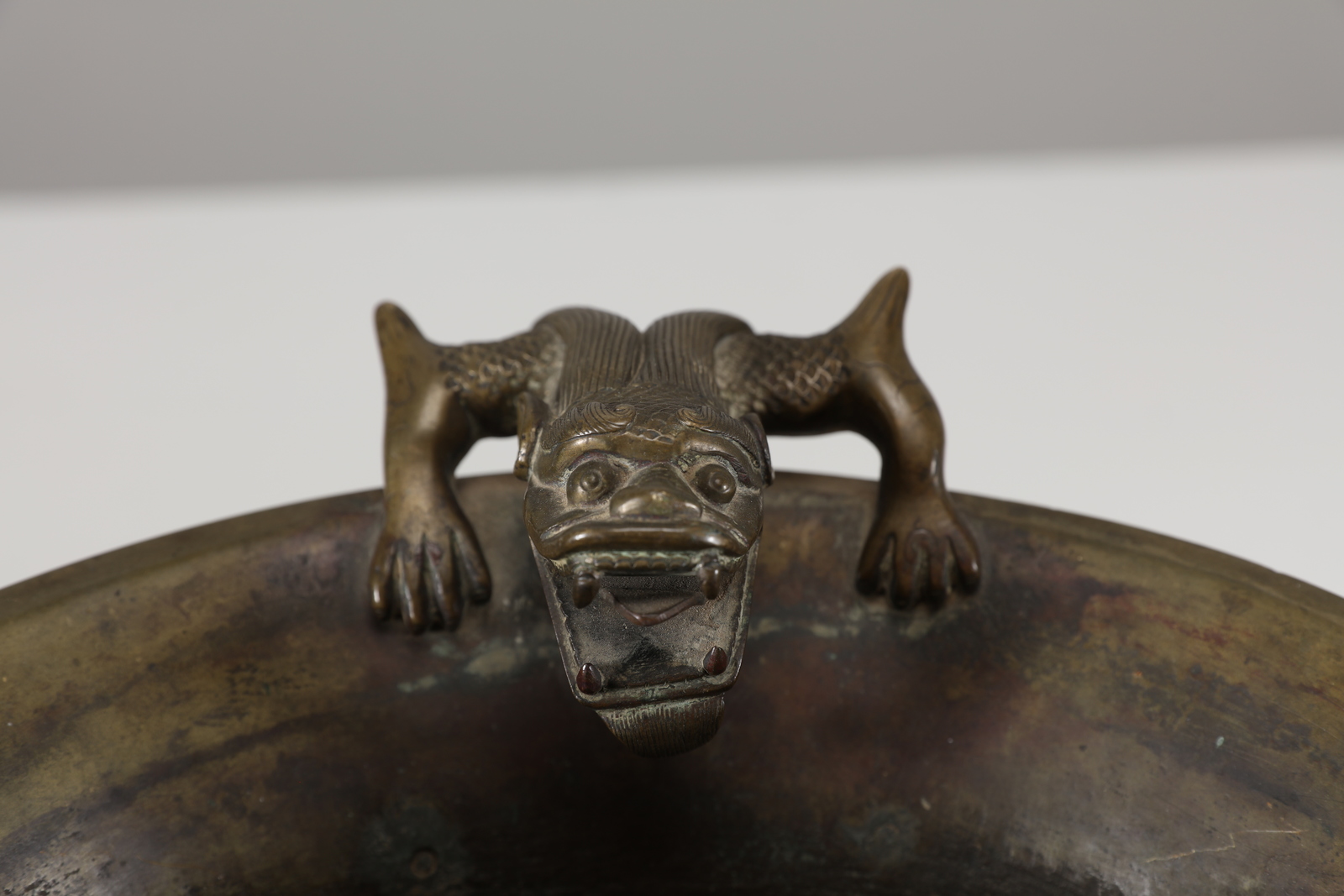 Arte Cinese Grande e pesante incensiere in bronzo con i manici a forma di chilong e marchio a sigillo Xuande sulla base.