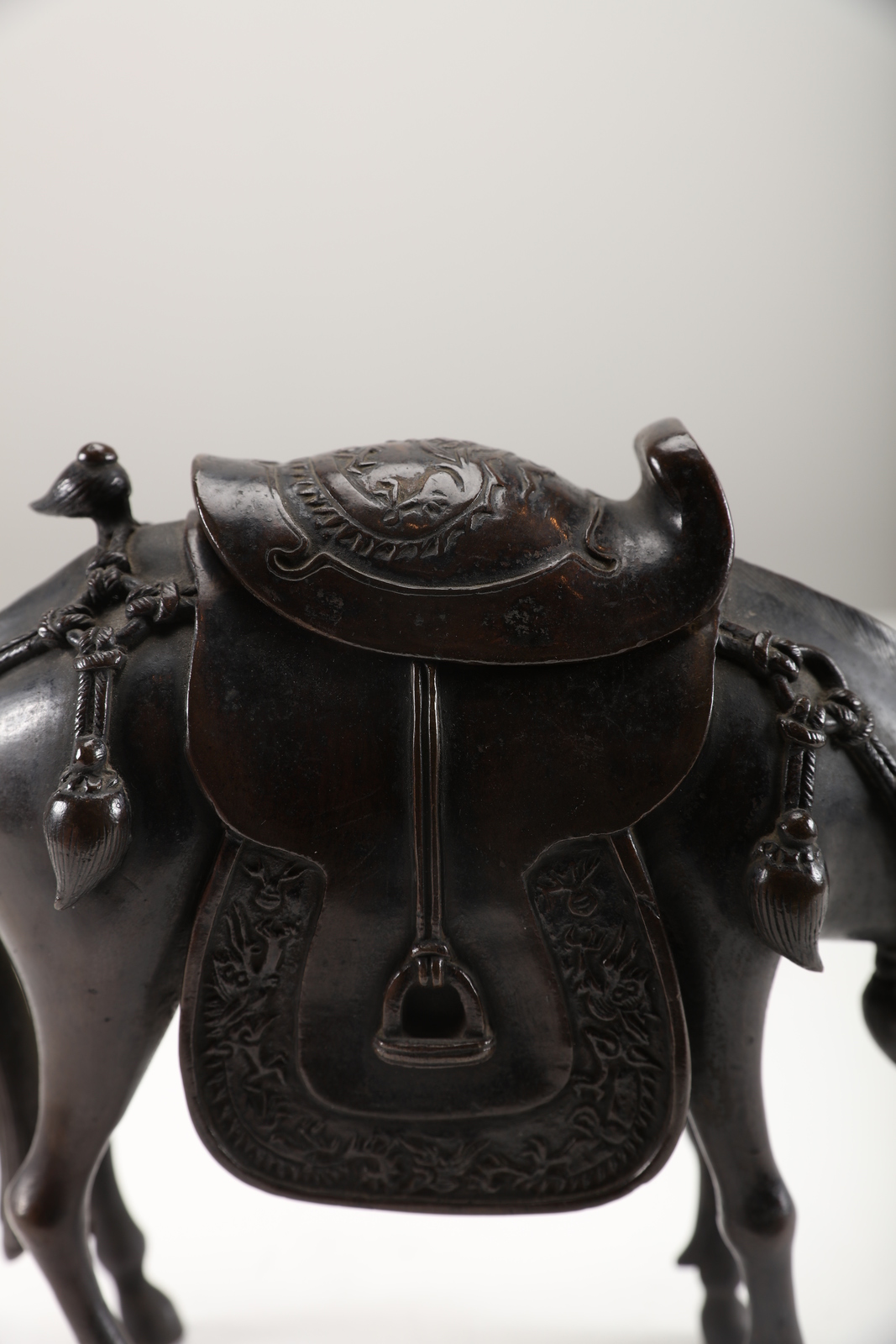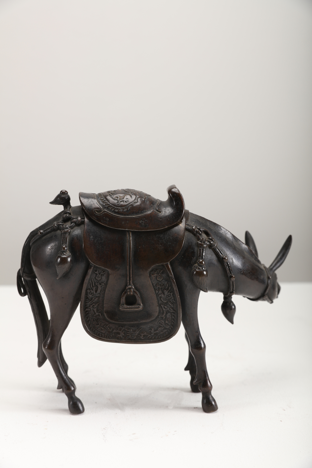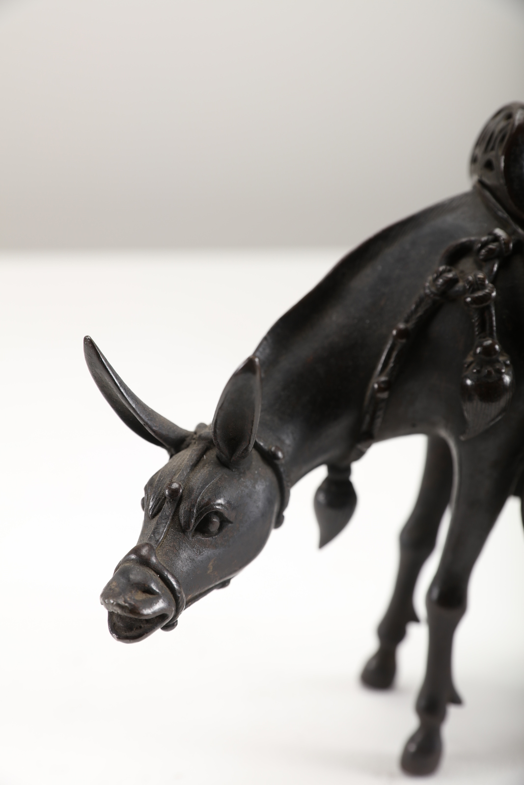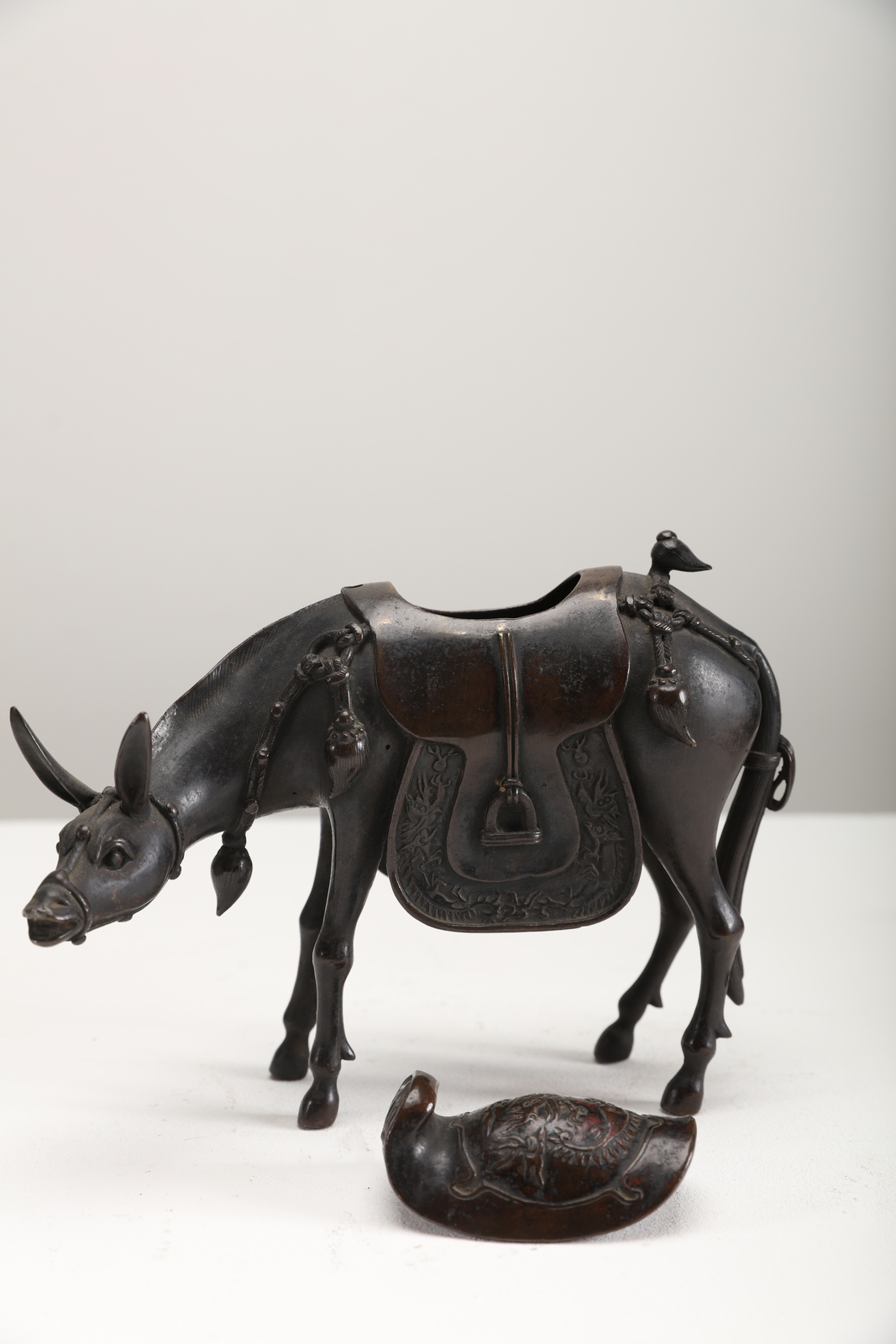 Cina, dinastia Qing, XVIII secolo. . Cm 24,00 x 19,00. Elegante incensiere in bronzo a patina scura raffigurante un asino in forma naturalistica. Curati i dettagli, soprattutto le cesellature della sella.