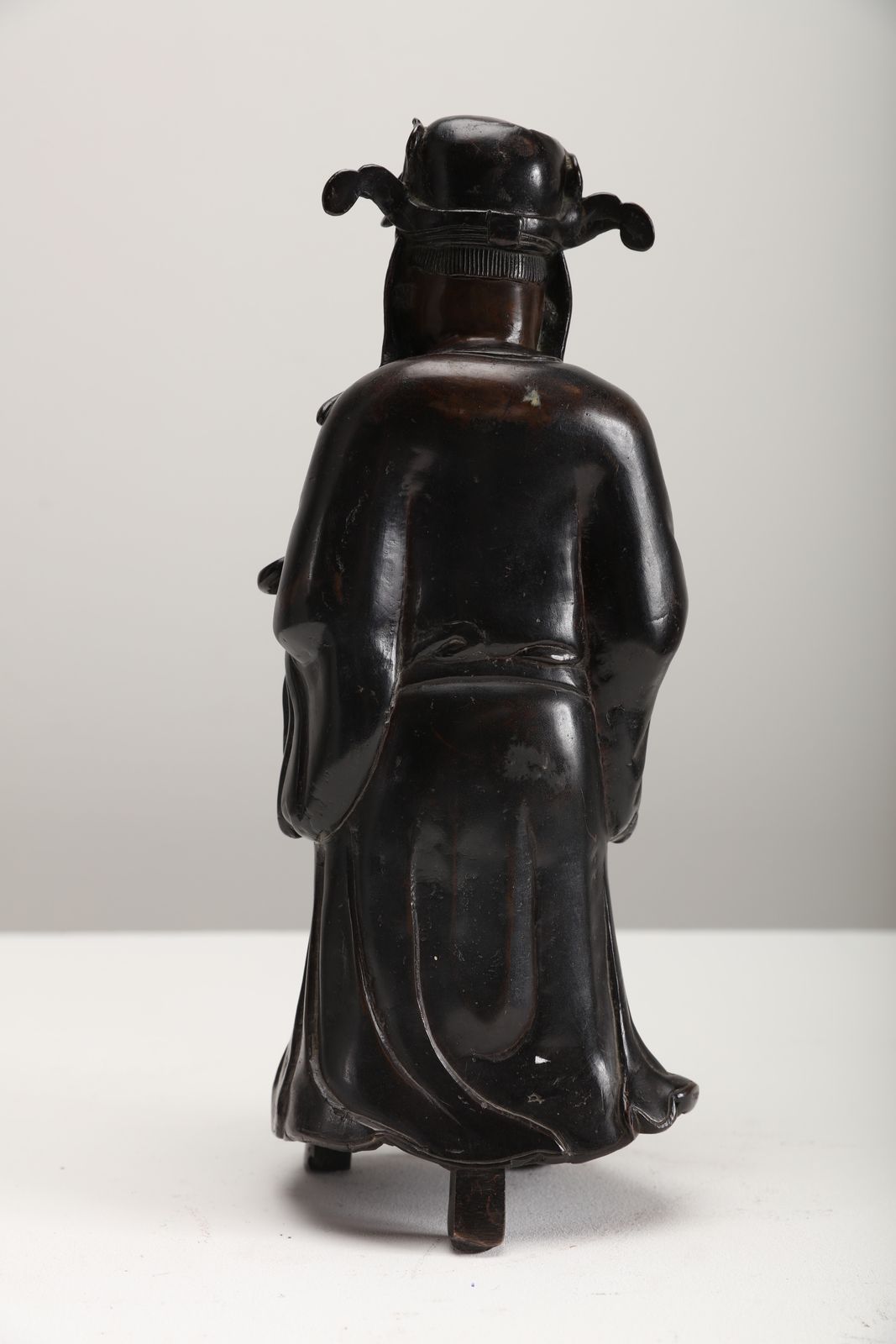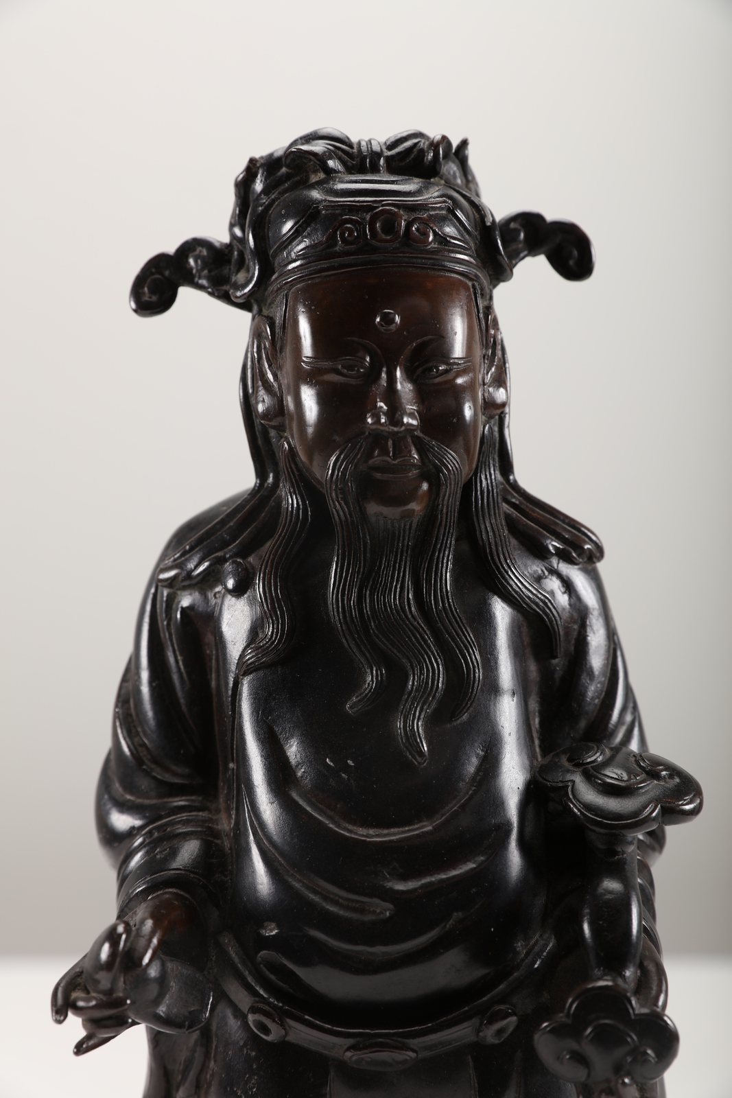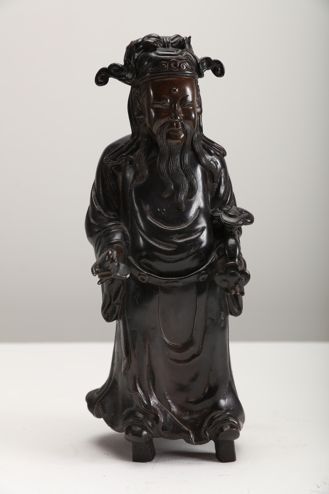 Arte Cinese Scultura in bronzo a patina scura raffigurante personaggio taoista con un ruyi in mano