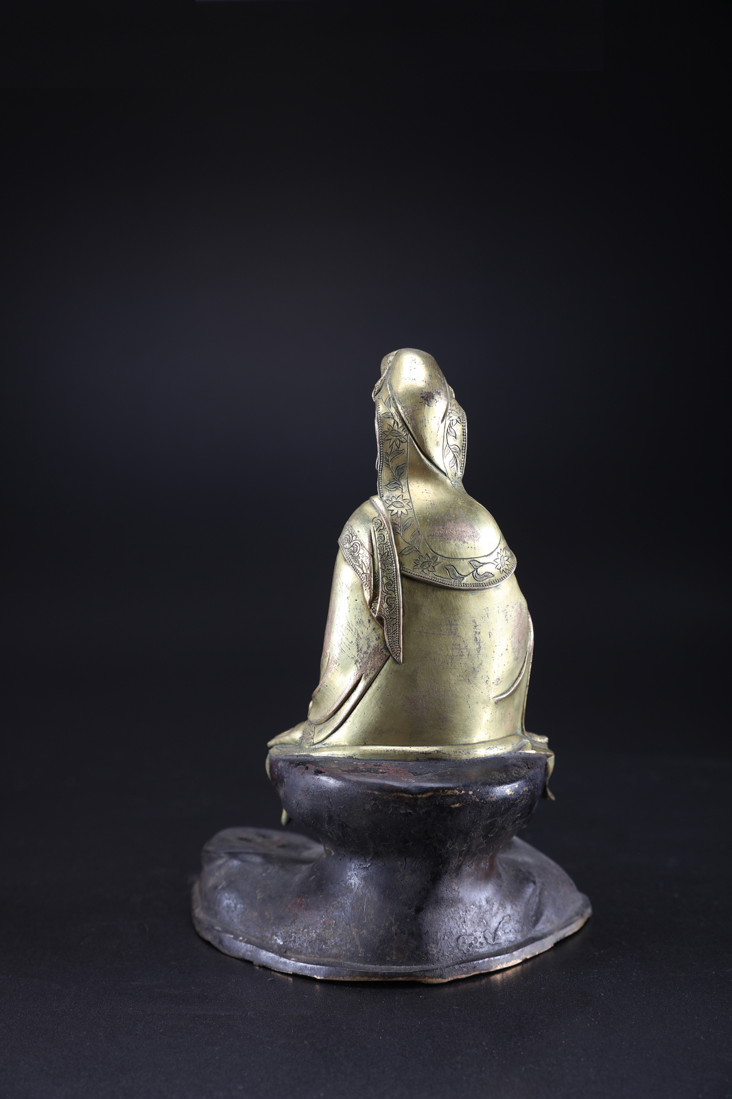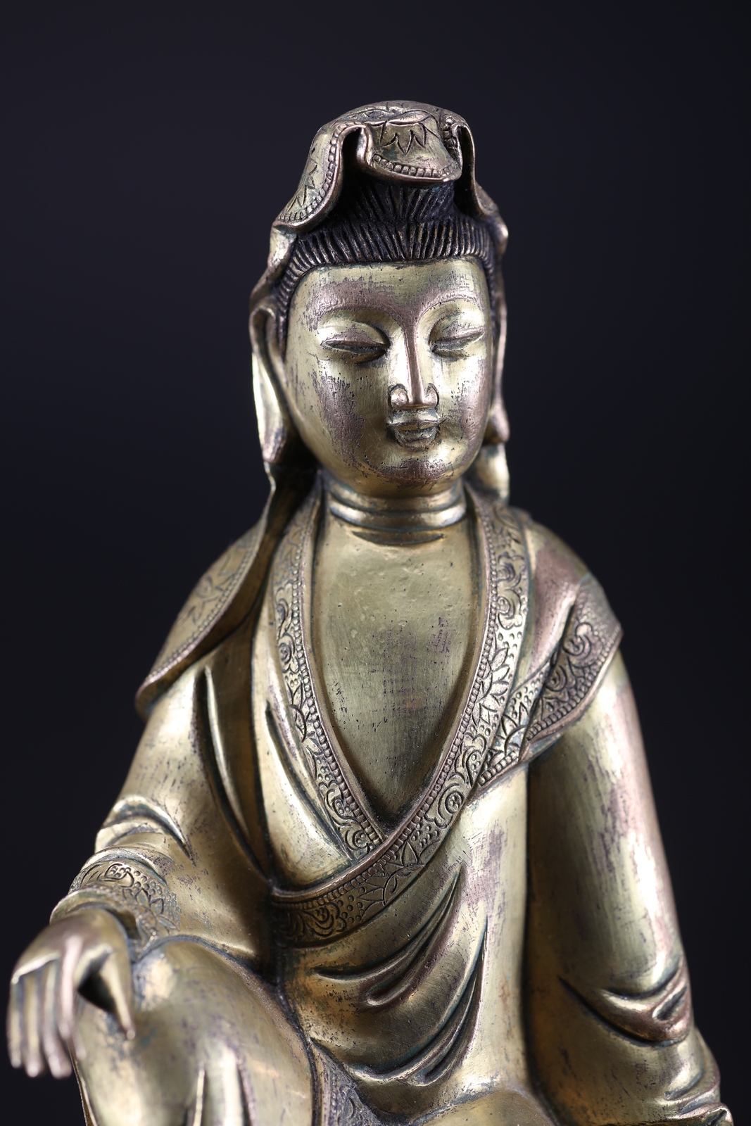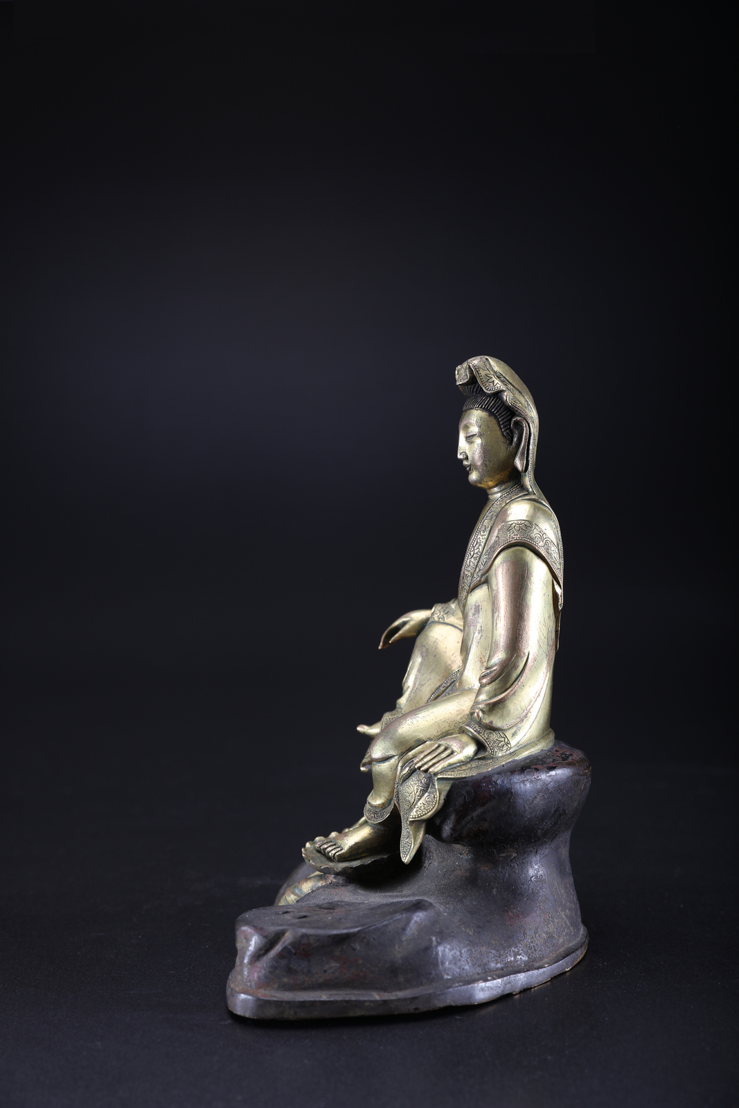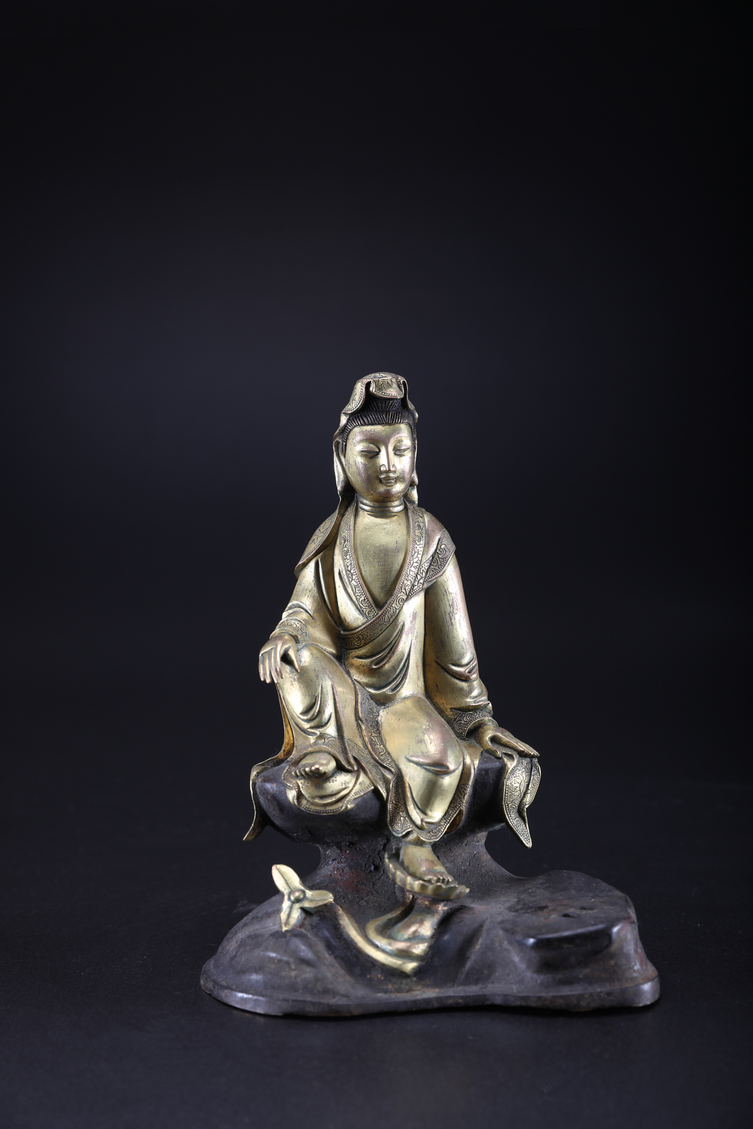 Arte Cinese A gilded bronze statue depicting Guanyin seated on a rock