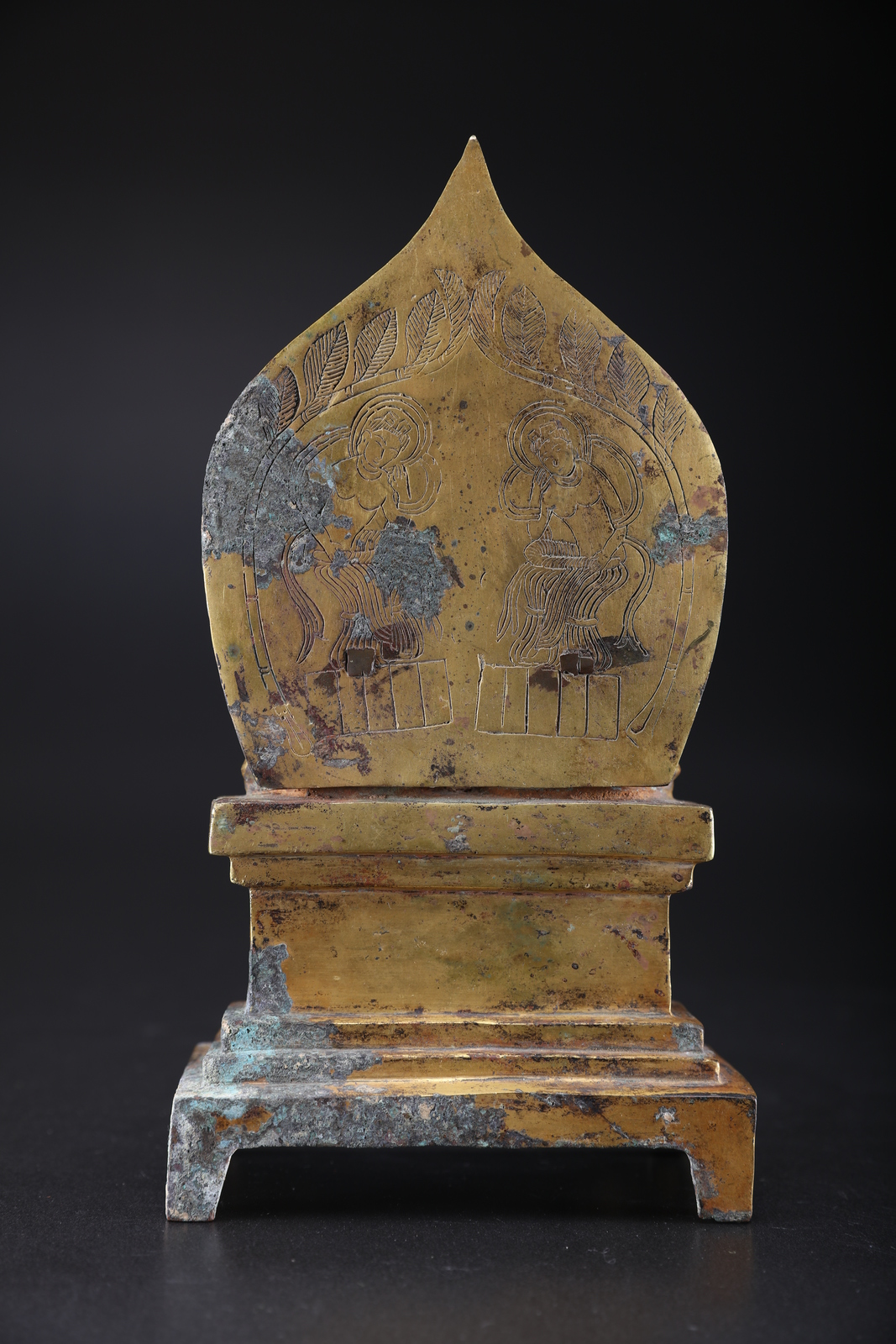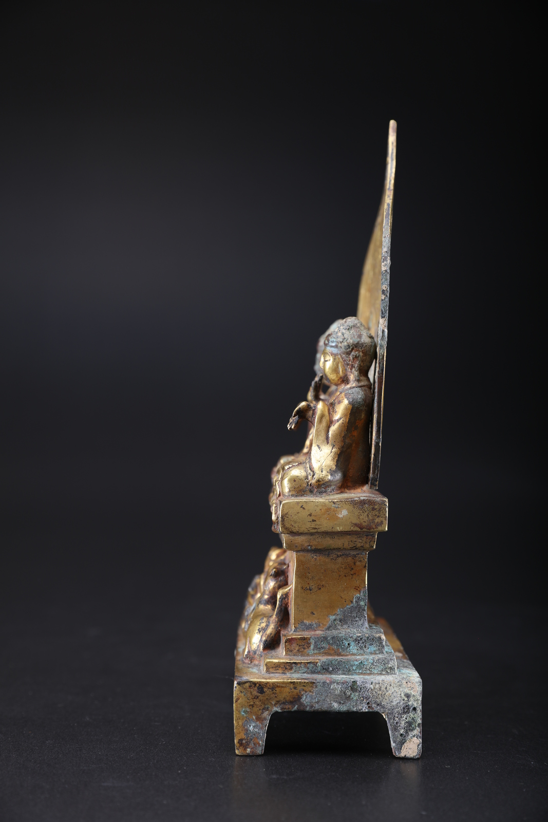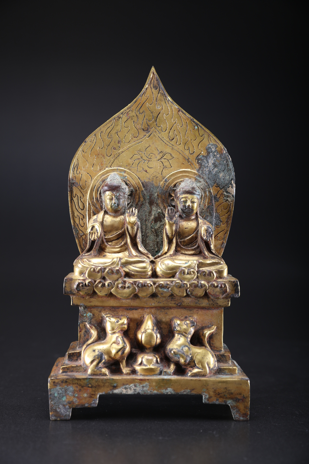 Cina, dinastia Tang o posteriore . . Cm 13,50 x 26,00. Altare in bronzo laminato in oro ritraente due buddha seduti in paryanka su un trono a base rettangolare decorato con due leoni delle nevi e un fiore di loto. I due personaggi mostrano le mani in gesti speculari: l'uno in abhayamudra e l'altro in varadamudra e si stagliano su un'aureola acuminata incisa con un fiore di loto e fiamme stilizzate. Sul retro dell'aureola sono presenti due figure ritraenti presumibilmente il Buddha del futuro Maitreya protetto da alberi a foglie larghe.