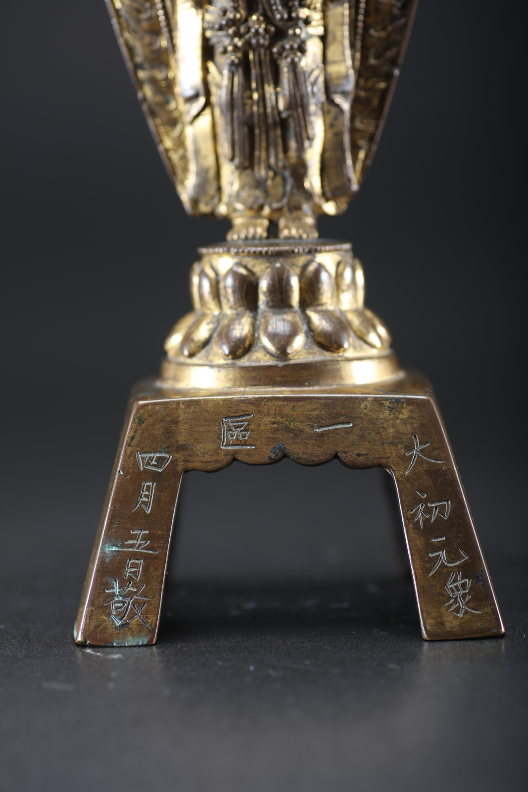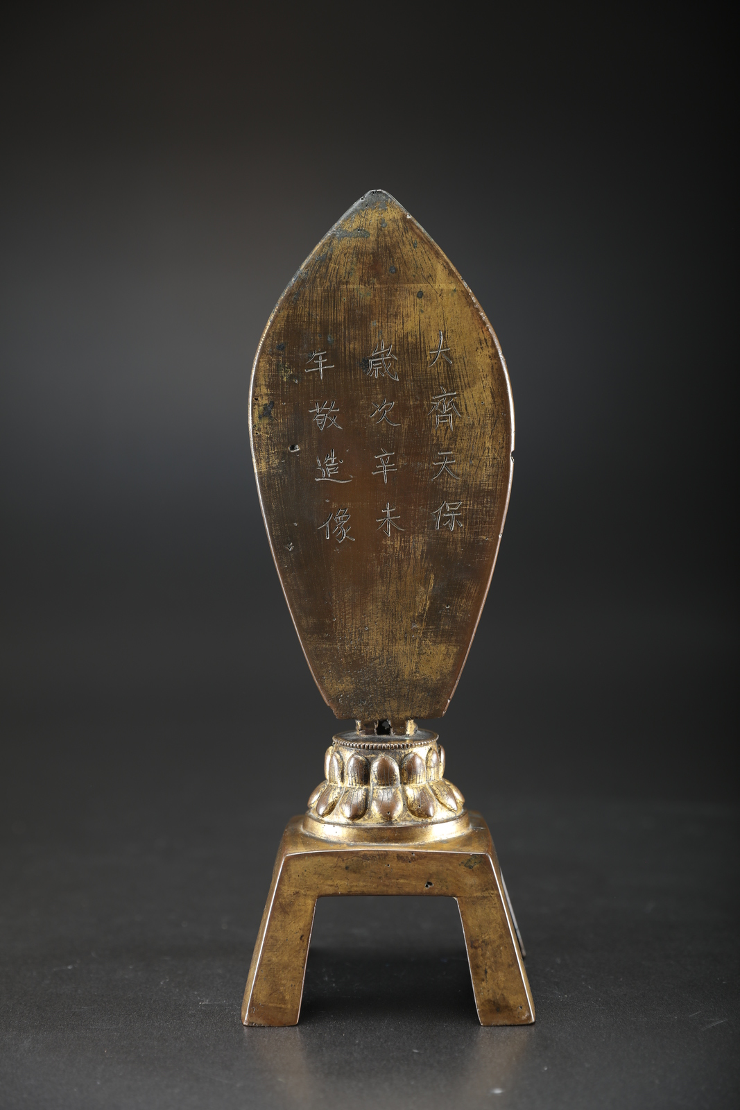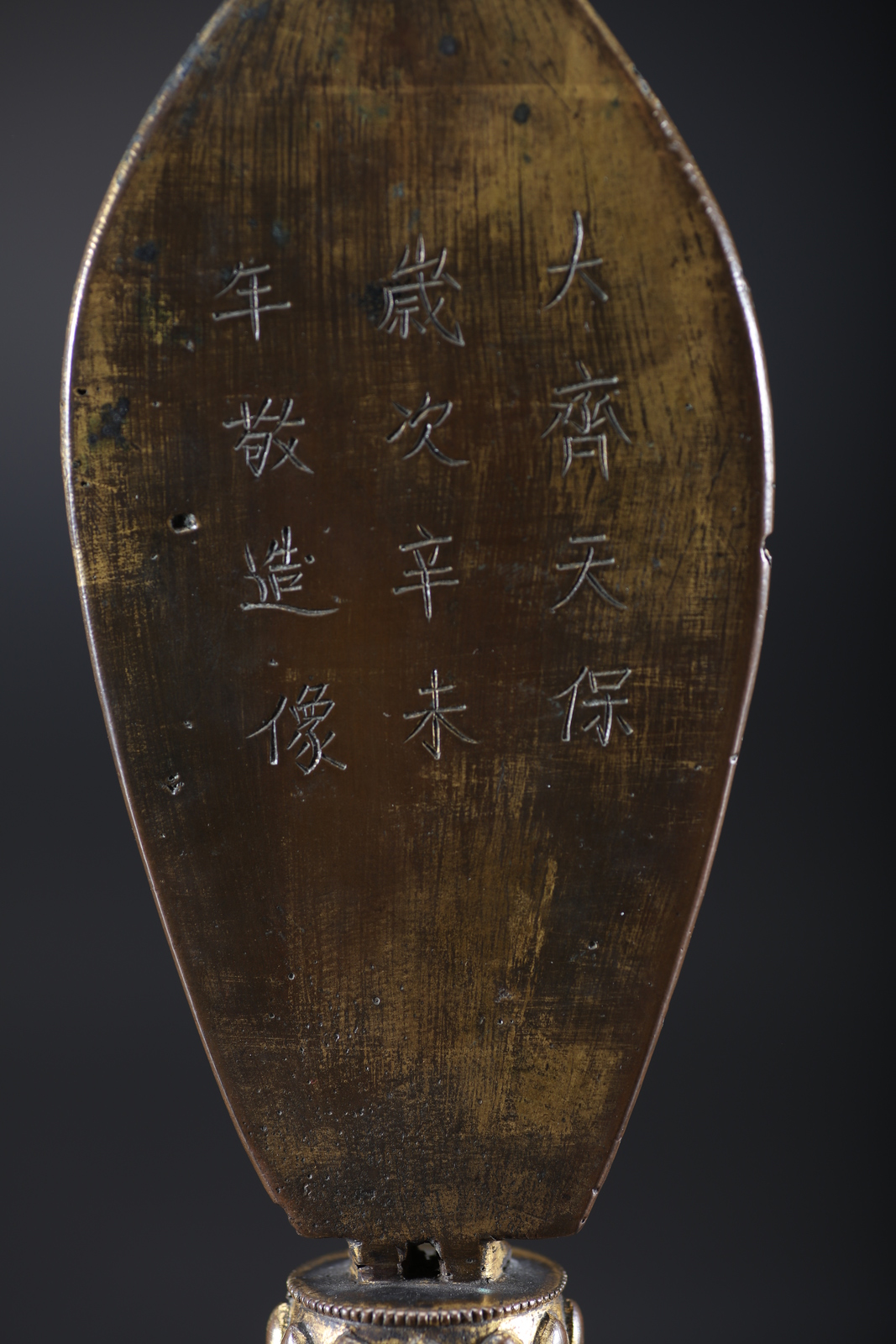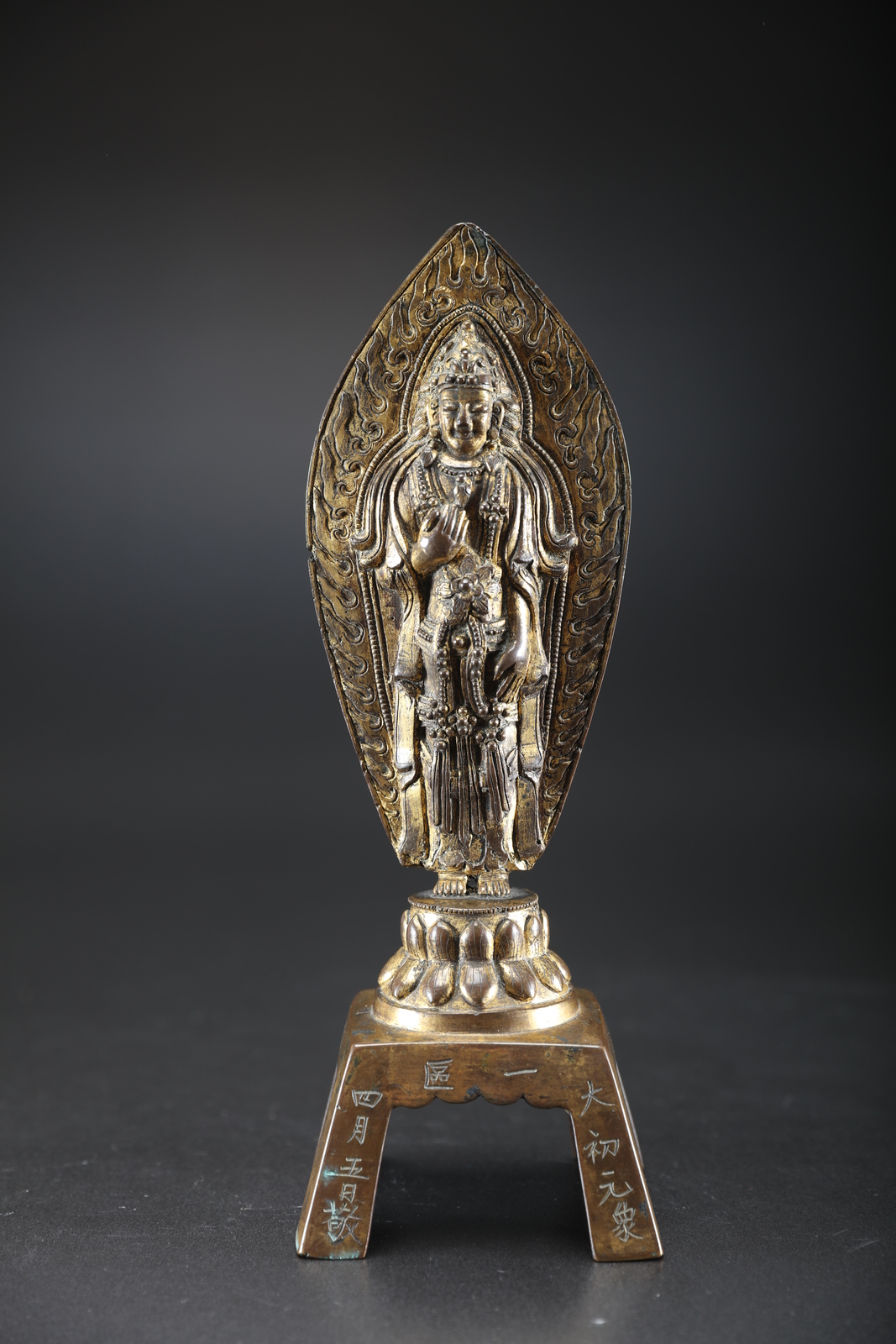 Arte Cinese A gilded bronze dated stele depicting a bodhisattva with flaming halo and bearing incised inscriptions on the square base and at the rear of the halo