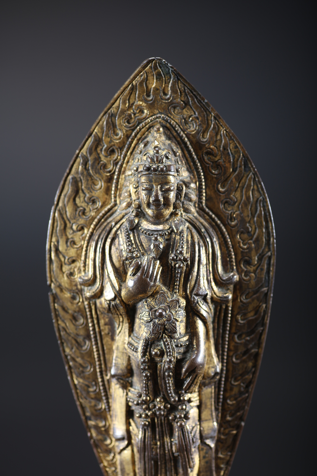 Arte Cinese Stele in bronzo dorato raffigurante un bodhisattva entro aureola fiammeggiante