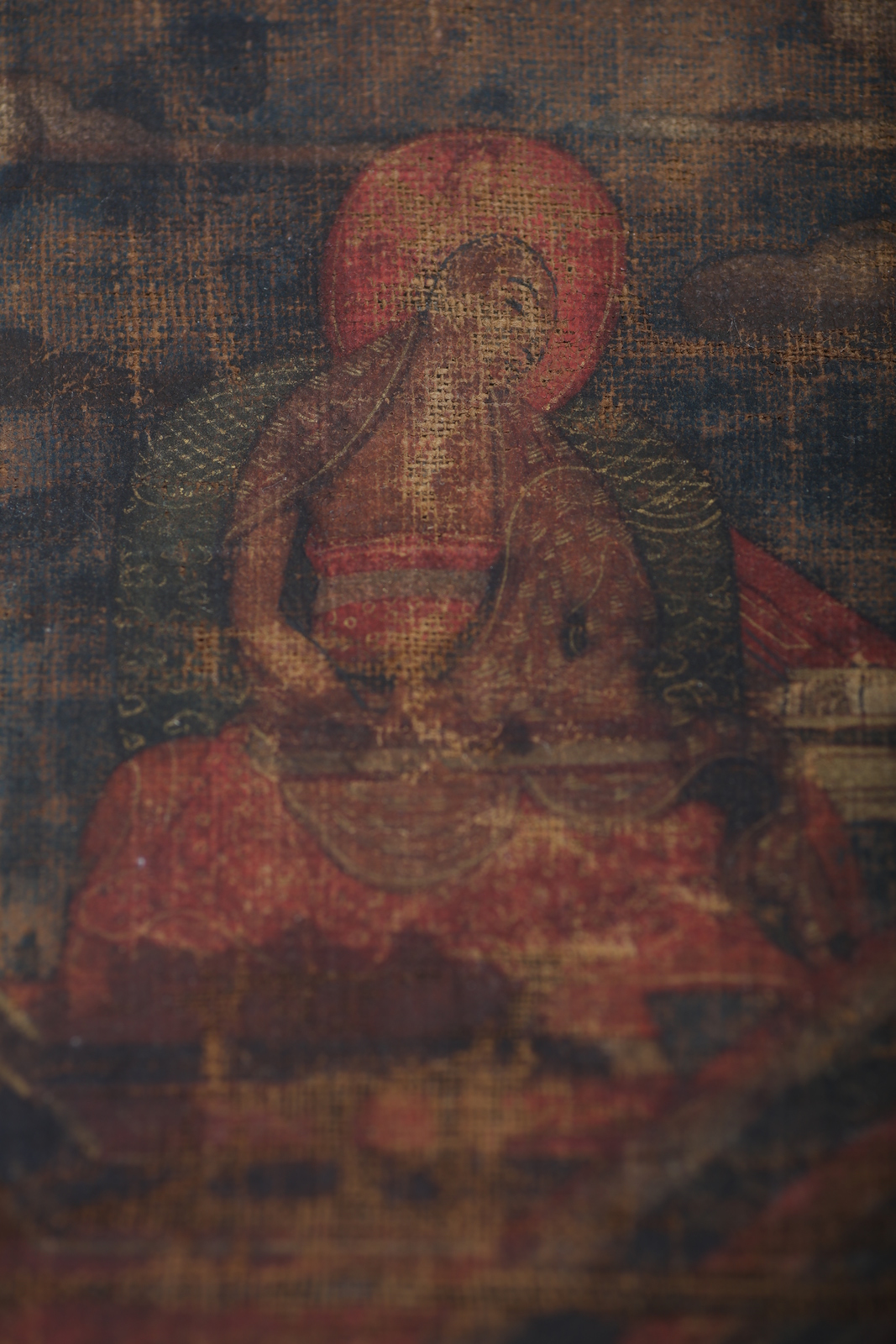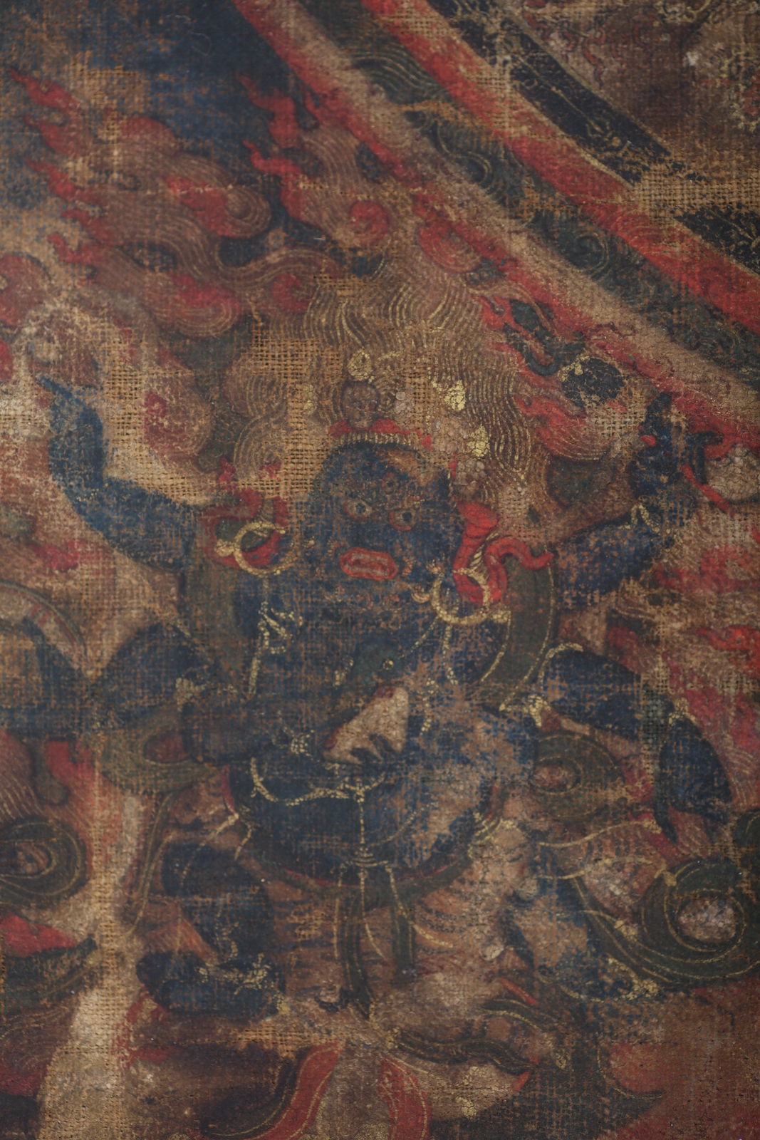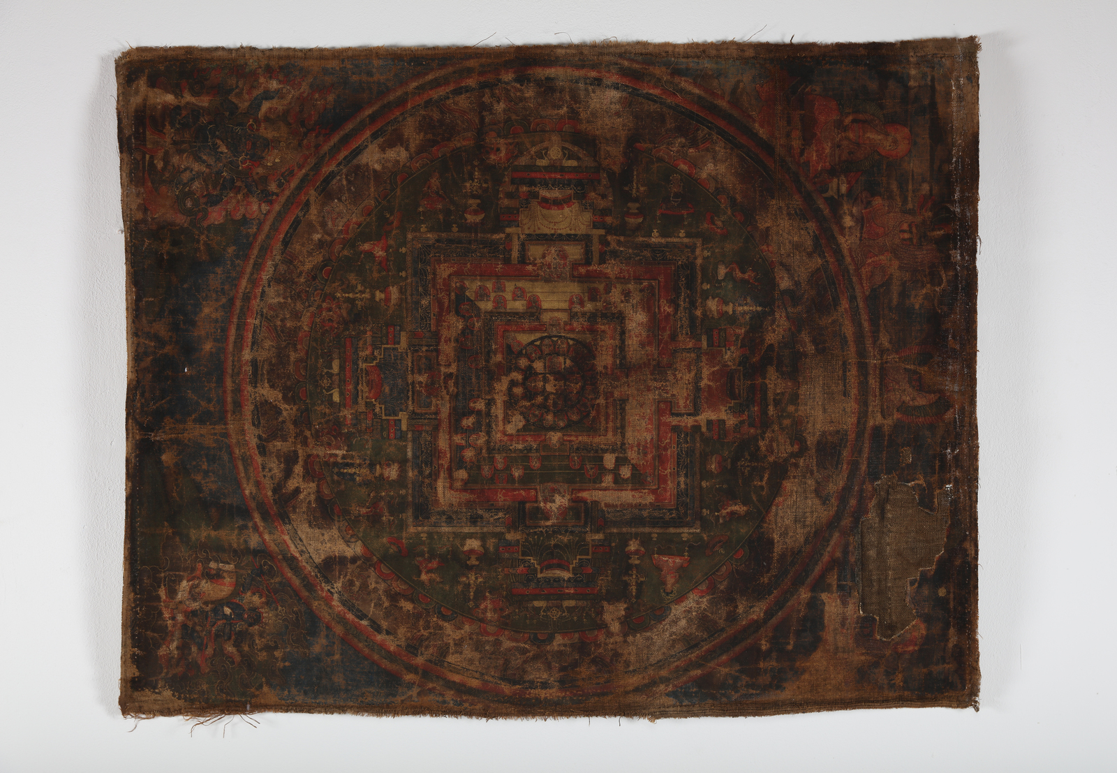 Arte Himalayana Mandala dedicato ai cinque Buddha Trascendenti Nepal, XV secolo. . Cm 51,40 x 66,20. All'interno di una struttura geometrica a quattro vie sono ritratti i cinque Buddha Trascendenti, ovvero: Vairokana, protettore del centro e gli altri quattro posizionati secondo i loro punti cardinali di protezione: Aksobhya (est), Ratnasmbhava (sud), Amitabha (ovest) e Amoghasiddhi (nord). In un cerchio secondario potrebbero essere rappresentati i Dikpala, anche loro protettori dei punti cardinali. Ai due angoli nel registro inferiore sono presenti due Dharmapala: a sinistra Mahakala nella sua versione a sei braccia e a destra la dharmapala femminile Palden-llhamo. All'apice della composizione è raffigurato il Buddha storico Sakyamuni ed alcune figure non identificate, probabilmente Arhat. Danni.