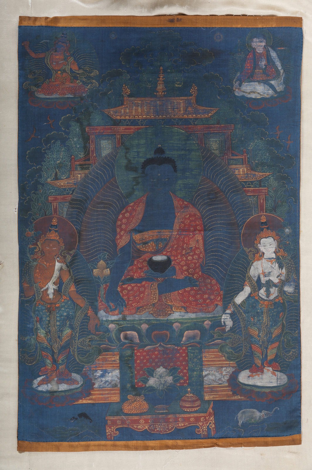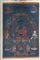 Cino/Tibet, inizi XIX secolo. -. Cm 60,00 x 83,00. Dipinto su seta raffigurante il principale degli otto Buddha della medicina inserito in una pagoda rifinita in oro. Il personaggio tiene nelle mani una ciotola ed un tralcio con boccioli di loto ed è accompagnato da quattro figure di cui due laterali in postura stante; Avalokitesvara, Samantabhadra ed il maestro Padmasambhava e Manjusri nella porzione superiore della composizione.