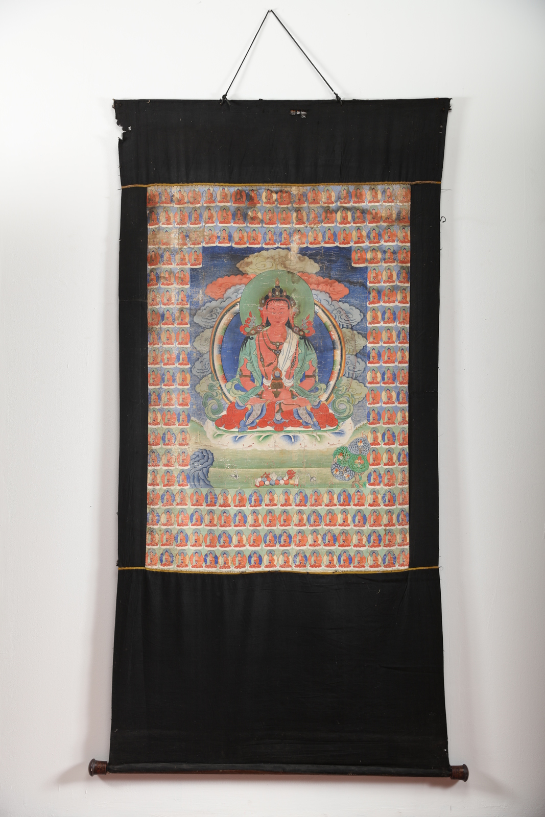 Tibet, fine XVIII secolo . -. Cm 78,50 x 161,00. Pittura policroma su tela raffigurante il Buddha trascendente Amitayus, caratterizzato dalla pelle rossastra e qui ritratto nella sua canonica postura: seduto in posizione padmasana, le mani poggiate in grembo nel gesto dhyanamudra che accolgono la kalasa, la fiala contenente l'elisir di lunga vita. Il personaggio è inoltre abbellito da una corona a cinque punte, vesti fluttuanti e gioielli preziosi. Alla base del fiore di loto su cui poggia sono presenti delle offerte devozionali, mentre tutto intorno sono ritratte duecento versioni del Buddha Amitabha.