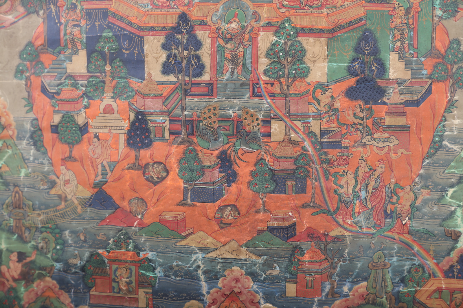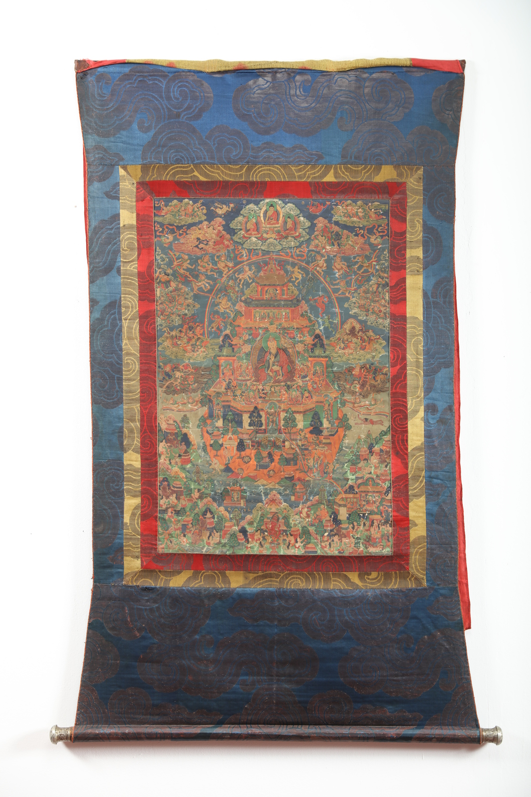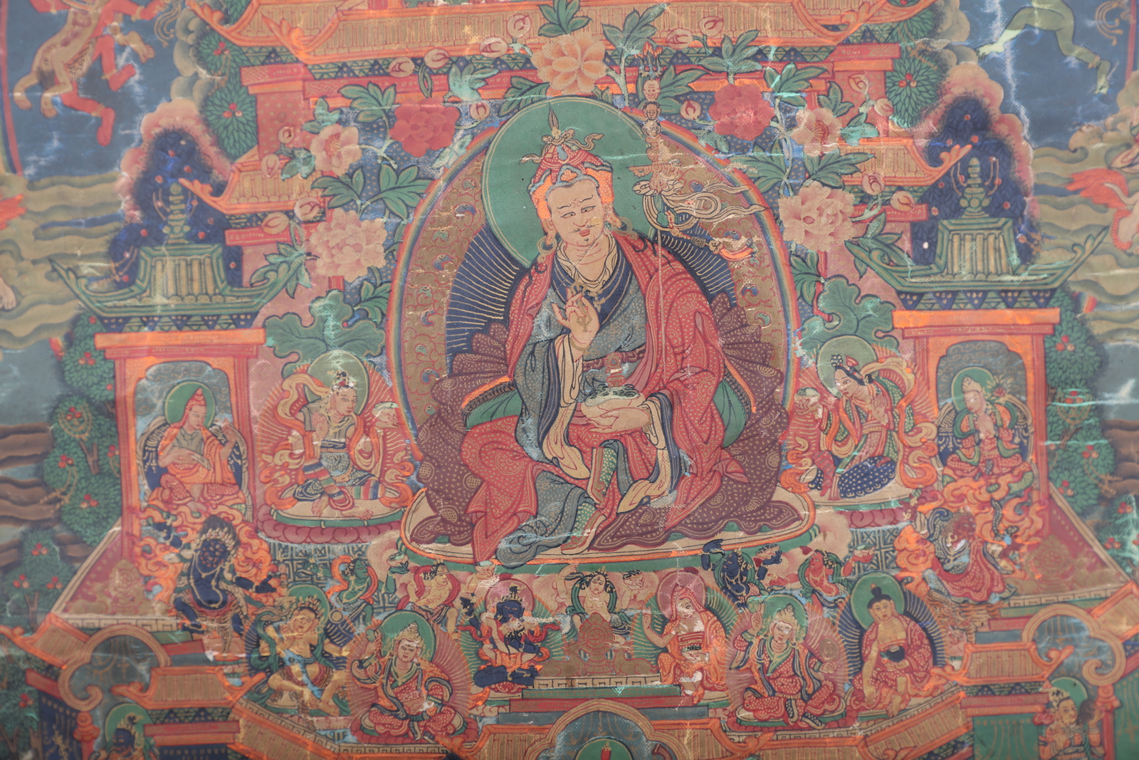 Arte Himalayana A tahngka depicting the "Pure Land" of Padmasambhava Sino-Tibet, 18th - 19th century . . Cm 69,80 x 126,00. Large painting on canvas depicting the master Padmasambhava (Guru Rimpoche, Swat, Pakistan VIII century) in his Paradise or “Pure Land” Zangdok Palri (the copper colored mountain). This notable work shows an intricate composition, at the center of which is a rich multi-leveled pagoda, partly painted in gold, in the main part of which is the master himself, dressed in monk robes embellished by precious fabrics. He wears the characteristic hat, holds a Kapala in the left hand resting on his lap, a vajra in his right hand, and a magic Kathvanga wand rests on his shoulder identifying him as a wielder of supernatural powers. Around him is a golden halo enriched by blossoming peonies. The building, resting on a reddish wooded mountain (surrounded in turn by flowing water), hosts a small pantheon at the feet of the guru, among which are recognizable Vajrapani, three Lokapala (guarding the base of the palace), one of the wives and Dorje Drolo, a semi-wrathful manifestation of the master himself. In a rectangular patio on the upper floors are the five transcendent Buddhas, while at the top, inside a spire, is the Bodhisattva Avalokitesvara, in turn surmounted by a Stupa holding the Amithaba. Around the pagoda is the paradise itself, characterized by a complex scenery of clouds and floating characters. Among these is the Buddha Sakyamuni, at the top of the whole scene. On soft clouds are also pictured Vajra-Dharma, Rahu and Simhamukha. In the bottom half of the work is a complex mountainous landscape, rich in trees, buildings and penitent characters. Painting internal measurements: 67.8x44.9 cm
