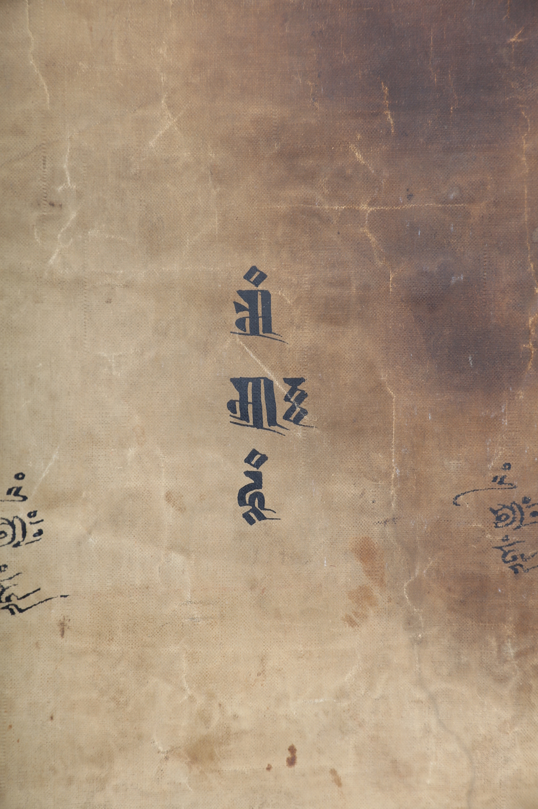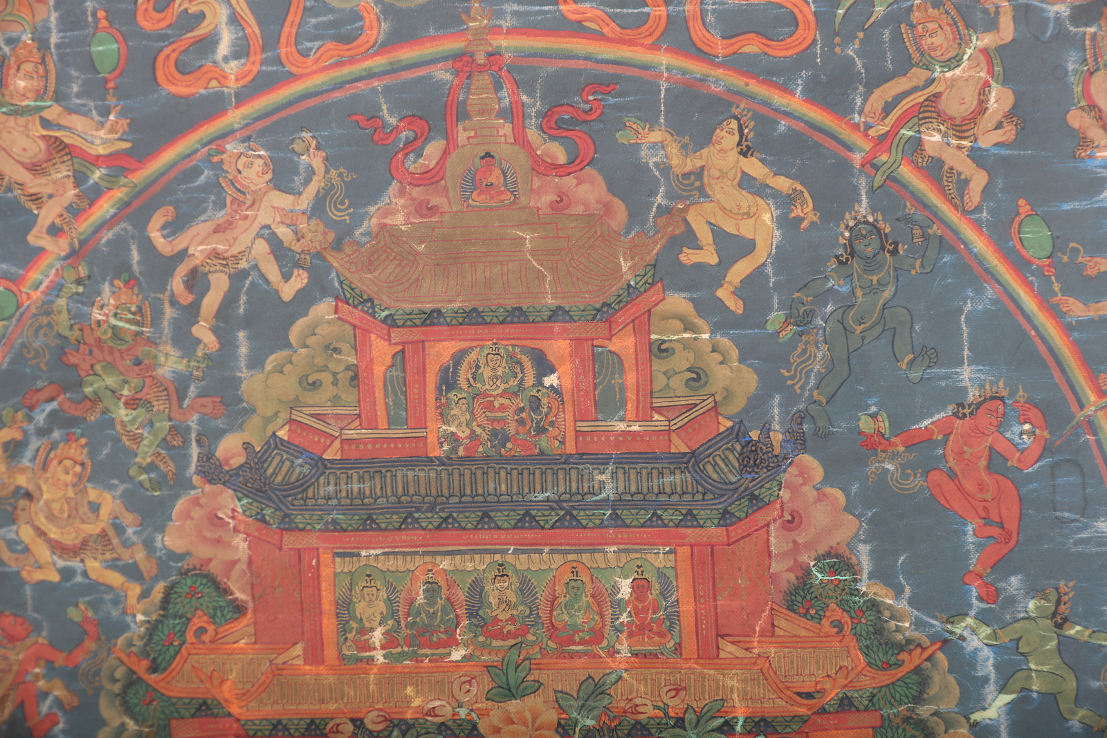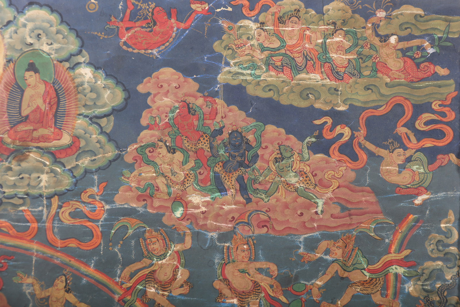 Arte Himalayana A tahngka depicting the "Pure Land" of Padmasambhava Sino-Tibet, 18th - 19th century . . Cm 69,80 x 126,00. Large painting on canvas depicting the master Padmasambhava (Guru Rimpoche, Swat, Pakistan VIII century) in his Paradise or “Pure Land” Zangdok Palri (the copper colored mountain). This notable work shows an intricate composition, at the center of which is a rich multi-leveled pagoda, partly painted in gold, in the main part of which is the master himself, dressed in monk robes embellished by precious fabrics. He wears the characteristic hat, holds a Kapala in the left hand resting on his lap, a vajra in his right hand, and a magic Kathvanga wand rests on his shoulder identifying him as a wielder of supernatural powers. Around him is a golden halo enriched by blossoming peonies. The building, resting on a reddish wooded mountain (surrounded in turn by flowing water), hosts a small pantheon at the feet of the guru, among which are recognizable Vajrapani, three Lokapala (guarding the base of the palace), one of the wives and Dorje Drolo, a semi-wrathful manifestation of the master himself. In a rectangular patio on the upper floors are the five transcendent Buddhas, while at the top, inside a spire, is the Bodhisattva Avalokitesvara, in turn surmounted by a Stupa holding the Amithaba. Around the pagoda is the paradise itself, characterized by a complex scenery of clouds and floating characters. Among these is the Buddha Sakyamuni, at the top of the whole scene. On soft clouds are also pictured Vajra-Dharma, Rahu and Simhamukha. In the bottom half of the work is a complex mountainous landscape, rich in trees, buildings and penitent characters. Painting internal measurements: 67.8x44.9 cm