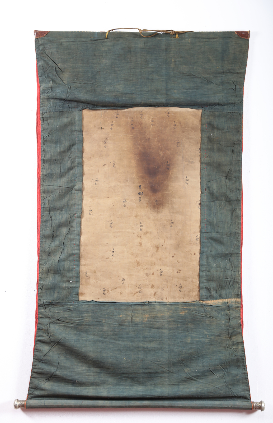 Arte Himalayana Thangka raffigurante la "Terra Pura" Padmasambhava Cino-Tibet, XVIII - XIX secolo. -. Cm 69,80 x 126,00. Grande pittura su tela raffigurante il maestro Padmasambhava (Guru Rimpoche, Swat, Pakistan VIII sec.) nel suo Paradiso o “Terra Pura”, Zangdok Palri (la montagna dal colore di rame). L’importante opera mostra un’intricata composizione al cui centro spicca una sontuosa pagoda su più livelli e parzialmente dipinta in oro, nel cui corpo principale é ospitato il maestro stesso vestito di abiti monacali rifiniti in filati preziosi. Porta il suo tipico copricapo, una Kapala nella mano sinistra adagiata in grembo, un vajra nella mano destra ed una bacchetta magica Kathvanga appoggiata alla spalla che lo identifica come detentore di poteri sovrannaturali. Intorno a sé mostra un'aureola dorata abbellita da peonie fiorite. L’edificio, poggiante su di una alberata montagna rossastra (a sua volta attorniata da acque fluttuanti), ospita un piccolo pantheon ai piedi del guru stesso, tra cui é possibile distinguere, Vajrapani, tre Lokapala (a guardia della base del palazzo) una delle sue mogli e una variante semi irata del maestro stesso, Dorje Drolo. In un patio rettangolare nei piani superiori, sono invece presenti i cinque Buddha trascendenti mentre all’apice, all’interno di una guglia é ritratto il Boddhisattva Avalokitesvara, a sua volta sormontato da una Stupa contenente Amithaba. Intorno alla pagoda si sviluppa il paradiso stesso con un gioco estremamente complesso di nuvole e personaggi fluttuanti tra questi si distingue all’apice di tutta la pittura il Buddha storico Sakyamuni. Poggiati su spumose nuvole sono inoltre rappresentati Vajra-Dharma, Rahu e Simhamukha. Nella porzione inferiore dell’opera si sviluppa inoltre un complesso paesaggio montuoso, ricco di alberi edifici e figure penitenti. Scritte di attivazione sul retro. Dimensioni dipinto interno: 67,8 X 44,9 cm