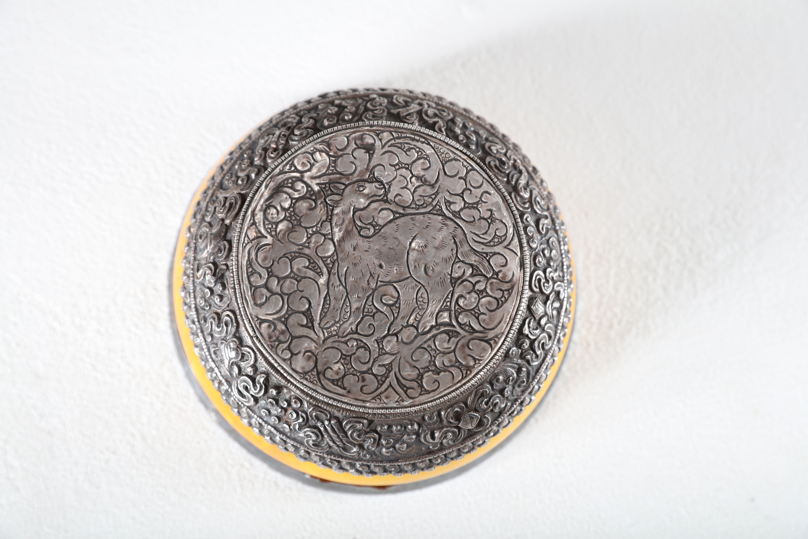 Tibet, XIX secolo . -. Cm 12,00 x 6,00. Interno piano, la base è decorata con quadrupede circondato da motivi fitoformi e floreali.