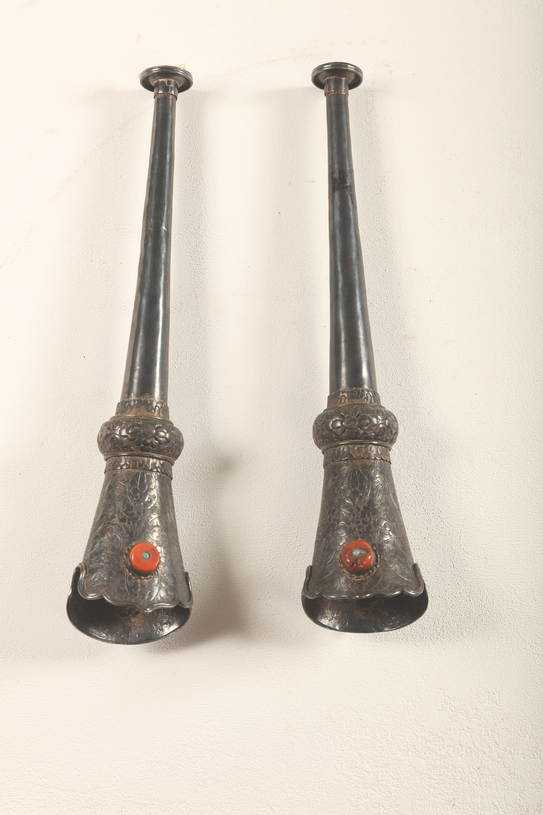 Arte Himalayana Coppia di trombe in argento con corallo e turchesi incastonate