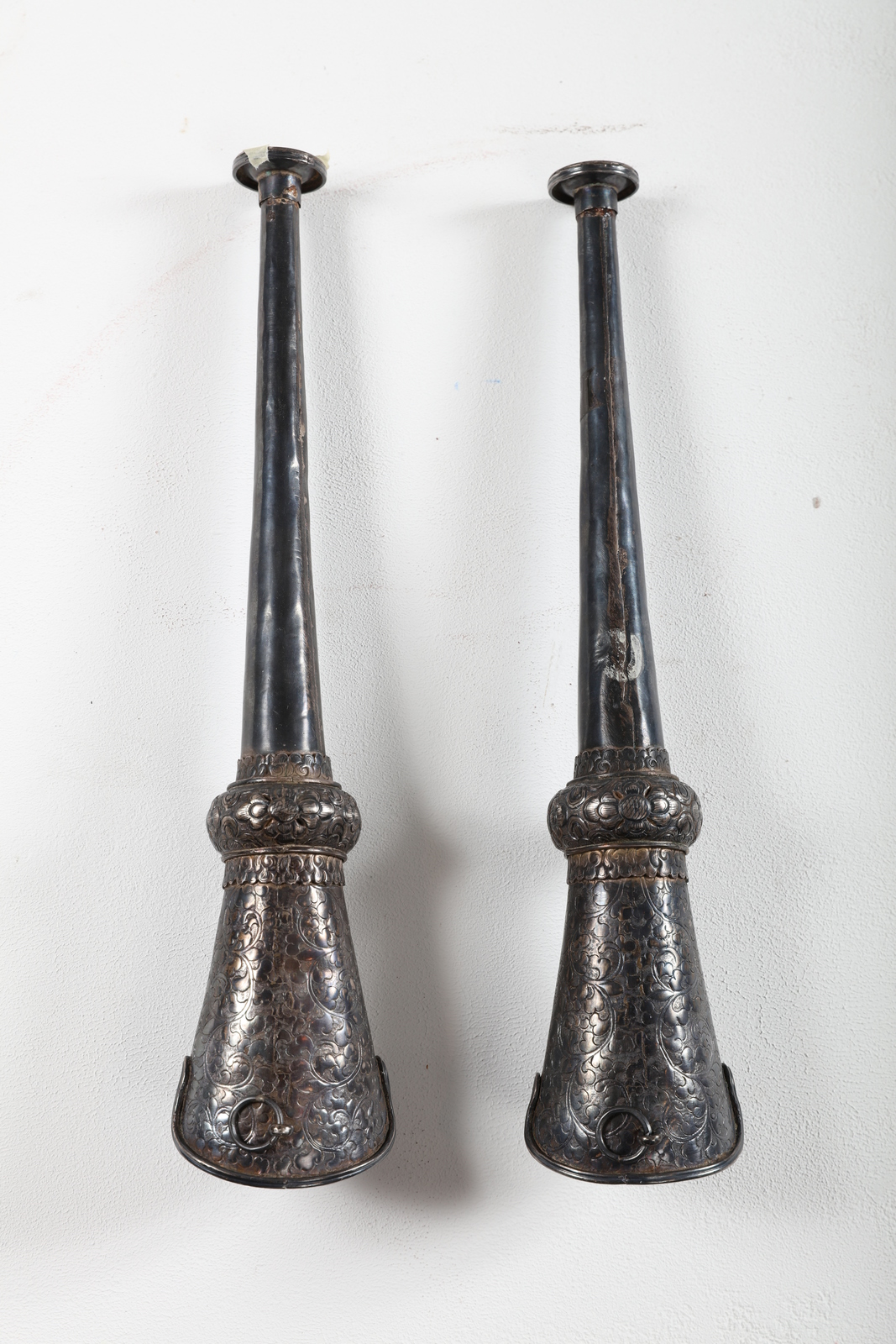 Tibet, XIX secolo . -. Cm 35,20. Coppia di trombe rituali realizzate in argento, la campana decorata con motivi floreali.
