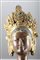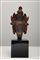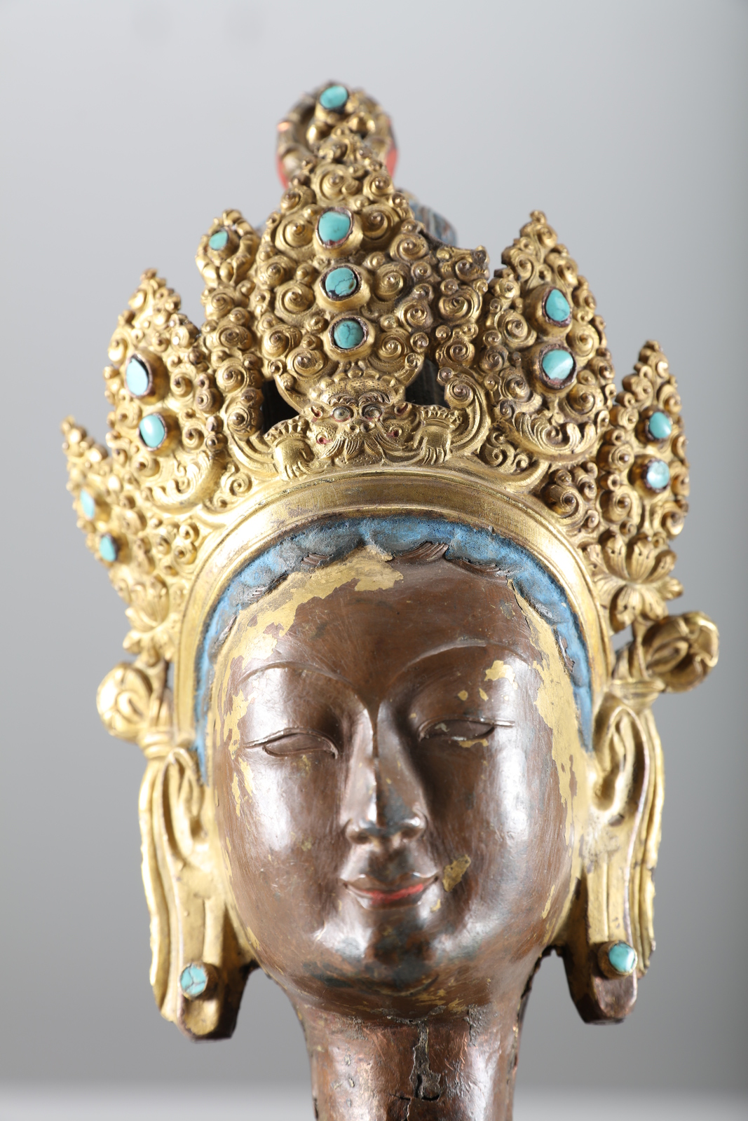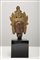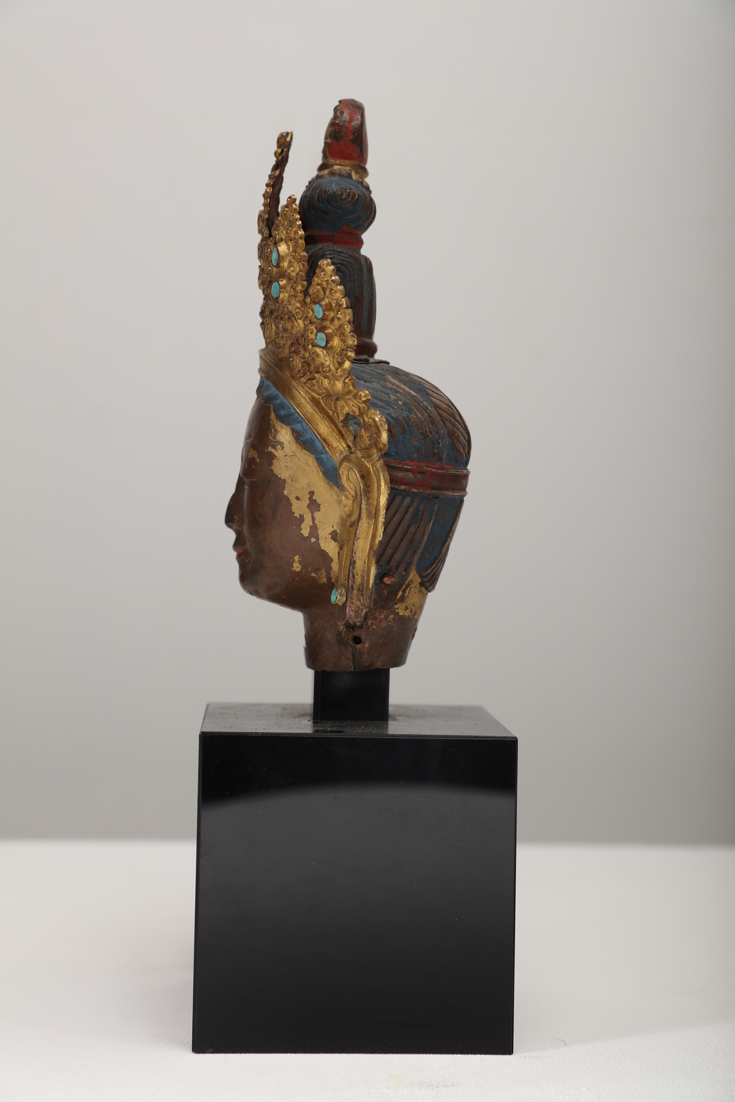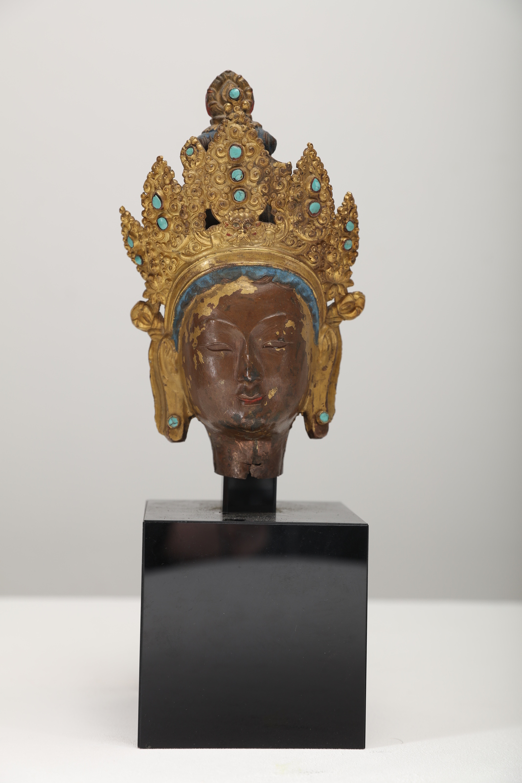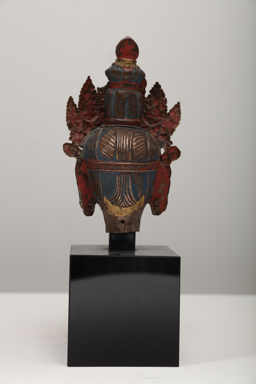 Cino -Tibet, XVIII secolo . -. Cm 12,00 x 30,50. Testa in rame sbalzato raffigurante probabilmente il bodhisattva della compassione Avalokitesvara. Il volto sereno del personaggio è ornato da una corona a cinque punte finemente lavorata ed abbellita da tredici turchesi originali. Alla base della punta centrale si scorge la rappresentazione del mostro benefico Cheppu. Sono inoltre presenti tracce di doratura sul volto e cospicui residui di pigmento blu e rosso sulla capigliatura e sul retro della corona. Senza base misura h 18,5 cm