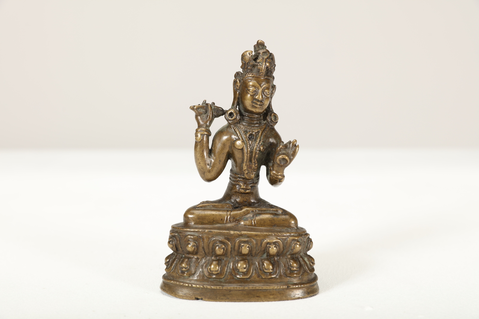 Arte Himalayana Statua in bronzo raffigurante Vajrapani Tibet Occidentale, Ladak, India, XI - XII secolo . -. Cm 8,00 x 12,50. Fusione in bronzo a cera persa raffigurante Vajrapani nella sua forma di Bodhisattva seduto in padmasana su una base a doppio fiore di loto e reca in mano i suoi attributi: un vajra nella sua mano destra e la campana ghanta nella sinistra.