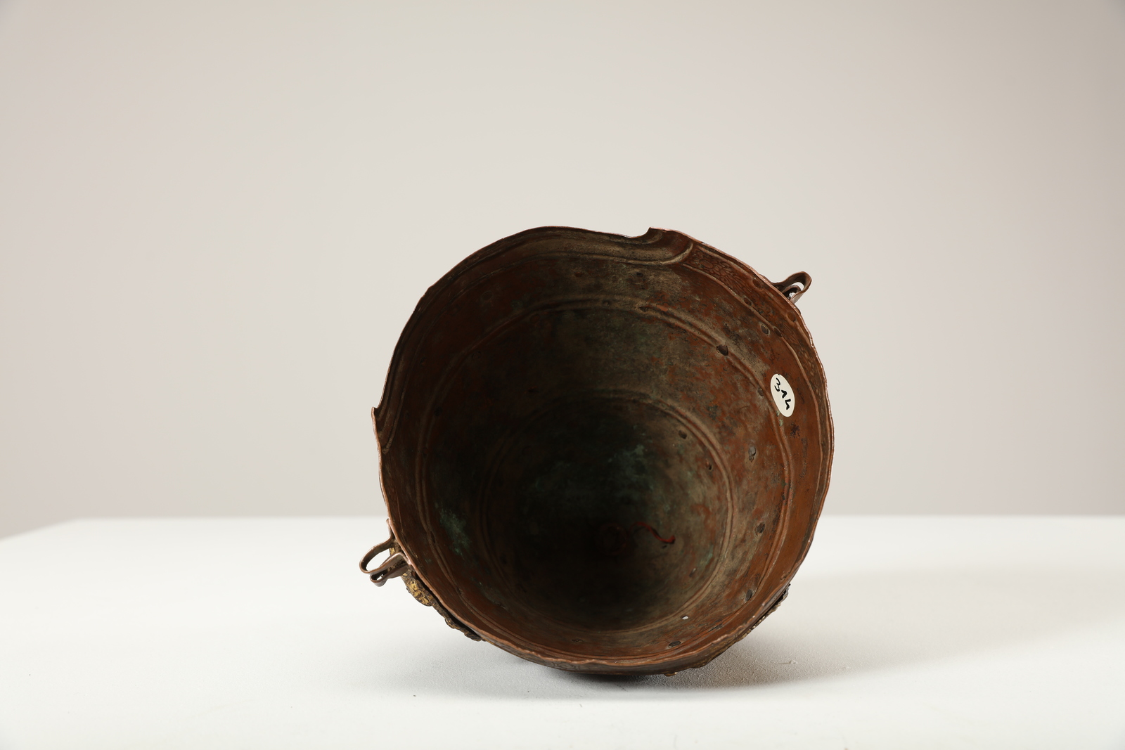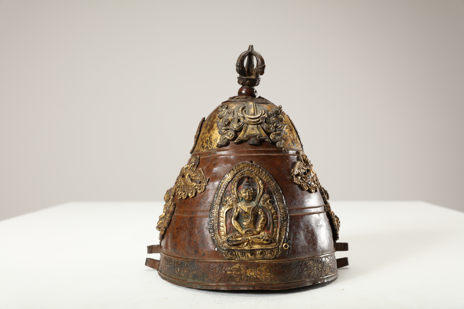Nepal, 16th century . . Cm 18,00 x 24,50. Rare ritual crown, also known as vajra crown, used by vajracharya priests. It presents a main body in copper, with traces of gilding and chiseling, on which finely repoussé plaques are applied. On it are the five great Buddhas, each of them adorned by a halo. In the front are Vairocana e Amoghasiddhi, while on the left Akshobhya and Ratnasambhava on the right. On the back is Amitabha, characterized by the reddish halo. On the crown are also two Makara, two Kinnara with spread wings, jewels and phytomorphic decors. Half vajra ending.