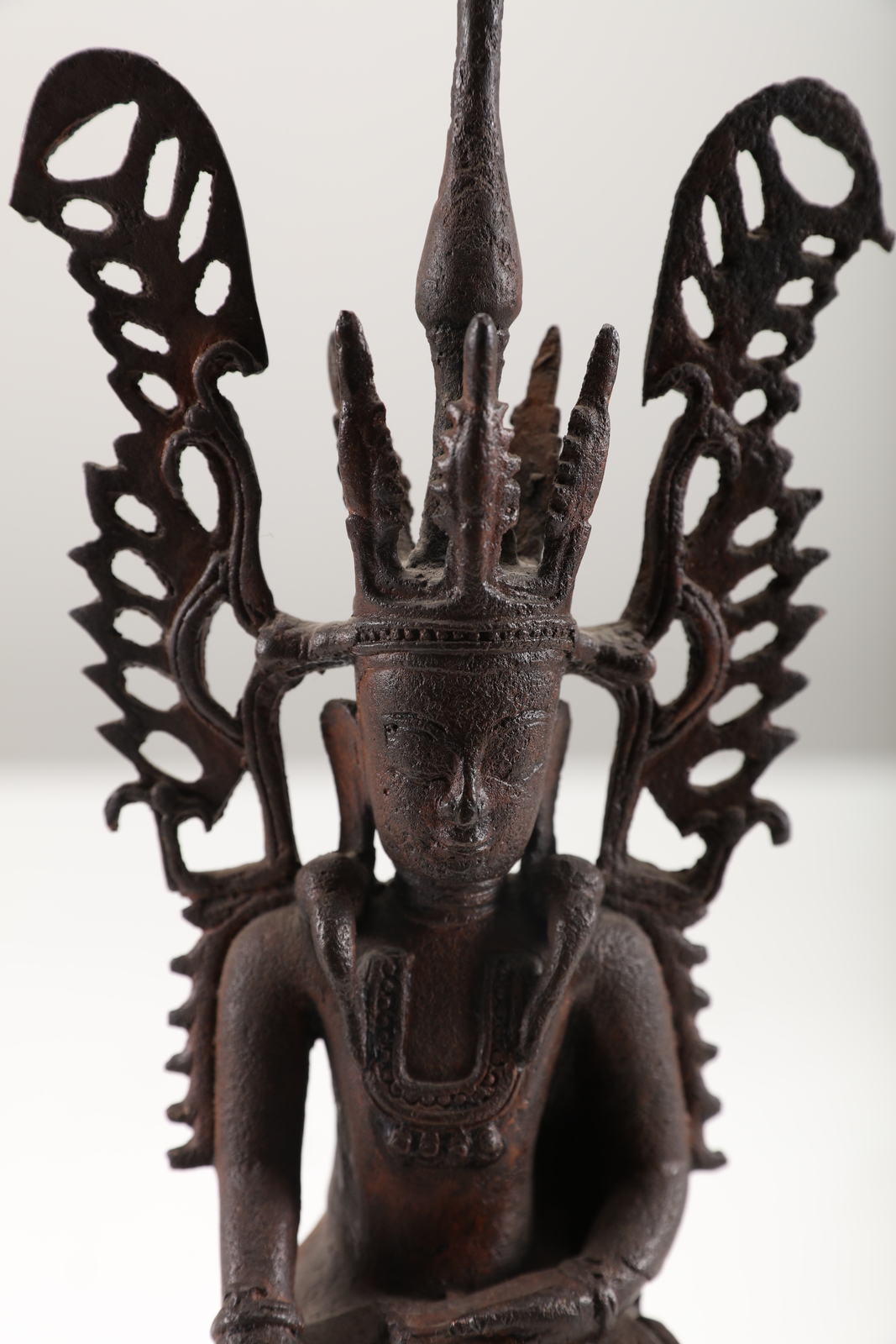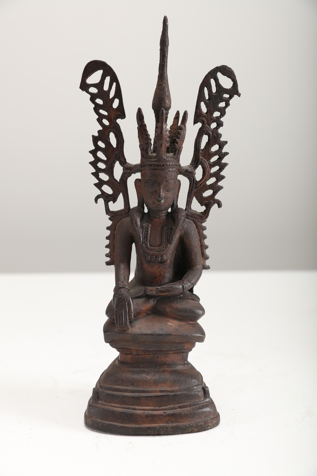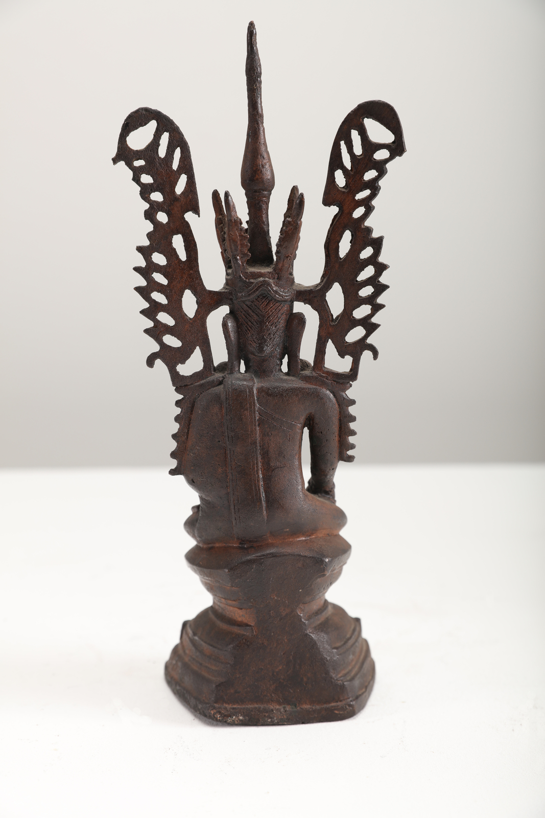 Arte Sud-Est Asiatico Statua in bronzo raffigurante Buddha Sakyamuni Birmania, XVII - XVIII secolo. -. Cm 11,30 x 28,40. Dalla forte patina rossastra, la figura è seduta in posizione padmasana su un piedistallo rialzato e mostra una corona acuminata e fiamme estroflesse traforate a formare pannelli laterali.
