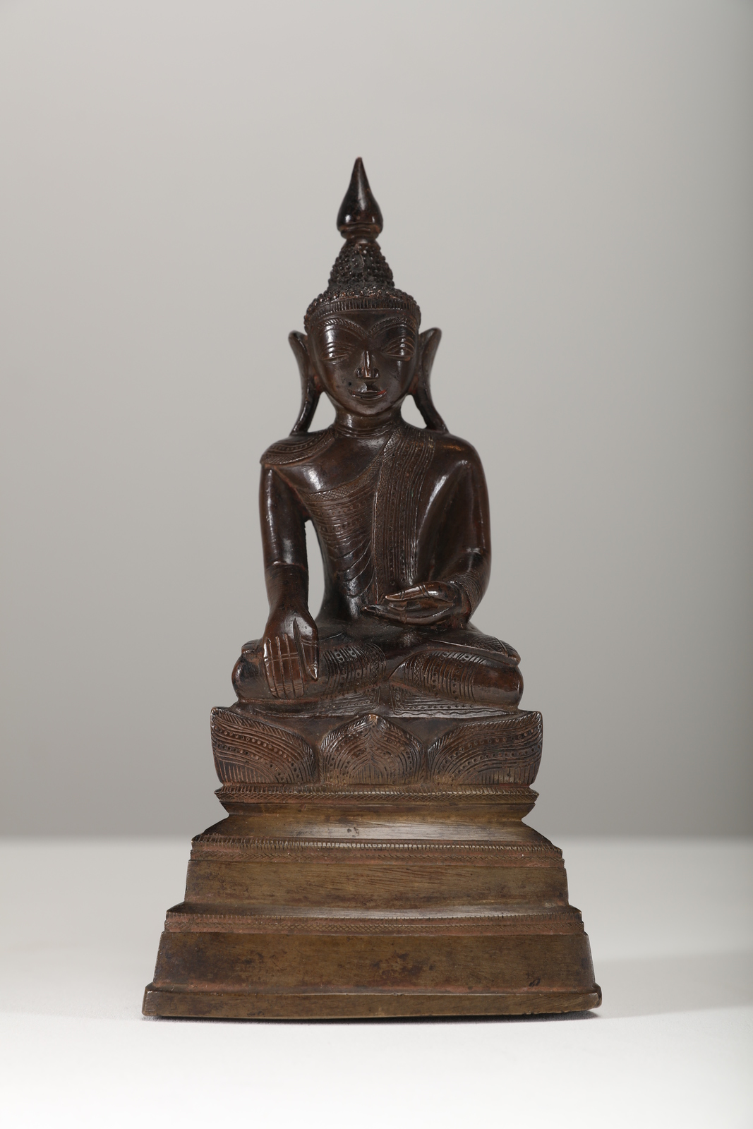 Arte Sud-Est Asiatico Statua in bronzo raffigurante Buddha Sakyamuni Birmania, XVIII secolo. -. Cm 11,50 x 22,30 x 6,00. Fusione in bronzo a patina scura in cui la figura siede nella canonica postura del Buddha storico su una base a più livelli e fiore di loto singolo.