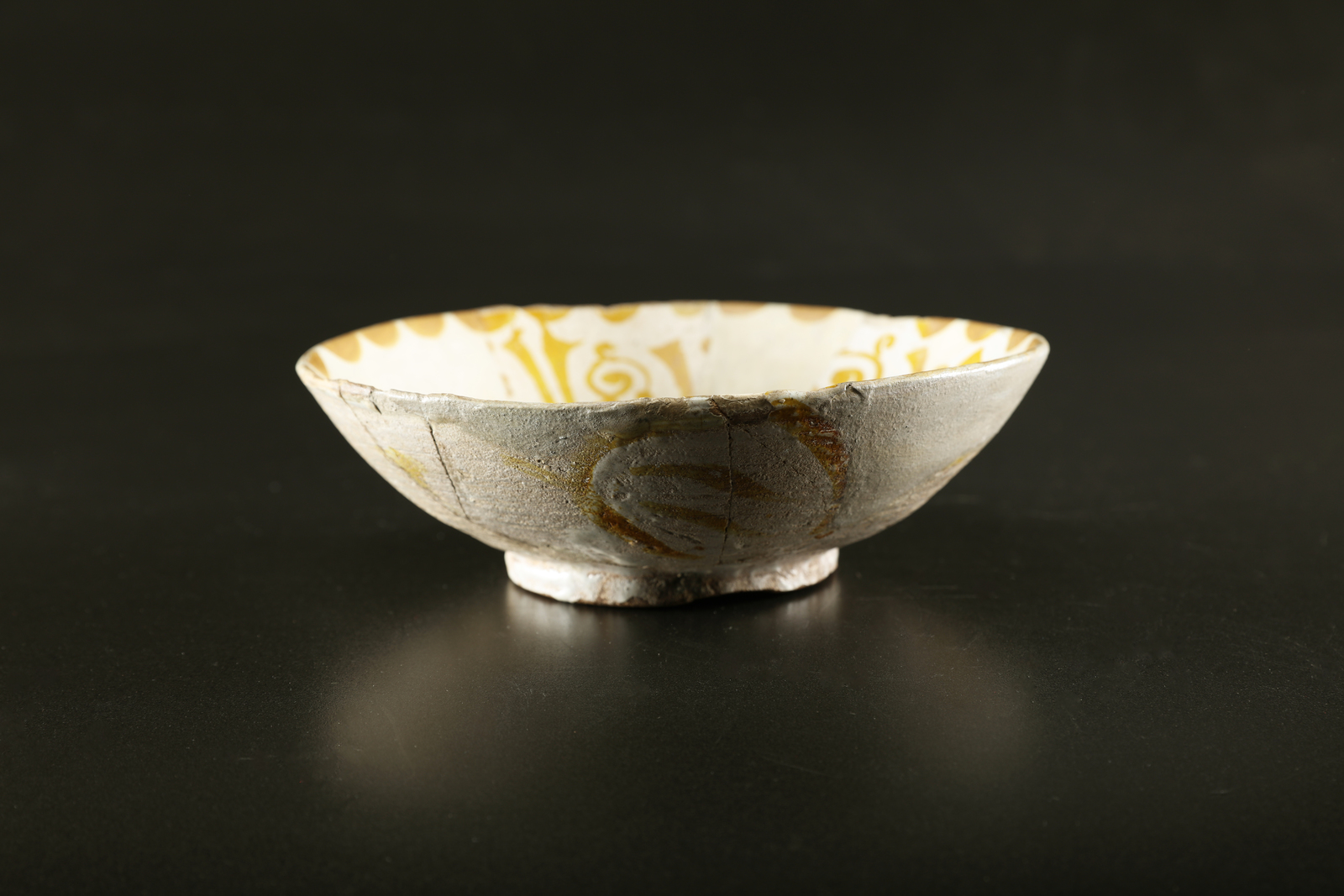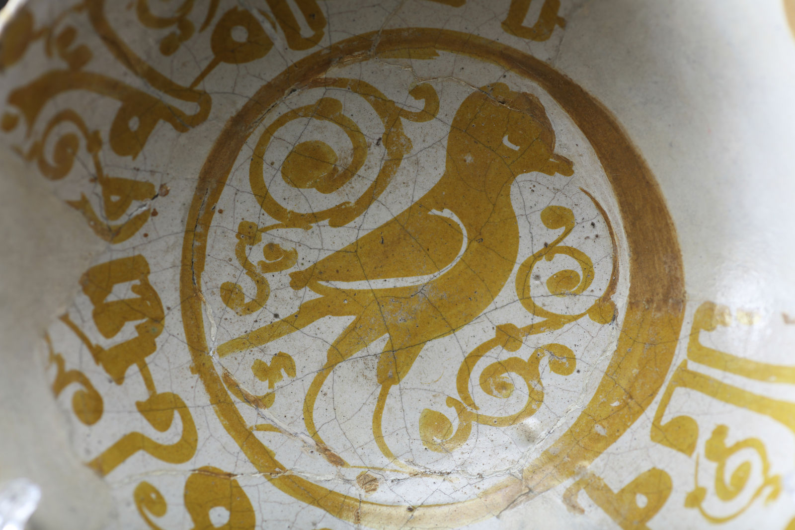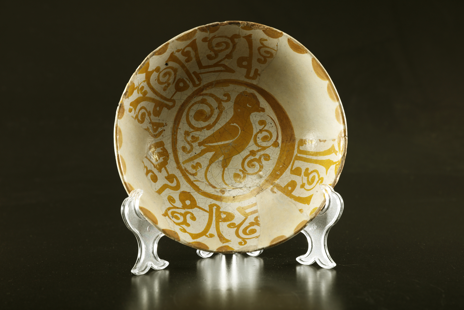 Arte Islamica A rare Fatimid lustre painted dish with decorated with central bird and epigraphies Egypt, Fustat, Fatimid dynasty, 910 - 1171, 11th century Earthenware painted with lustre over white glaze. . Cm 19,70 x 6,00. Resting on disc, displays, in the center, a bird among stylized shoots. On the internal walls are votive writings in ornamental Kufic script, while the upper rim is decorated by small waves. The outside bears traces of a medallion pattern. For similar examples refer to Watson 2004, p. 277; another is at the Walters Art Museum of Baltimora. Conservative restoration.