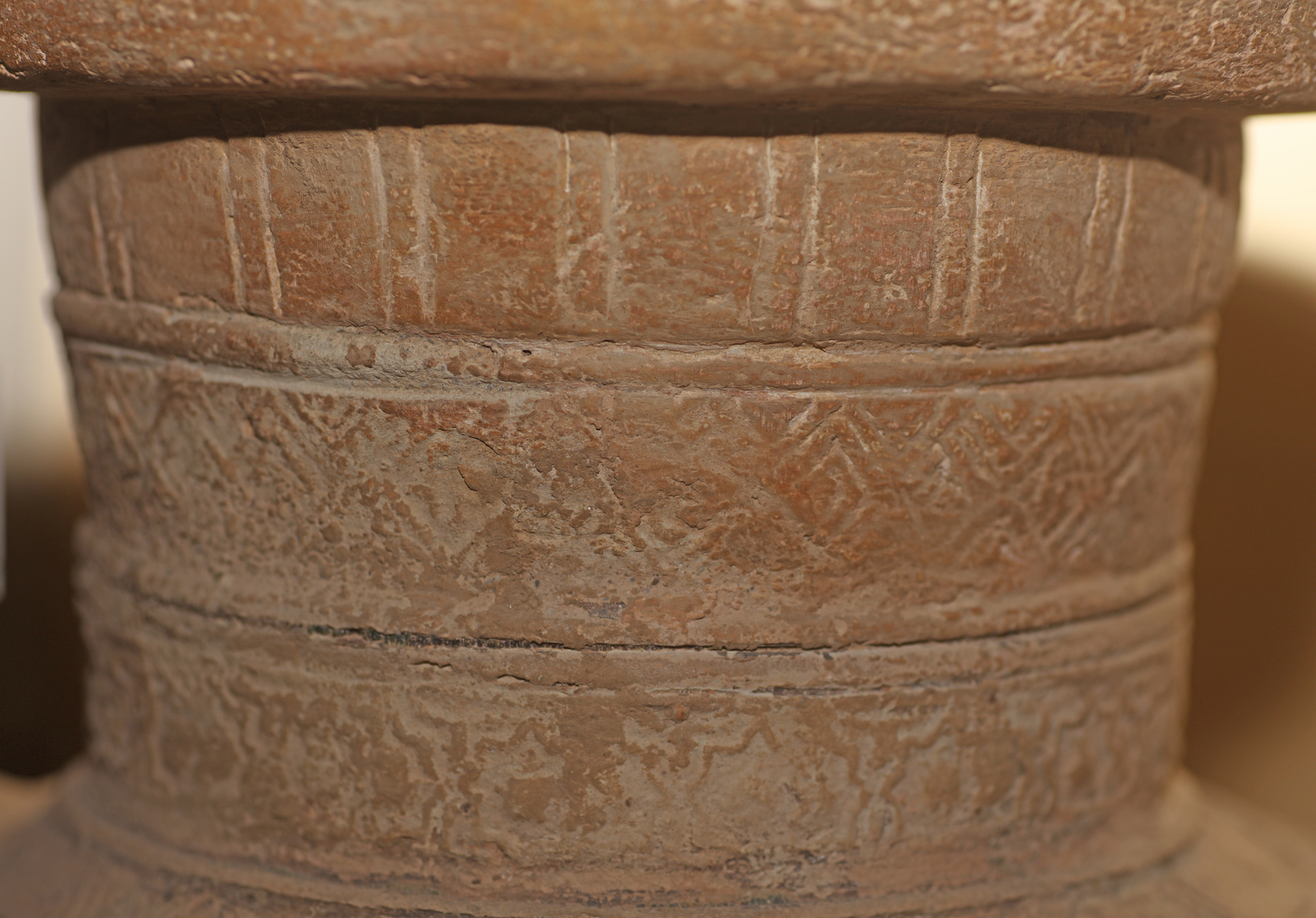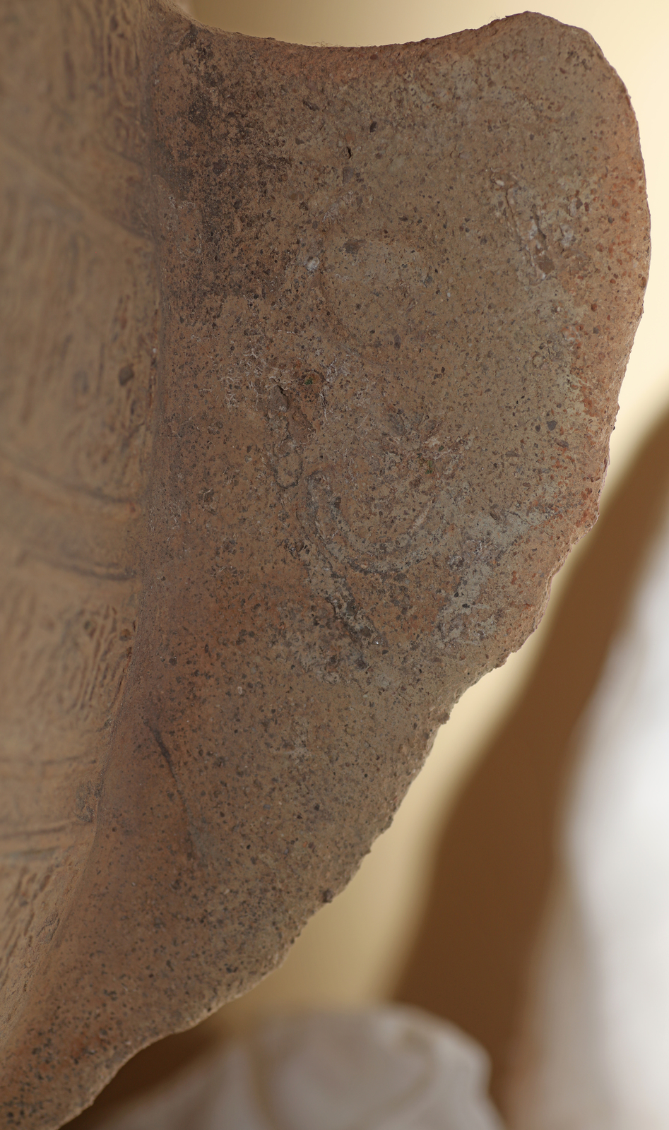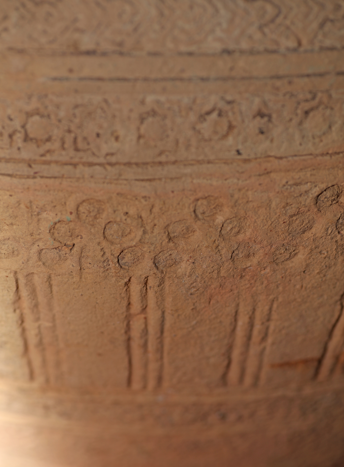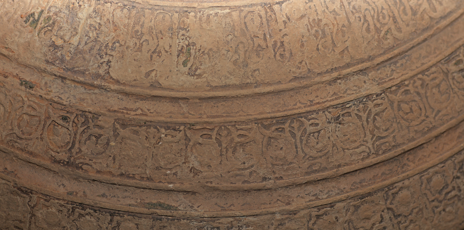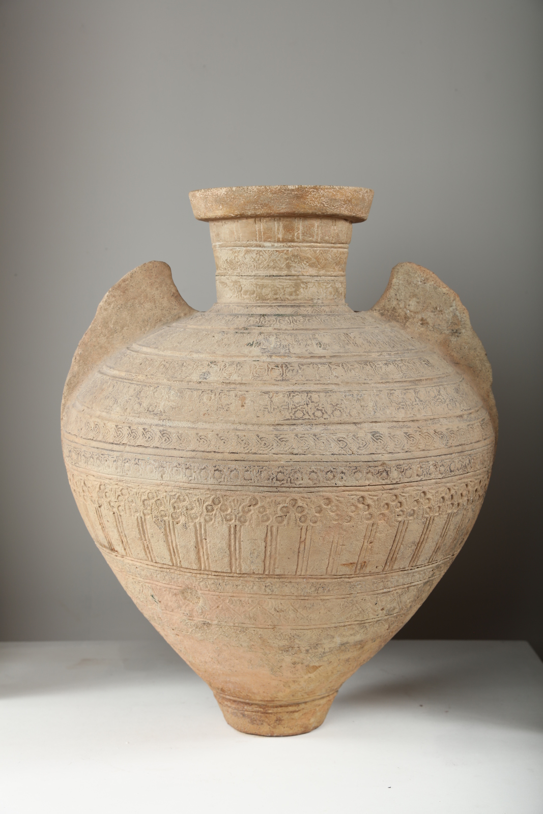 ARTE ISLAMICA A rare, noterworthy and massive earthenware jar with traces of green glaze Spain, 13th century . . Cm 54,00 x 65,00. In the shape of an upturned pear, reaches the maximum width in correspondence with the wings-shaped ears, typical of the Nasrid Spanish or earlier production. Between the two handles is the robust neck, lightly flared and with a reinforced edge. The decoration is organized in horizontal bands in which, starting from the bottom, geometrical motifs with interwoven half-palmettes alternate. The central band, wider, is characterized by an architectural style motif, sporting a sequence of trefoil arches, and is enclosed by two additional bands featuring the characteristic motif shaped as an eight-pointed star, alternating with a cross motif: the typical pattern decorating the ceramic, covering the lower portions of walls. The three upper decorative bands show interwoven arabesque and a pseudo-epigraphic motif, which appears to have a decorative function. Traces of a green glazing are visible on the whole item. A similar amphora was auctioned by Bonhams on April 5, 2011 (auction n. 18801, lot 82W) and during auction 10814 (Bonhams London, April 29, 2004 lot 325).