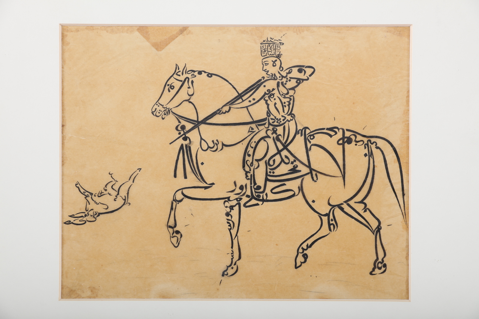 Arte Islamica Calligrafia su carta raffigurante un cacciatore Iran, fine XIX - inizio XX secolo . -. Cm 22,00 x 17,00. Versi poetici in persiano si uniscono a formare un brillante esercizio calligrafico creando la sagoma di un uomo a cavallo mentre scocca la freccia che trafigge la preda.