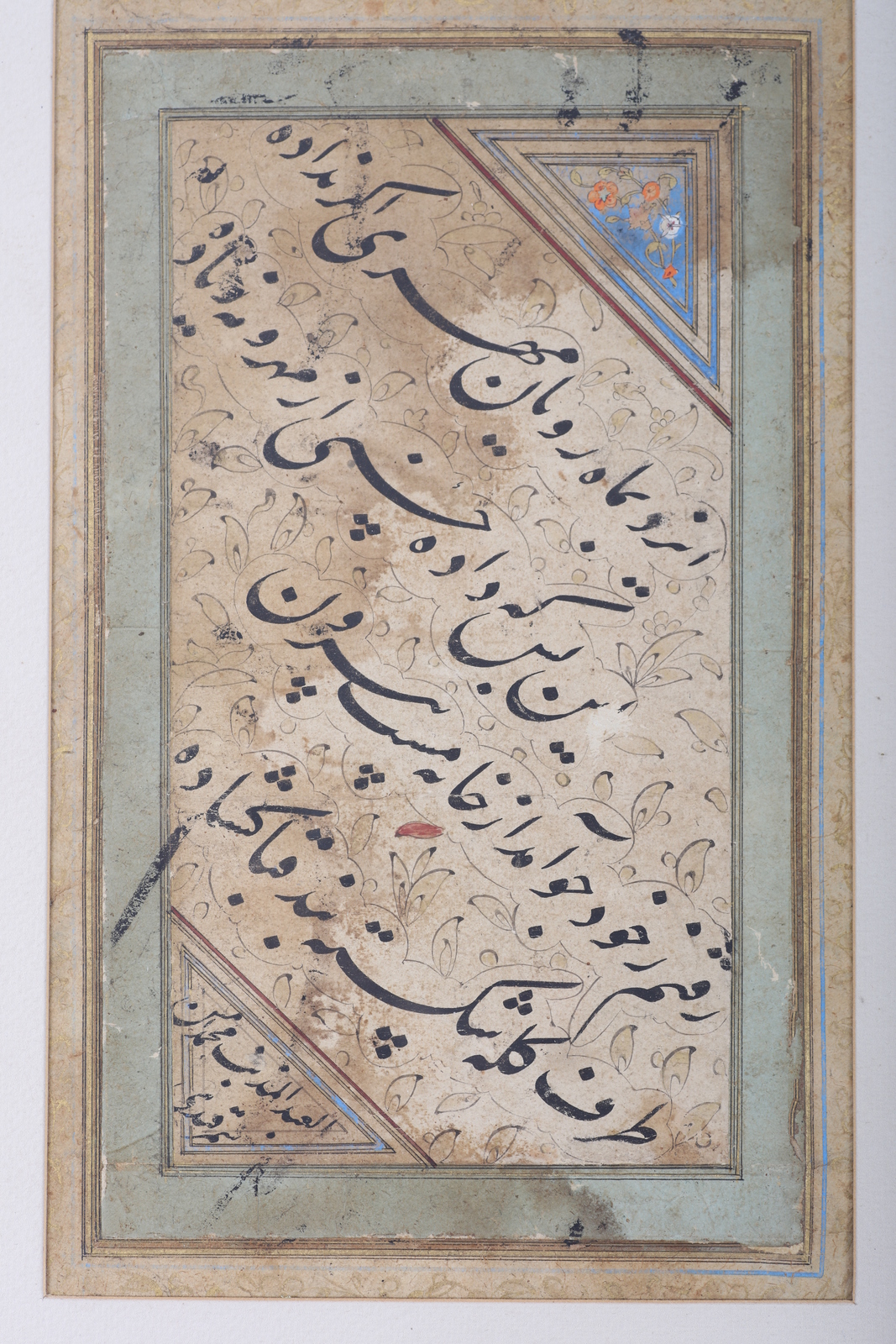 Arte Islamica A Persian calligraphic composition with a poetry by Mohammad Amin Samarghandi Iran, dinastia Safavide, 17th century . . Cm 13,50 x 22,00.