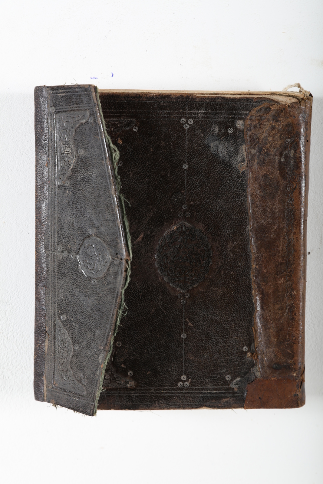 Late 18th century. . Cm 16,00 x 20,00. Arabic manuscript on paper. Measurements of the leaf 204x106 mm, portion of the leaf covered in writing 180x110 mm. Text written in Naskh script on a single column of 15 lines, with black ink, while the titles of the surahs are in red ink. The manuscript totals 248 leaves and is complete. Each leaf is framed by a decorative red line. Exercises for metrical reading on the last pages. Coeval binding in leather with fold, decorated with dry tooling. Reinforced first leaf, traces of use.