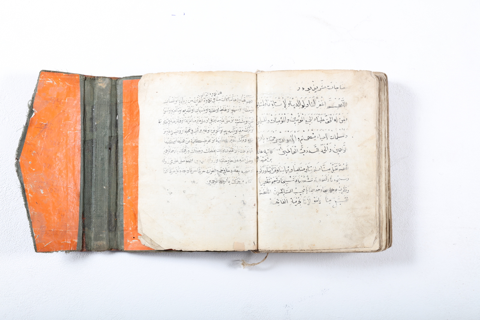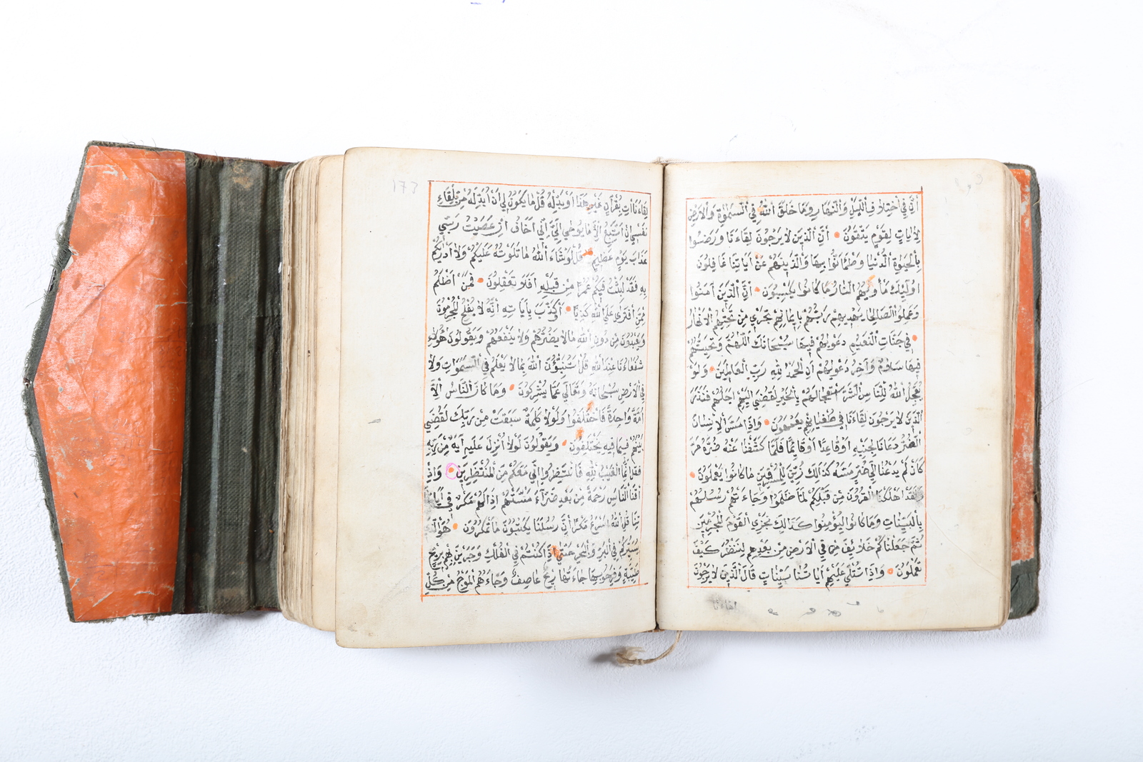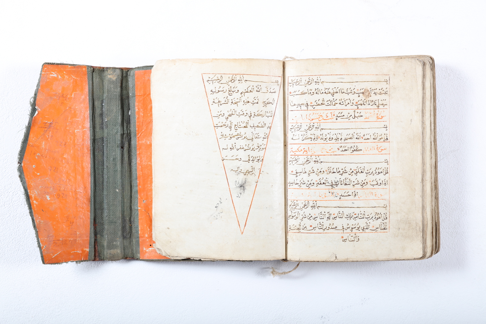 Tardo XVIII secolo . . Cm 16,00 x 20,00. Manoscritto su carta in arabo, dimensioni del foglio 204x106 mm, specchio di scrittura 180x110 mm. Testo in calligrafia Naskh su singola colonna di 15 linee in inchiostro nero, i titoli delle sure in inchiostro rosso. Composto da 248 carte, completo. Tutti i fogli sono delimitati da un filetto rosso. Sulle ultime carte esercizi di lettura metrica. Legatura coeva in pelle con ribalta, decorata con impressioni a secco, sciupata. Prima carta rinforzata, tracce d'uso.