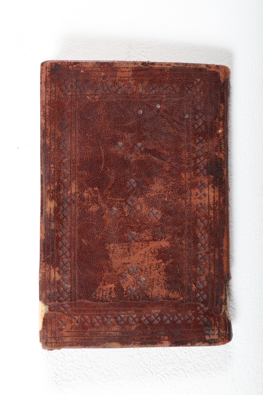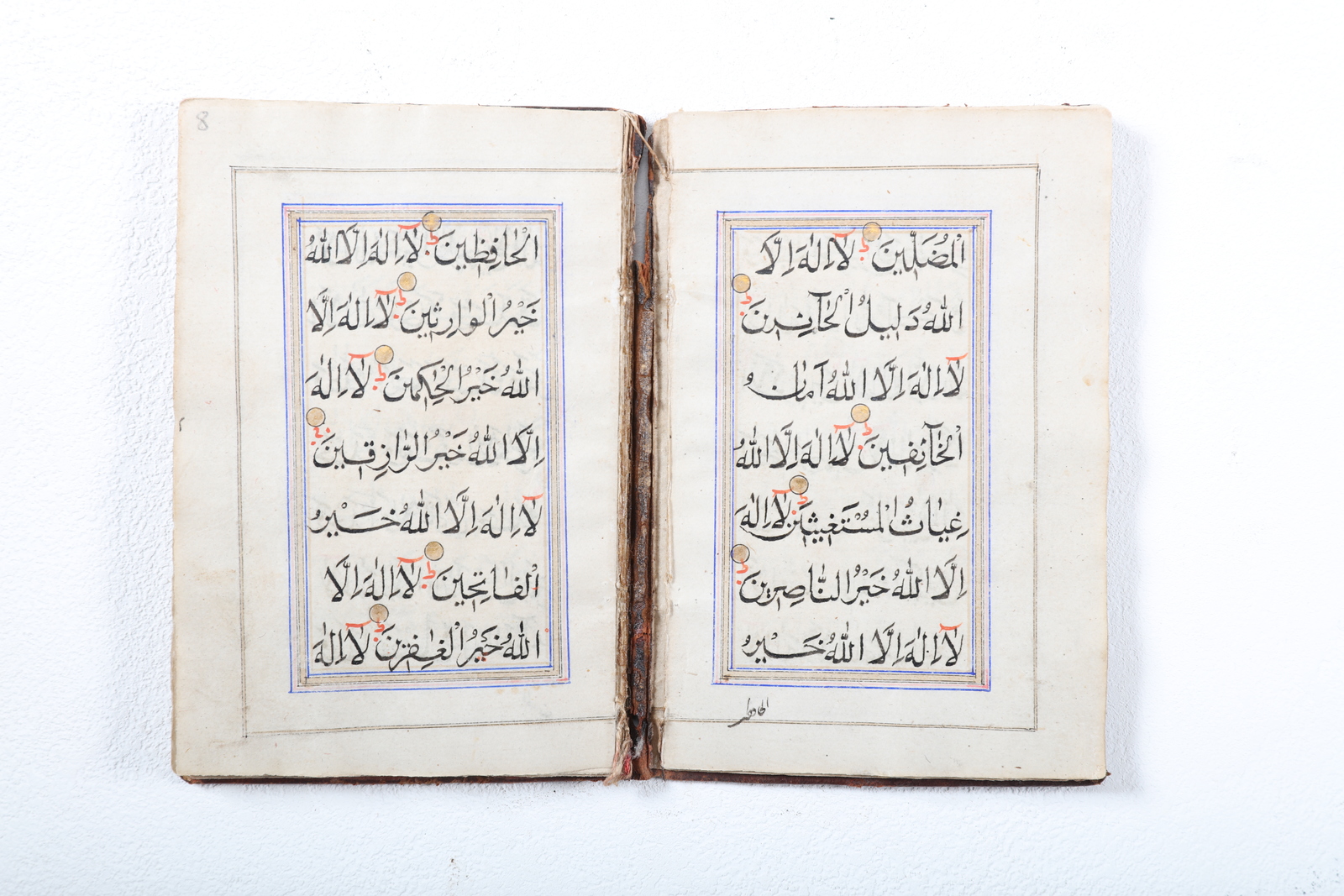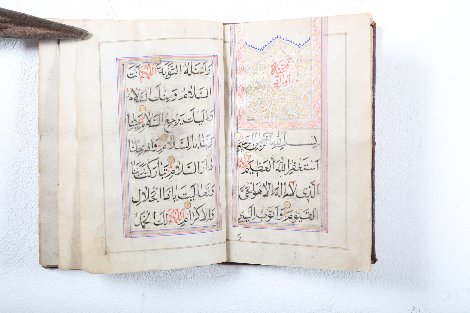 Indo Persia, XIX secolo . -. Cm 8,50 x 12,50. Manoscritto in arabo su carta. Dimensioni del foglio 12,5 X 8,5, dimensioni dello specchio di scrittura: 9 X 5 cm. Testo in calligrafia Naskh in inchiostro nero su singola colonna contenente 7 linee inquadrate da filetti blu e giallo centrale. Il testo contiene segni diacritici in rosso ed indicatori testuali circolari dorati. Legatura in pelle impressa con qualche rottura.