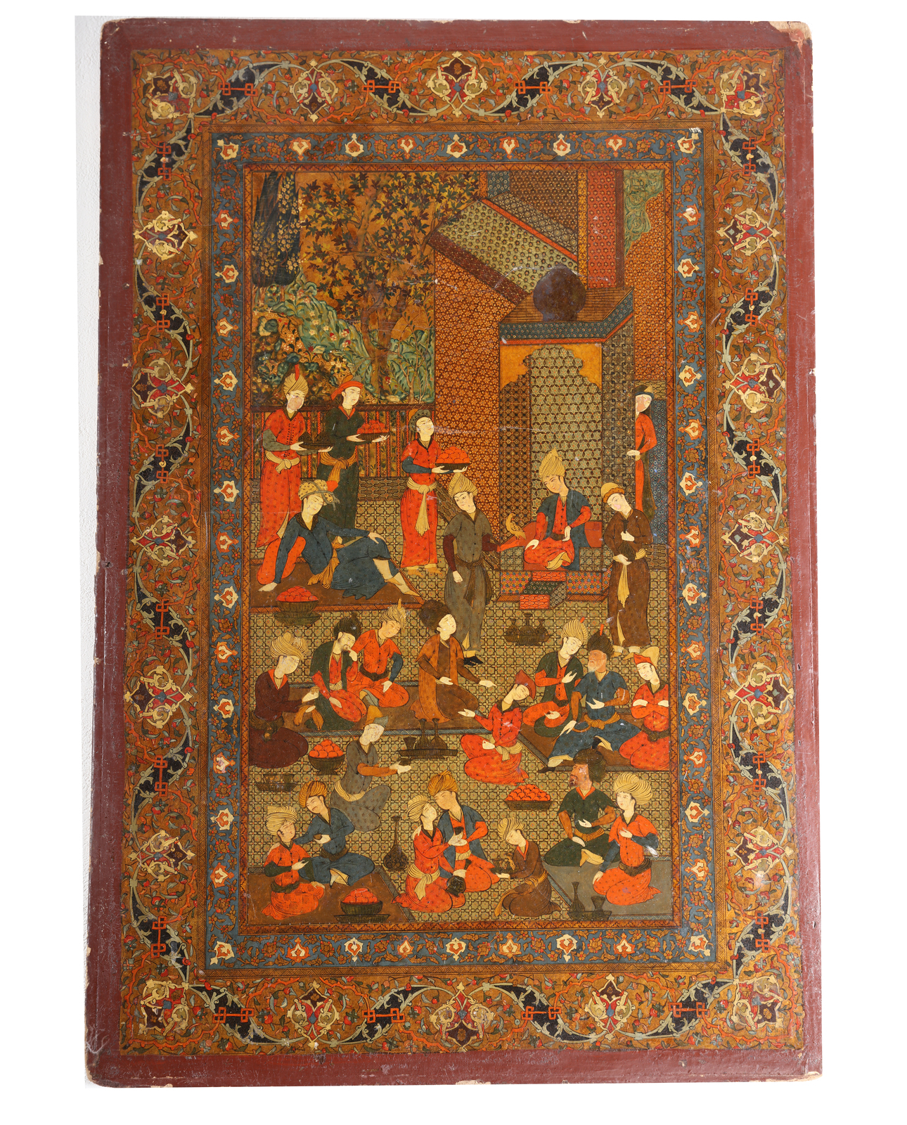 Iran, 19th century. . Cm 48,80 x 72,00 x 0,90. Big painting depicting a court celebration, characterized by the Shah in the top right, framed by a building depicted in multiple perspective, and surrounded by attendants bearing food, and figures feasting in the lower level. In the background is an idyllic landscape, separated from the scene mentioned above by a red railing, which, together with the characteristics of the figure and the taj (headwear with central stick), identifies the painting as belonging to the Safavid tradition. Some of the faces were erased, many stereotyped and some resemble proper portraits. Illuminated with interwoven palmettes and half-palmettes on the margins.
