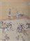 Iran, dinastia Qajar, XIX secolo . -. Cm 13,00 x 21,00. Affollata miniatura raffigurante sedici uomini intenti a giocare a polo in un paesaggio caratterizzato da montagne brulle e nuvole di ispirazione cinese. Una cornice di arabeschi su fondo blu abbellisce la parte superiore della miniatura rifinita con oro.