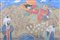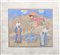 Iran, XIX secolo o antecedente. -. Cm 29,70 x 27,00. Nel registro superiore un cielo blu spezzato da due nuvole di derivazione cinese ed una collina con alberi di melograno interrotta dalla figura di un angelo, probabilmente l'arcangelo Gabriele. Il registro inferiore è delimitato da una fontana con due papere e tracce di argento e due uomini, l'uno con lo sguardo verso il basso, l'altro con gli occhi rivolti all'angelo ed il dito sulle labbra nella tipica espressione persiana che simboleggia dubbio e sorpresa.