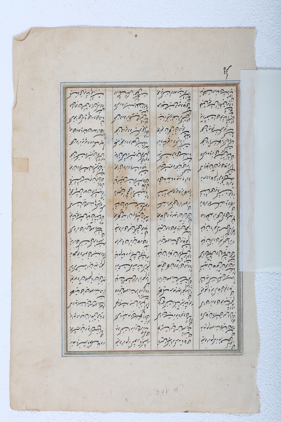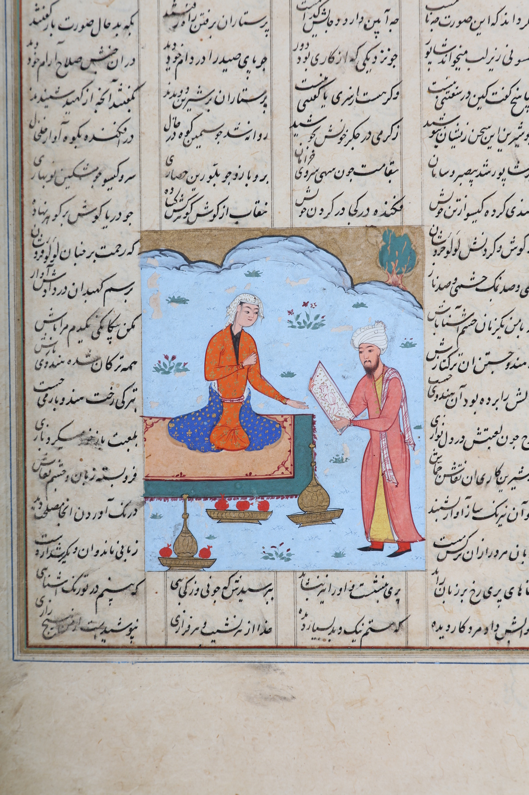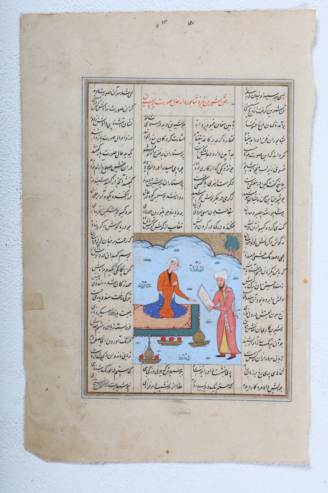 Iran, inizio XVI secolo. -. Cm 18,00 x 28,00. La calligrafia in stile Nastaiq sul fronte e sul verso è suddivisa su quattro colonne e si riferisce ad un passaggio della storia di Shirin e Shapur. La miniatura rappresenta una donna seduta su un tappeto, in un paesaggio naif su sfondo dorato, che riceve un dipinto dall'uomo stante al suo fianco.