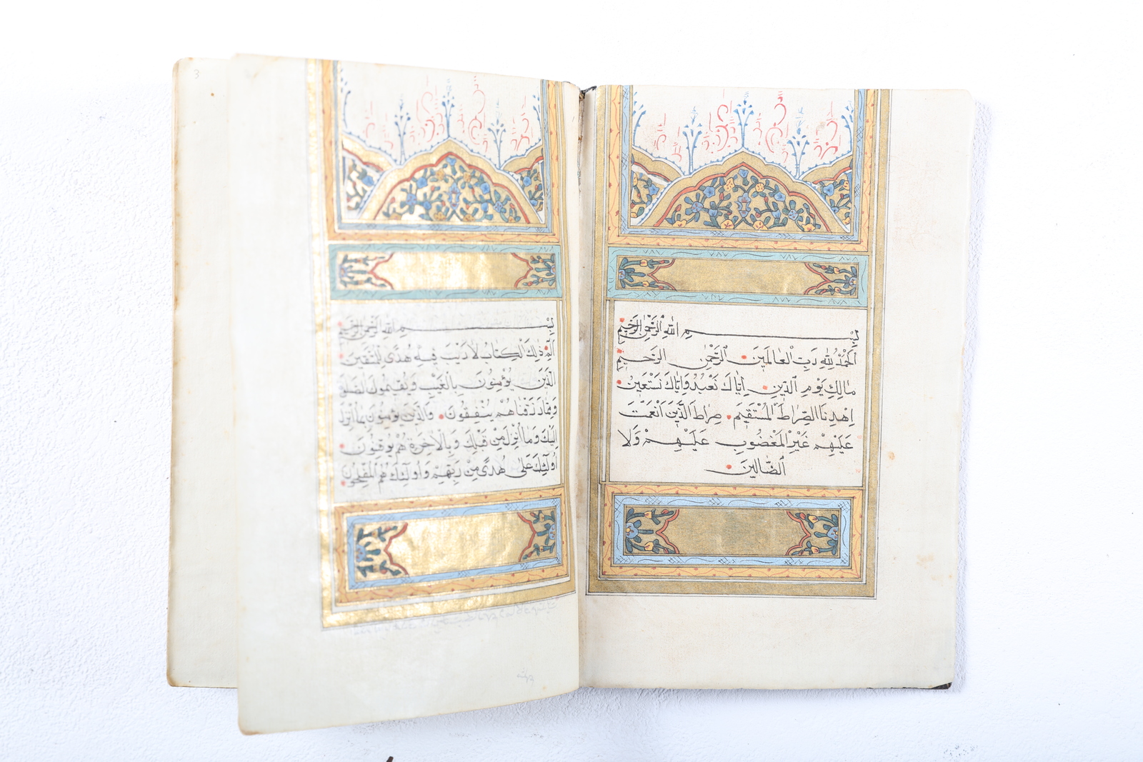 ARTE ISLAMICA Corano (9 sure) Probabilmente impero ottomano, Turchia, tardo XVIII secolo. . Cm 12,00 x 18,00. Manoscritto miniato su carta, dimensioni del foglio 182x118 mm, specchio di scrittura 122x74mm. Testo in calligrafia Naskh su singola colonna di 15 linee in inchiostro nero. Composto da 108 carte, le ultime 5 bianche, completo. Comprende le Sure dalla 1 alla 9. La decorazione comprende un doppio frontespizio miniato in oro e colori. Spazi bianchi per i titoli delle sure e i versetti (Ayat) sono delimitati da un punto rosso. Legatura antica in pelle con impressioni a secco. Due carte presentano un restauro sul margine bianco, per il resto è in ottime condizioni di conservazione, esemplare pulito in bella scrittura.