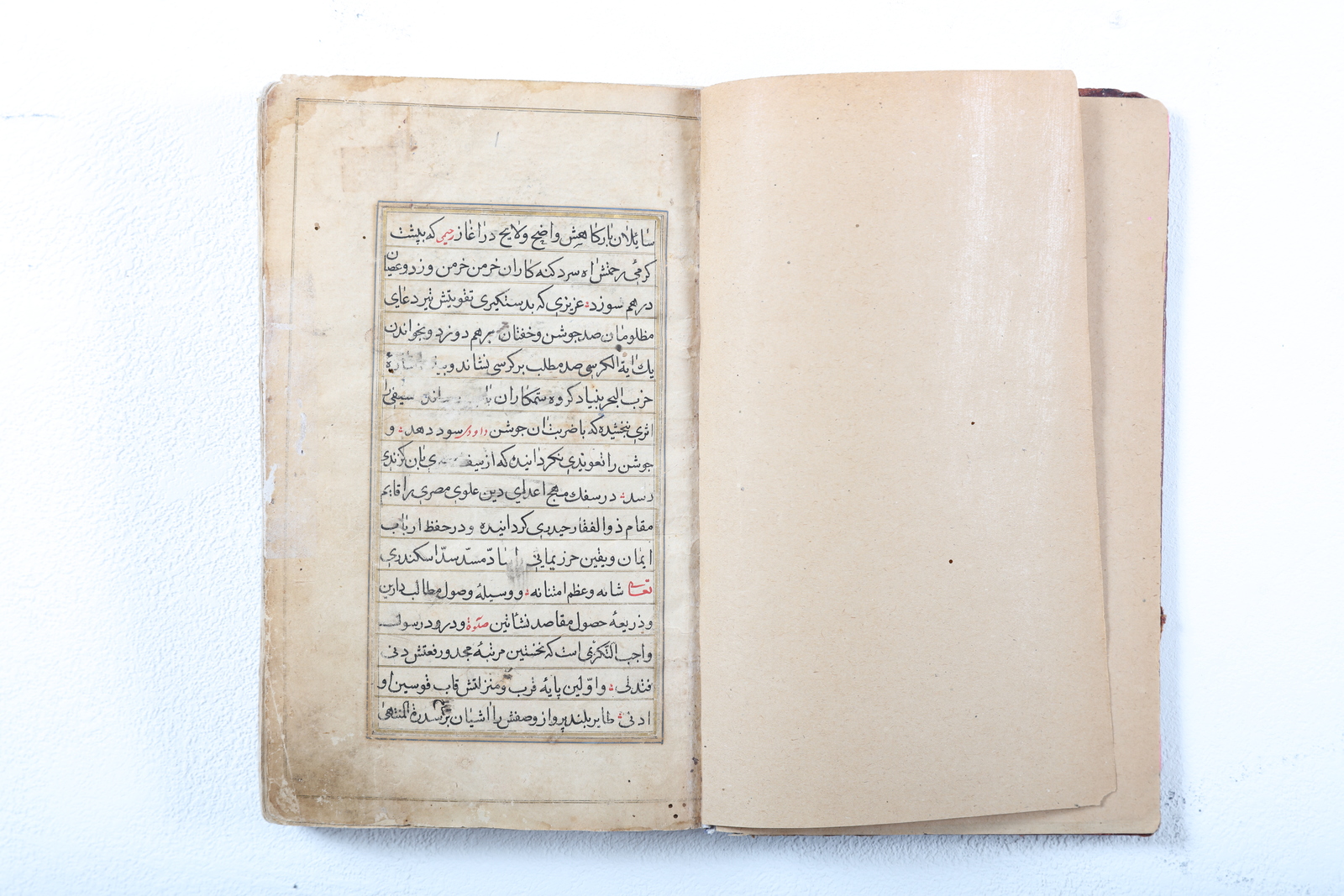 Iran, inizio XIX secolo . -. Cm 12,00 x 20,00. Manoscritto in persiano su carta. Dimensioni del foglio: 19,5 X 11,5 cm, dimensioni dello specchio di scrittura: 14 X 7,5 cm. Testo in inchiostro nero e rosso scritto in calligrafia Nastaliq su singola colonna contenente 16 linee separate da righe dorate ed inquadrate in filetto dorato. Note a margine del testo. Rilegatura in pelle scura in parte danneggiata.