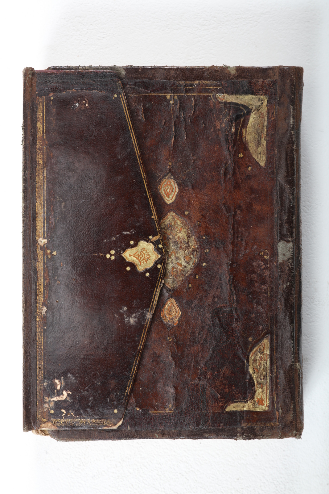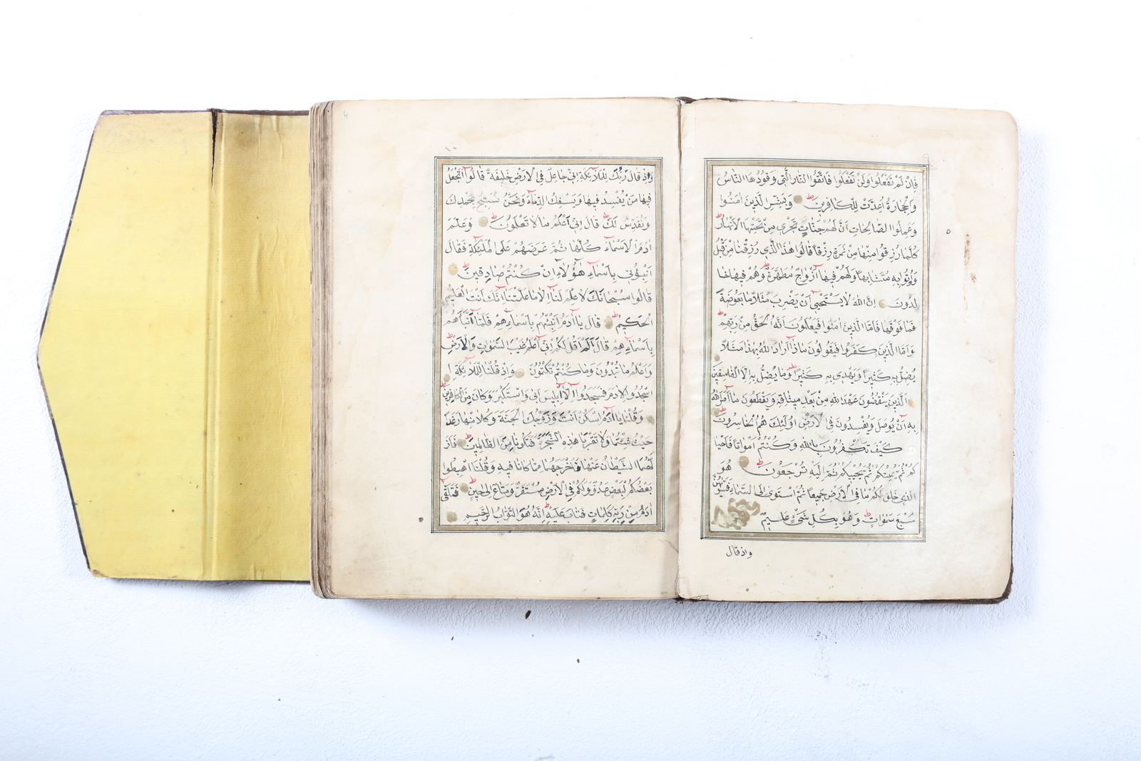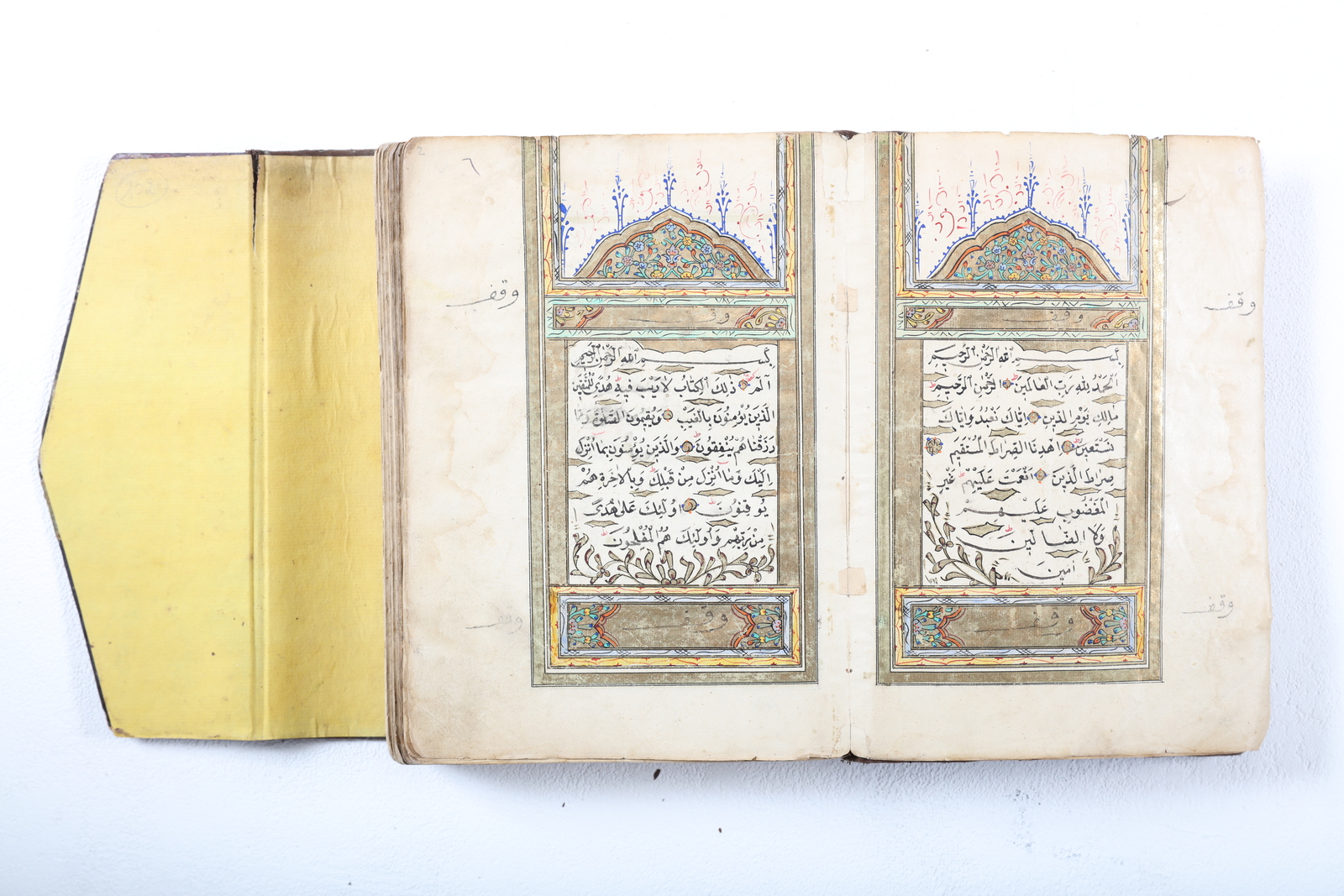 Text written in Naskh script in a single column of 14 lines, with black ink and the titles of the surahs in red. Totaling 465 leaves, complete. The decorations include a double title page illuminated in gold and colors. All other leaves are framed by a triple decorative line in black, except for leaf 90 where it is in black and gold. Back binding in leather with fold, decorated with dry tooling, signed by Muhammed Uthman Sahaf, imprinted on the fold.