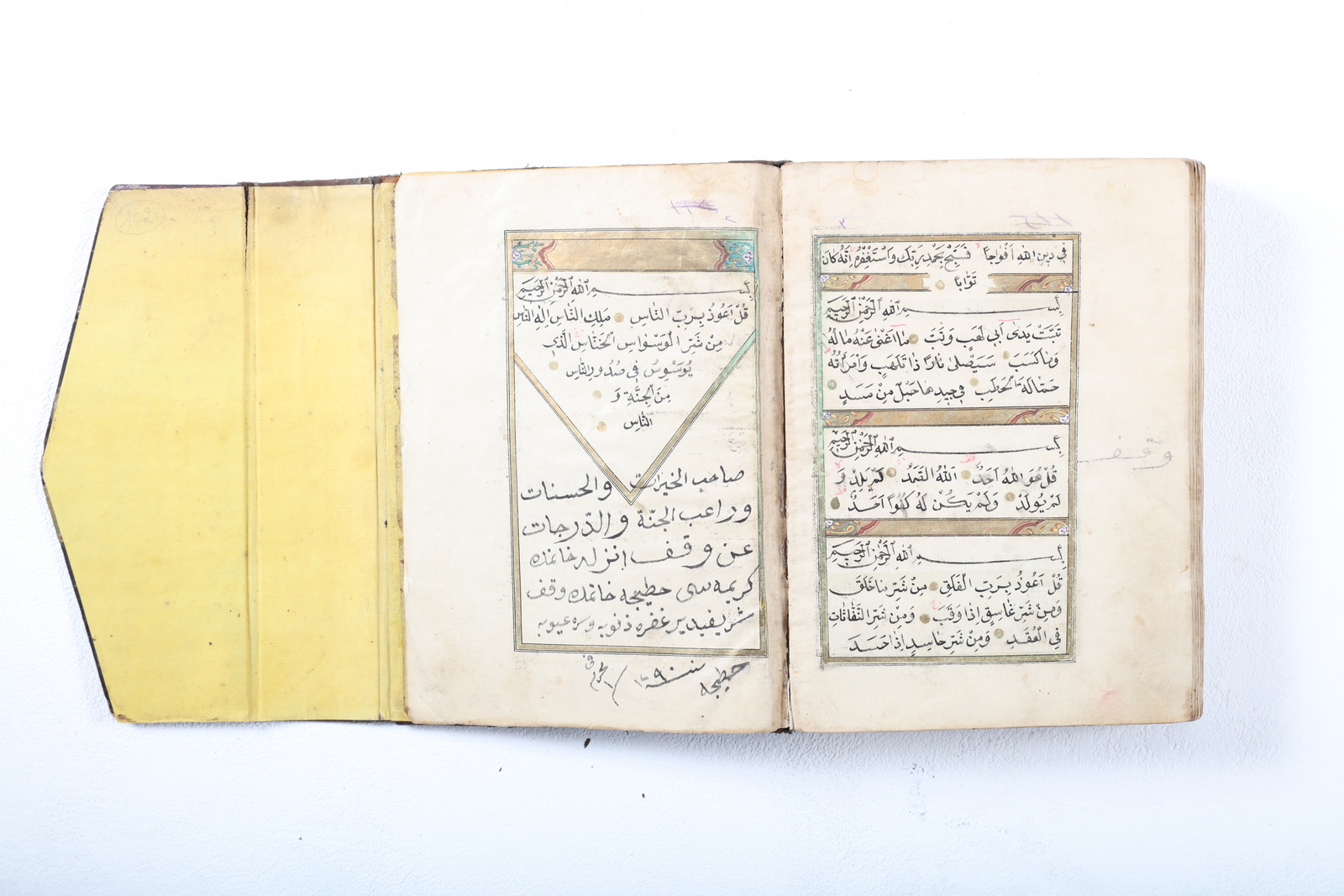 Probabilmente Turchia Ottomana, datato 1090 AH (1669 AD). . Cm 12,00 x 18,00. Manoscritto su carta in arabo, dimensioni del foglio 210 X 150 mm, specchio di scrittura 156 X 92 mm contenente testo in calligrafia Naskh in inchiostro nero con indicatori testuali dorati su singola colonna delimitata da triplo filetto nero e dorato. La decorazione comprende un doppio frontespizio (sarlaw) miniato in oro e colori. composto da 305 carte rilegato in pelle con ribalta, decorata con impressioni floreali a secco laccati e dorati. Una scritta fuori margine nell'ultima pagina lo data: mese di muharram 1090 AH (1669 AD).