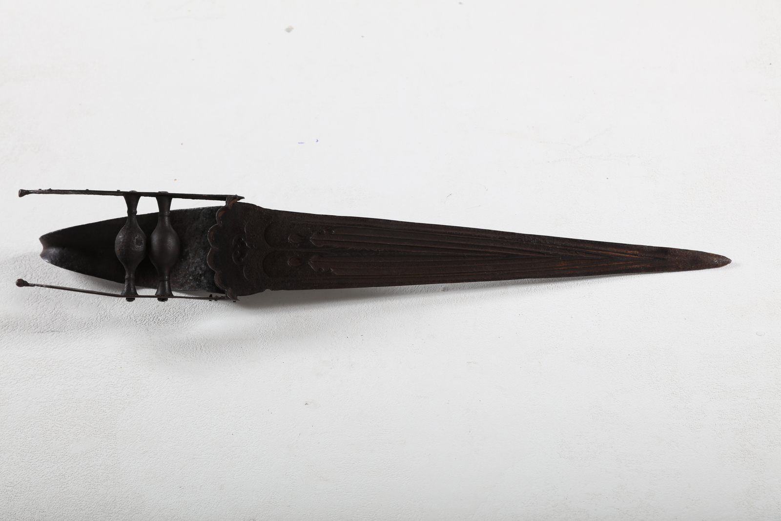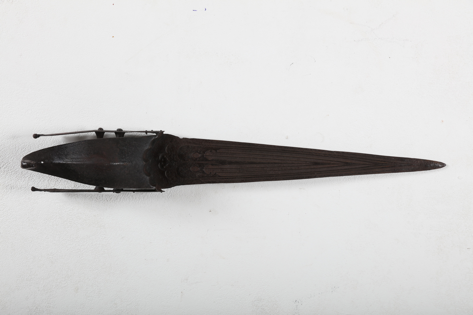 India, Deccan, XVII - XVIII secolo . -. Cm 7,00 x 51,00. Tipico pugnale a spinta indiano con lama triangolare a doppio taglio decorata con nervature in rilievo su ambo i lati ed impugnatura a forma di H fornita di guarda mano.