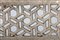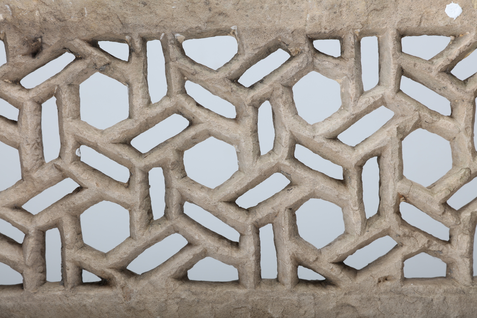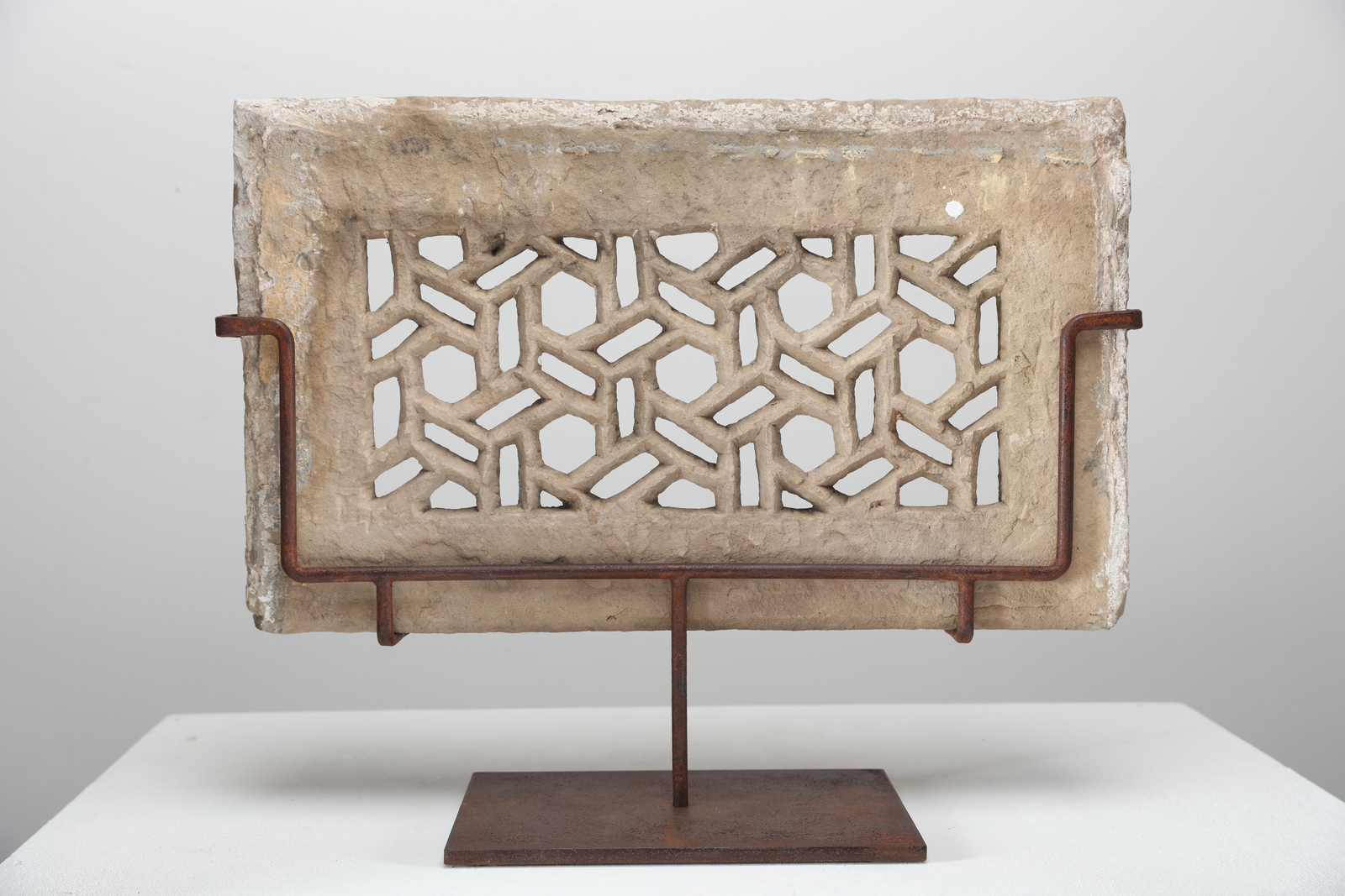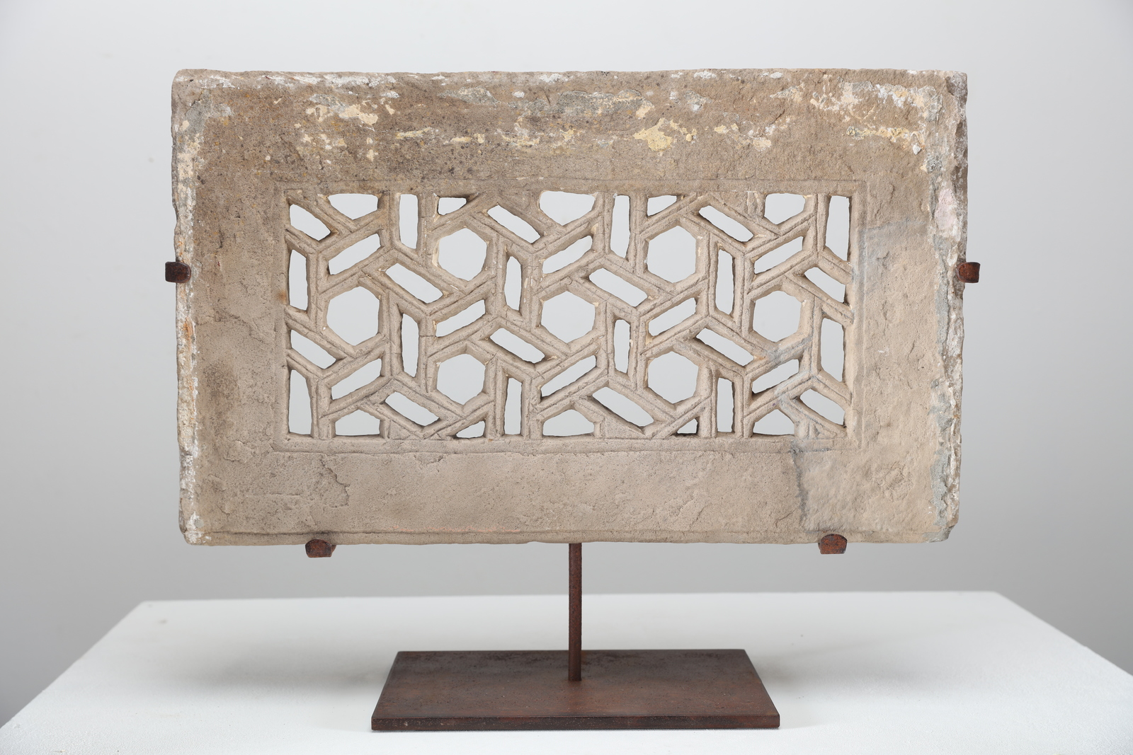 India, Rajasthan, XVIII secolo . -. Cm 60,00 x 36,00. Pannello in pietra lavorato a traforo a formare figure geometriche intersecate in cui di distinguono esagoni e parallelepipedi entro cornice.