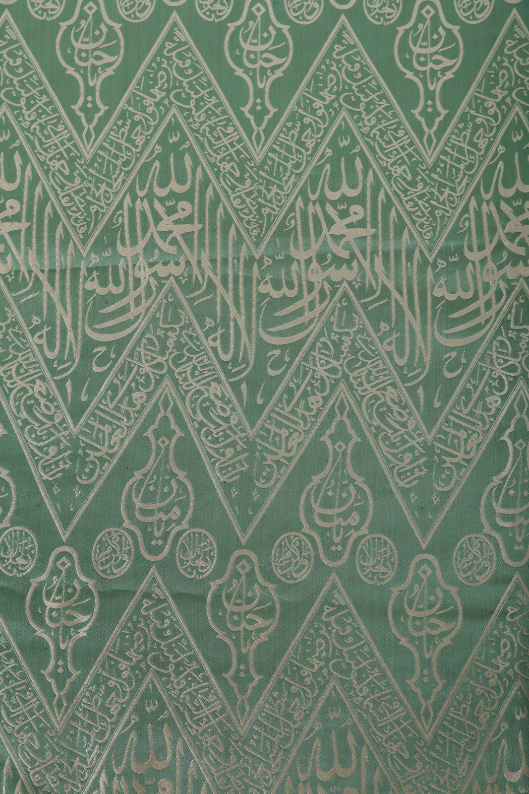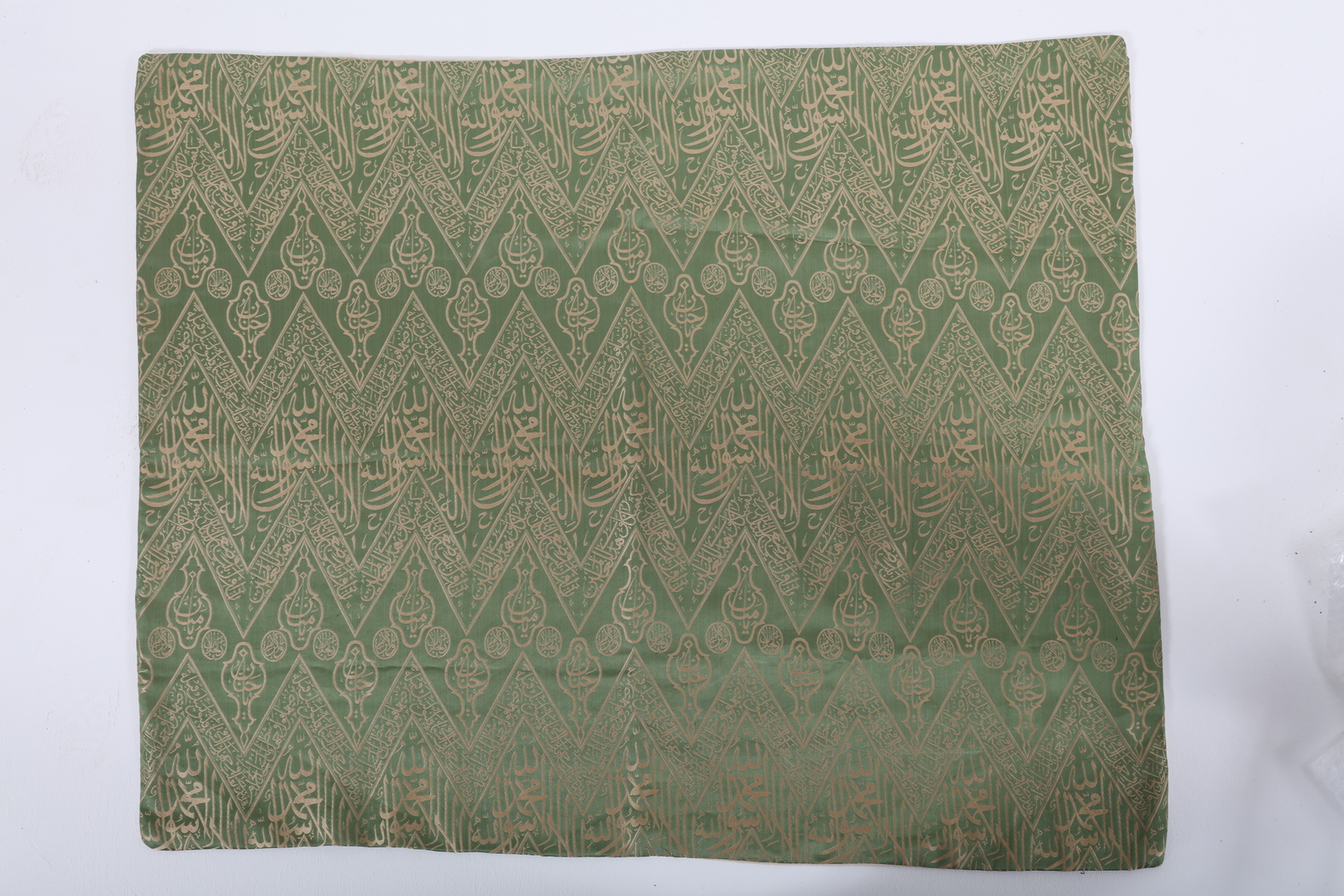 ARTE ISLAMICA Tessuto in lampasso di seta su fondo verde con iscrizioni religiose Turchia, dinastia Ottomana, tardo XIX secolo. . Cm 66,00 x 83,00. Lo sfondo in seta verde intessuto con chevron di ampiezza alternata contenenti calligrafia con significato religioso.