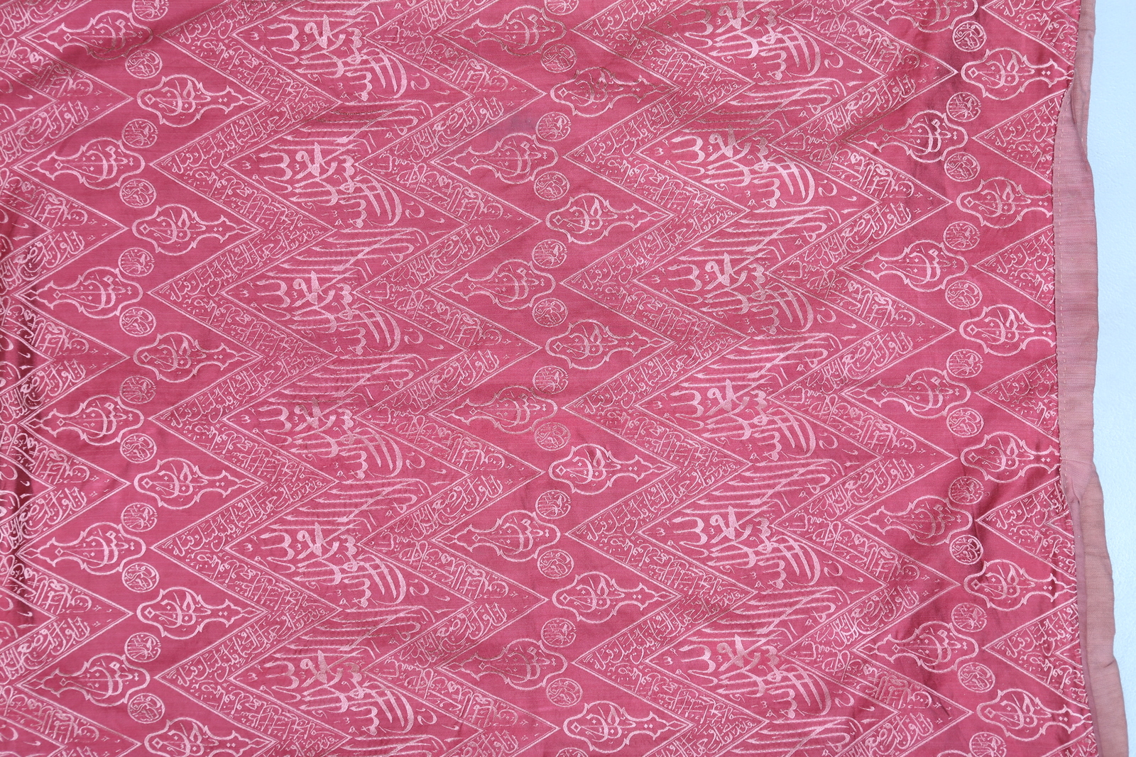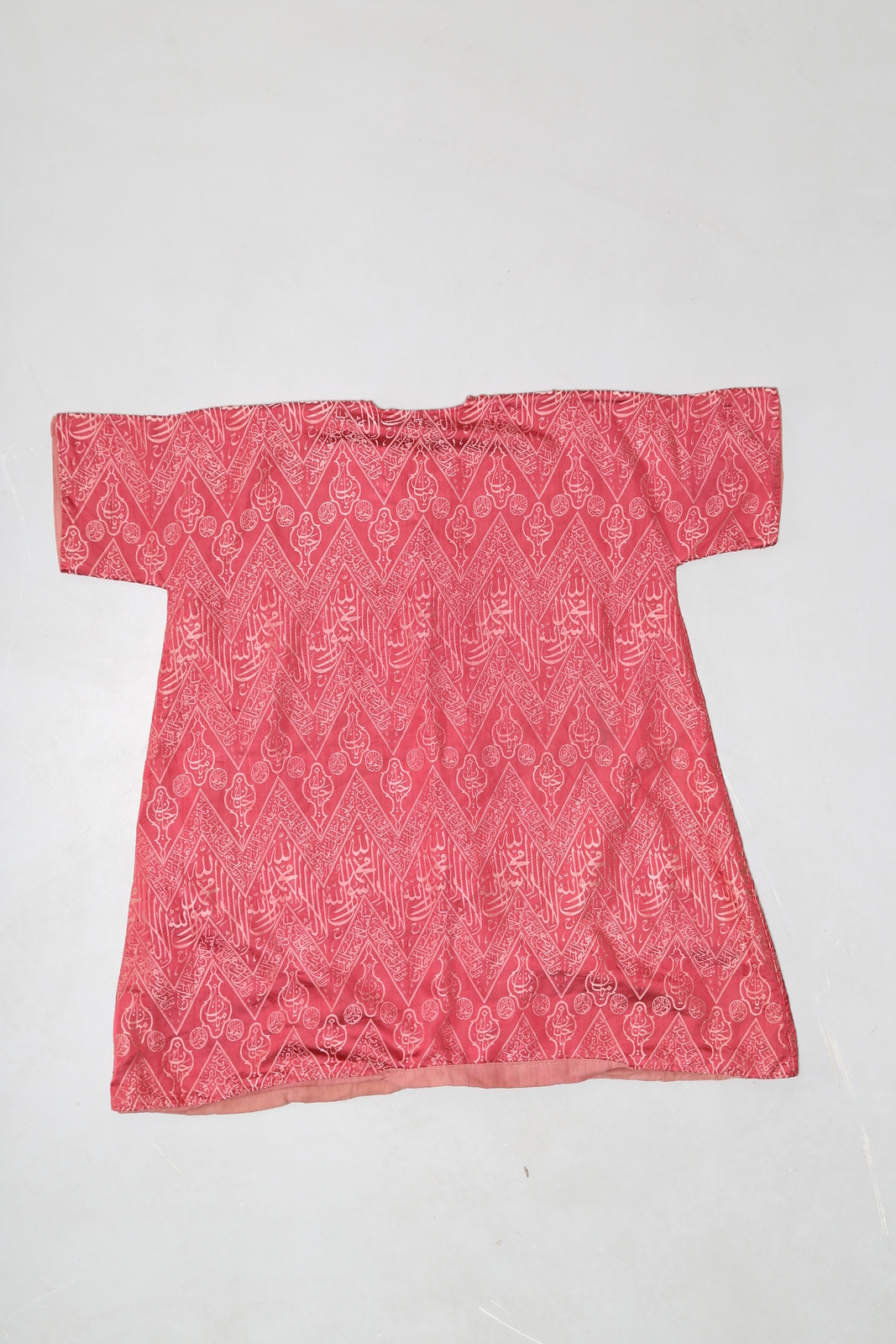 ARTE ISLAMICA Veste in lampasso di seta su fondo rosso decorata con iscrizioni religiose