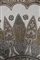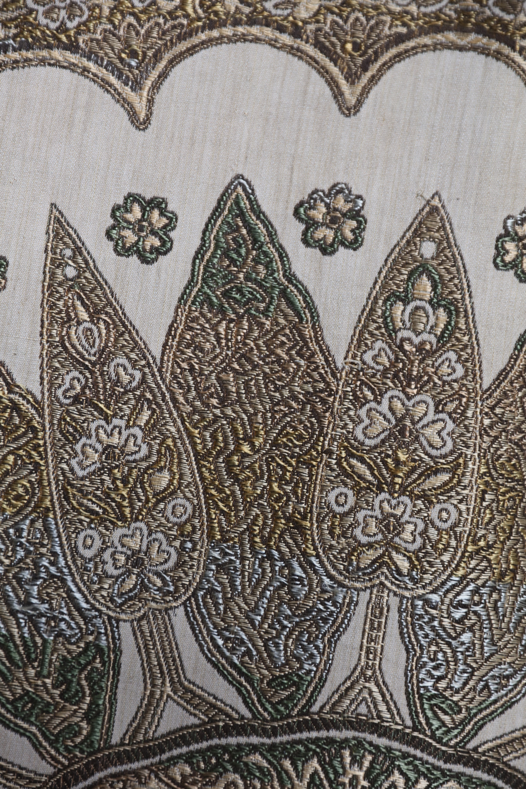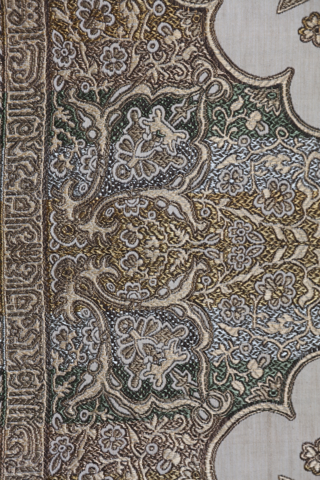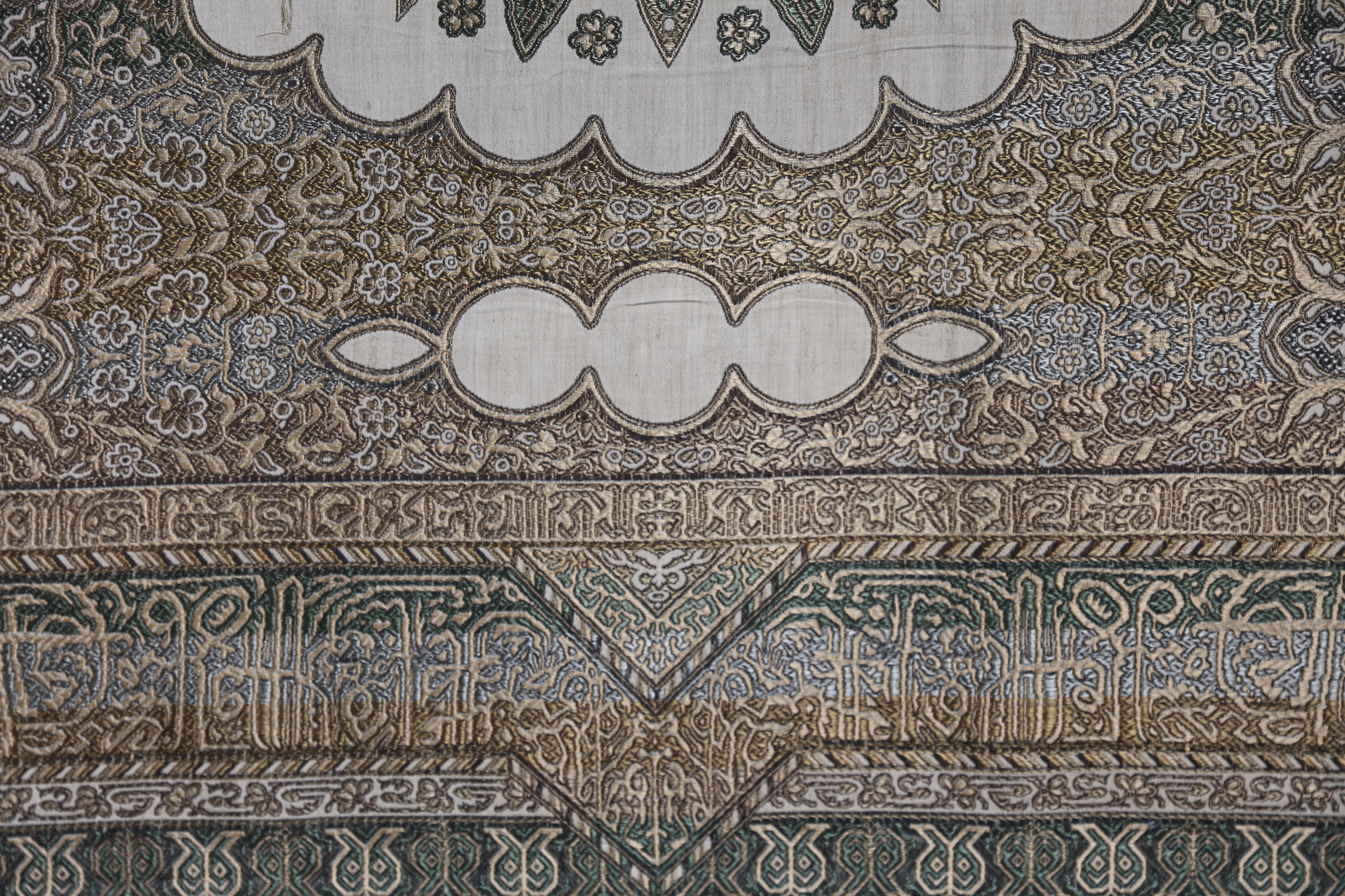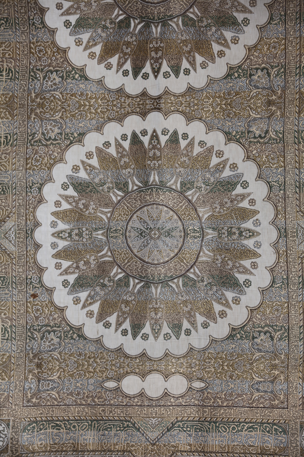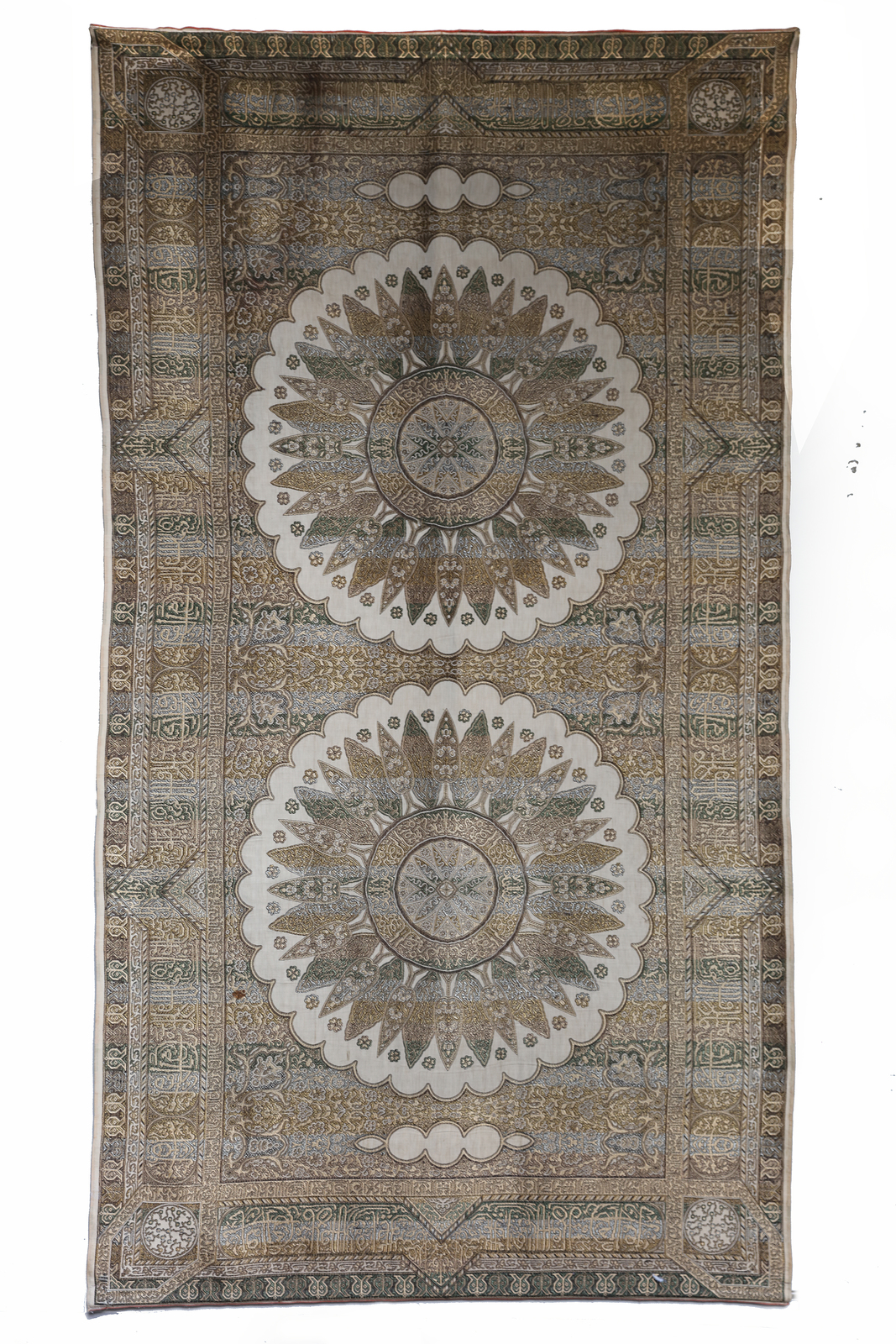 Vicino Oriente, tardo XIX secolo . -. Cm 142,00 x 258,00. Imponente tessuto ricamato con due rosoni centrali composti da figure simili a cipressi contenenti alternatamente iscrizioni e motivi vegetali, disposti a raggiera intorno al centro definito da una circonferenza ricamata ancora con versi coranici, il tutto su uno sfondo intessuto con fitti arabeschi intrecciati. Le zone più marginali sono definite da più cornici concentriche: la più ampia contiene iscrizioni speculari ed è inquadrata in due fasce più sottili contenenti altri versetti.