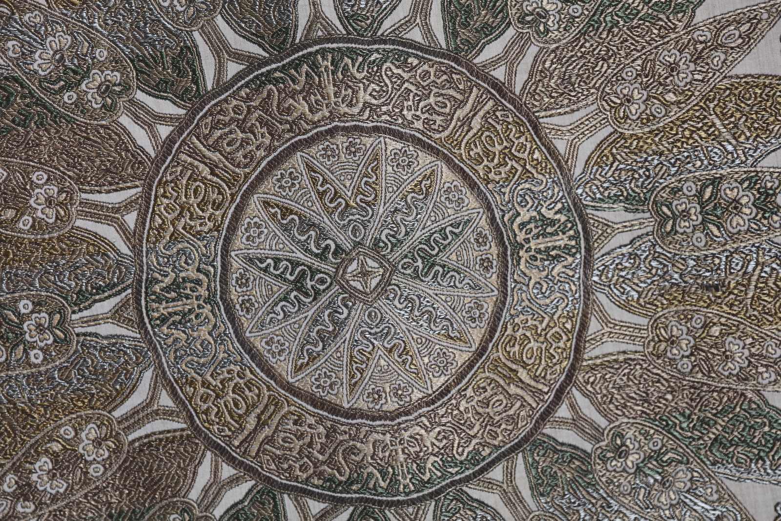 Near East, late 19th century . . Cm 142,00 x 258,00. Large embroidered textile displaying two central circles, made of figures resembling cypresses, containing inscriptions alternating with plant motifs, arranged in a radial pattern around the center, defined by a circumference embroidered with quranic verses, on a background woven with numerous interwoven arabesques. The marginal areas are enclosed by various concentric frames: the biggest includes specular inscriptions and is adorned by two thinner bands containing more verses.