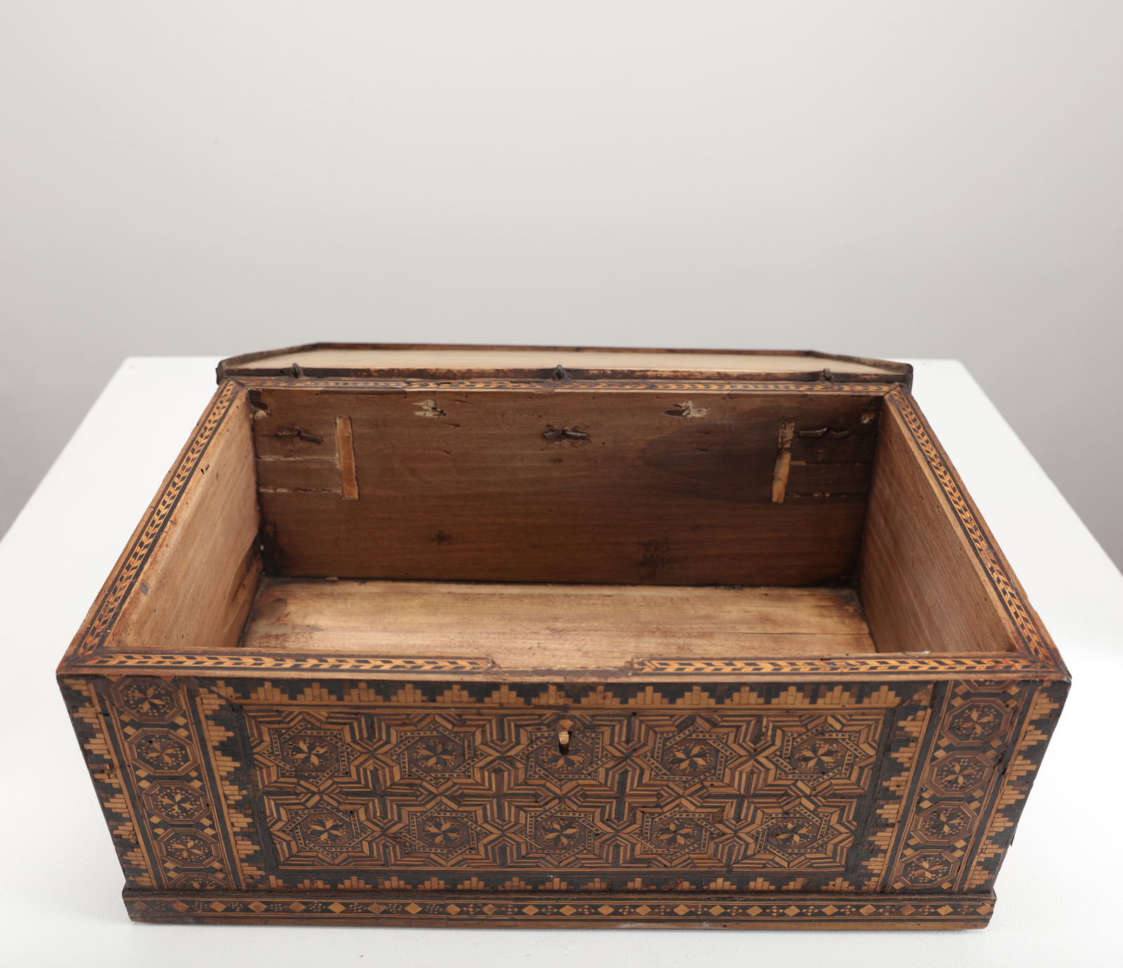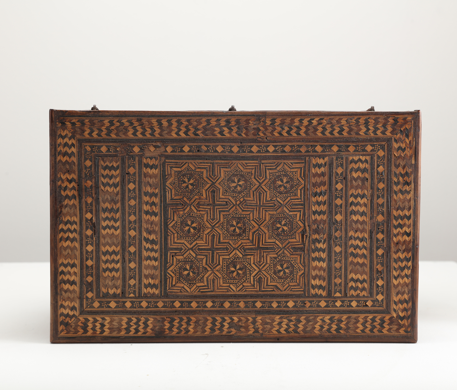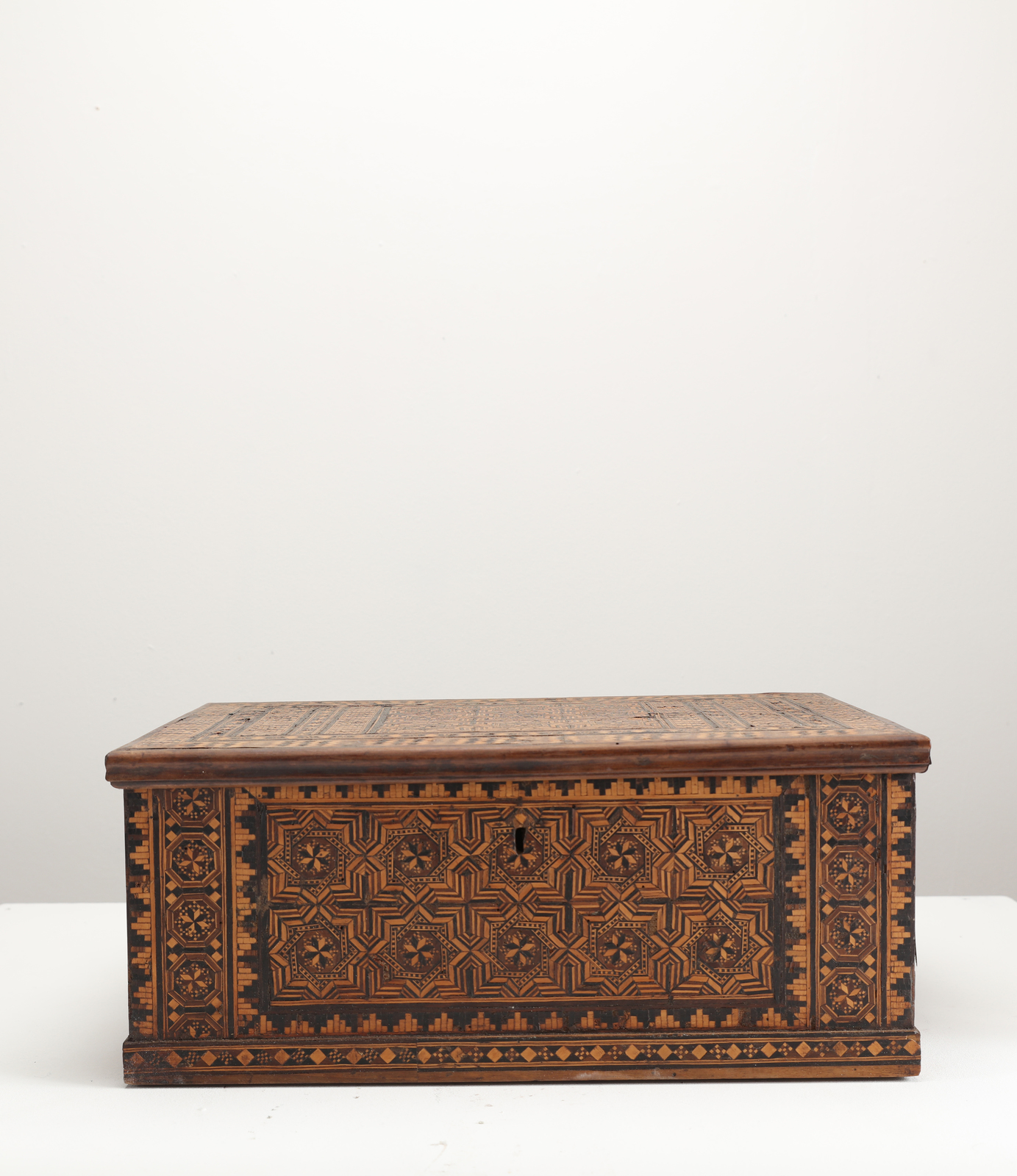 Egitto o Siria, XVII secolo . -. Cm 47,00 x 19,50 x 29,90. Di forma rettangolare, il coperchio incernierato ed il corpo decorato con piccoli tasselli di legni diversi a formare una decorazione con stelle di lazo ad otto punte poste in sequenza ed incorniciate da greche geometriche.