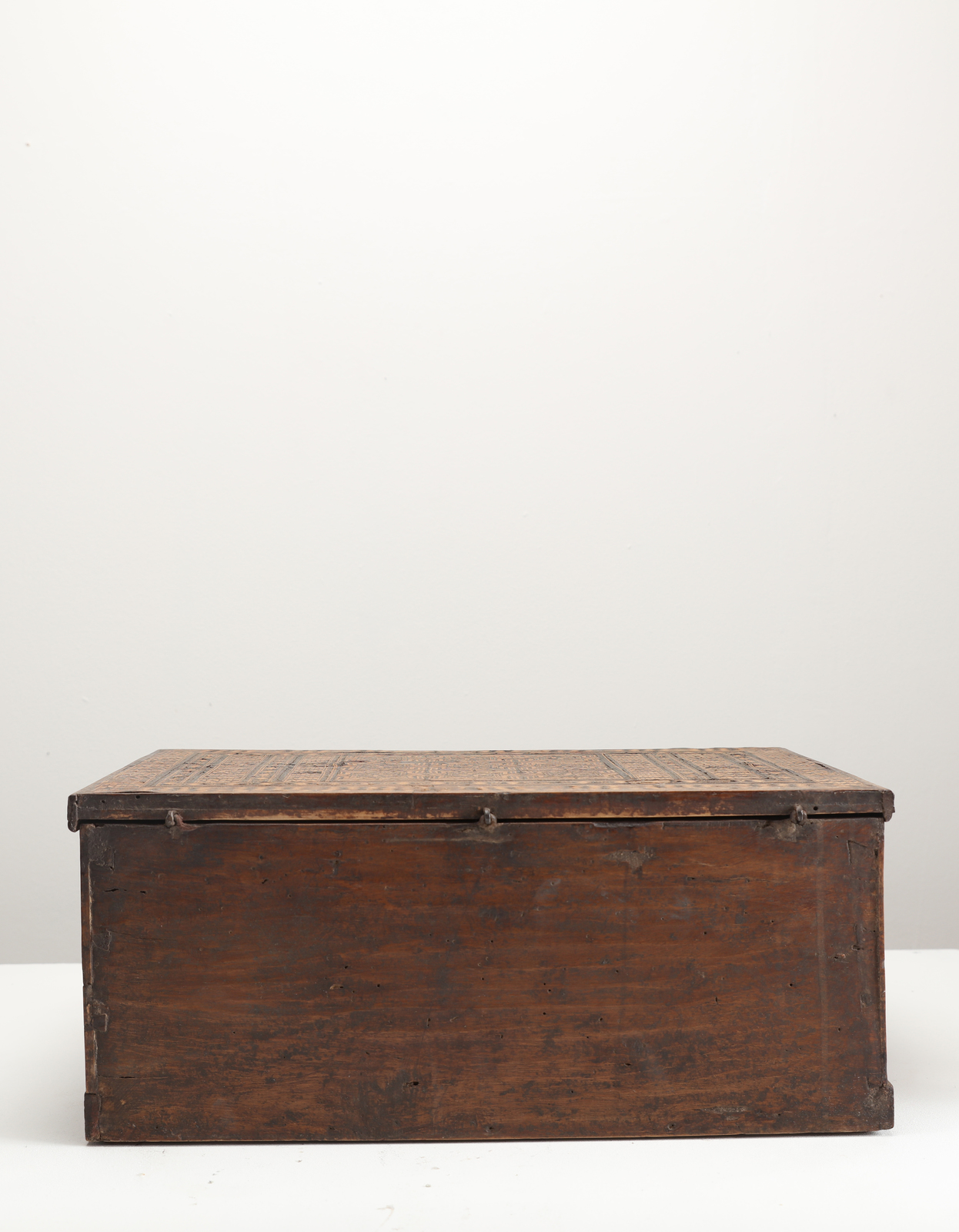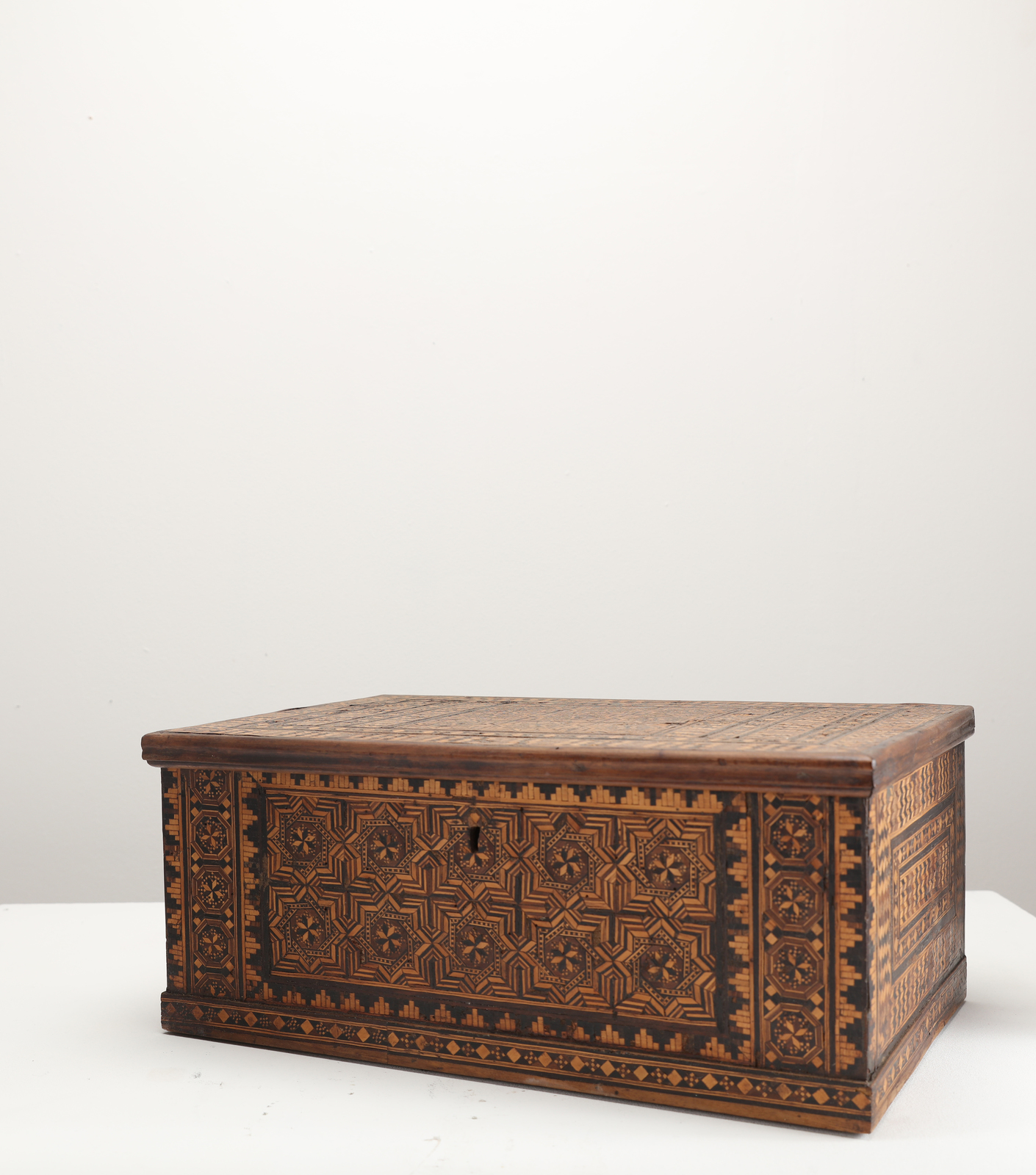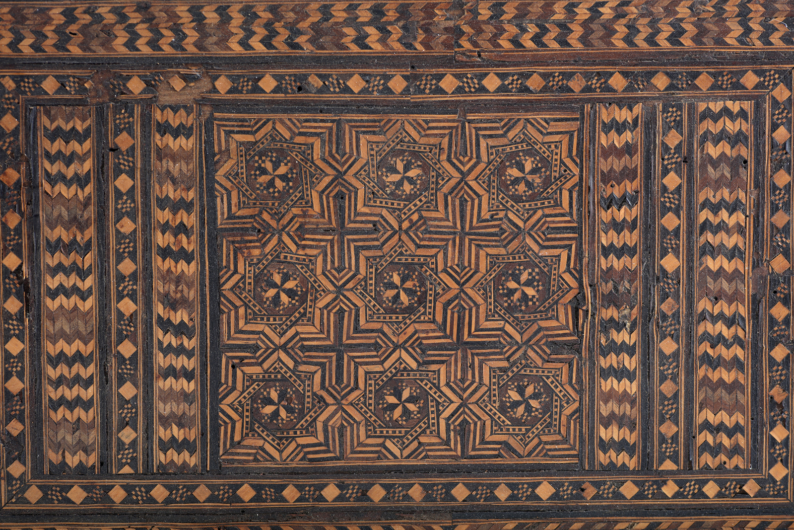 Egitto o Siria, XVII secolo . -. Cm 47,00 x 19,50 x 29,90. Di forma rettangolare, il coperchio incernierato ed il corpo decorato con piccoli tasselli di legni diversi a formare una decorazione con stelle di lazo ad otto punte poste in sequenza ed incorniciate da greche geometriche.