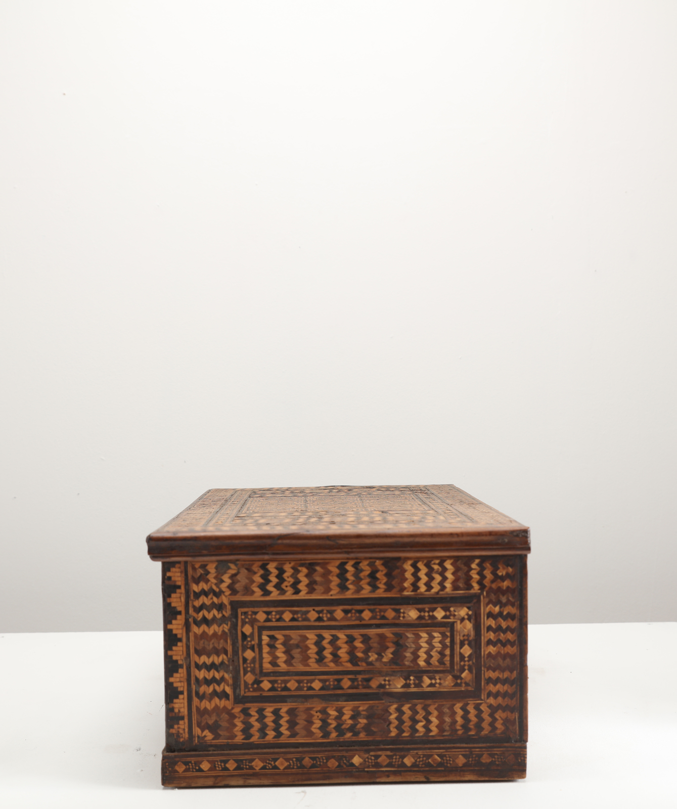 Arte Islamica Piccolo baule rettangolare in legno intarsiato con ebano e legni diversi