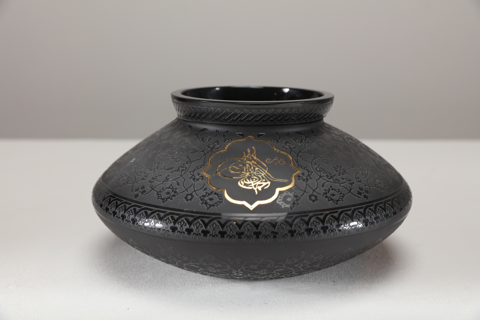Arte Islamica Ciotola in vetro satinato decorata con arabeschi e pseudo Tughra con dedica in inglese e in arabo